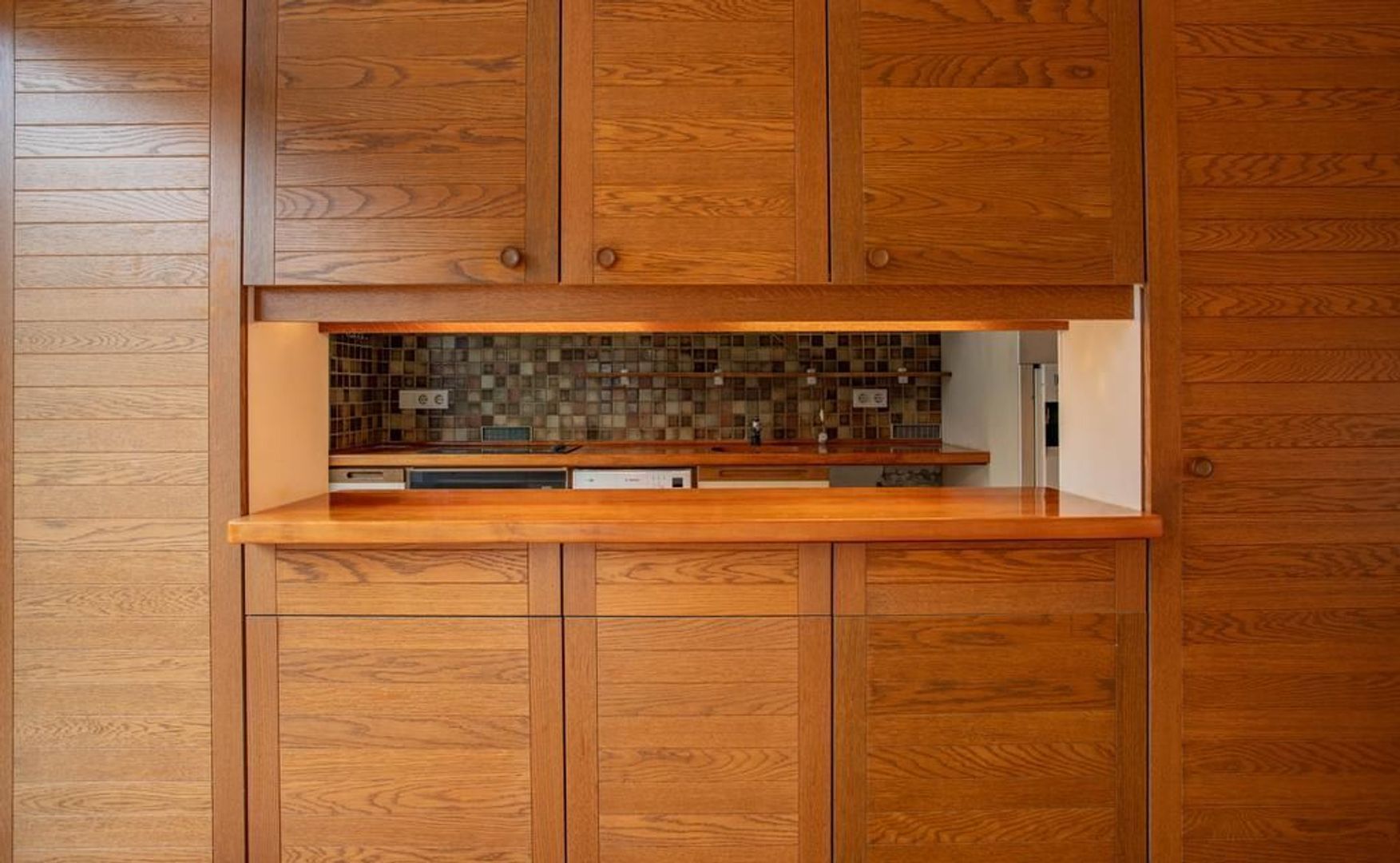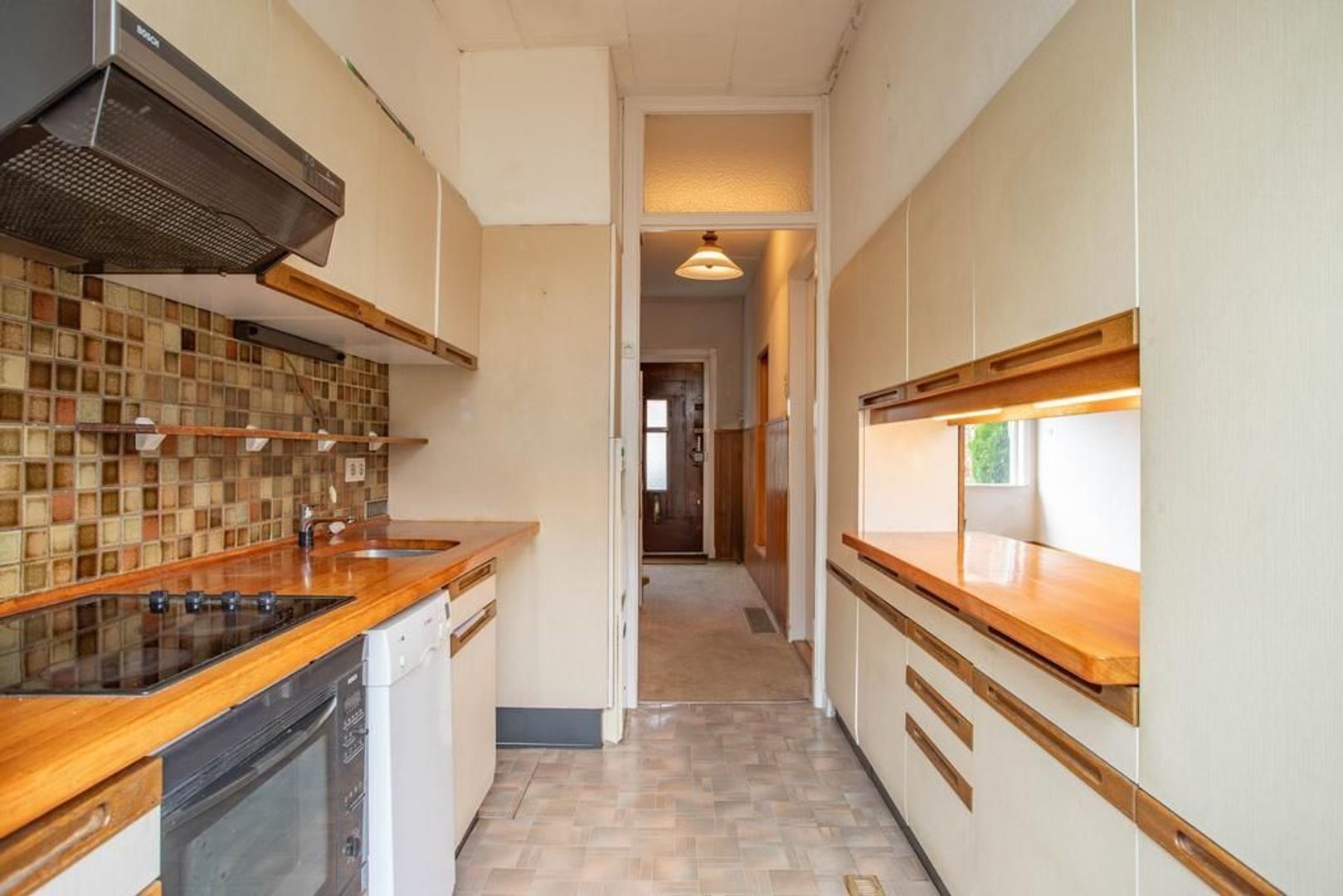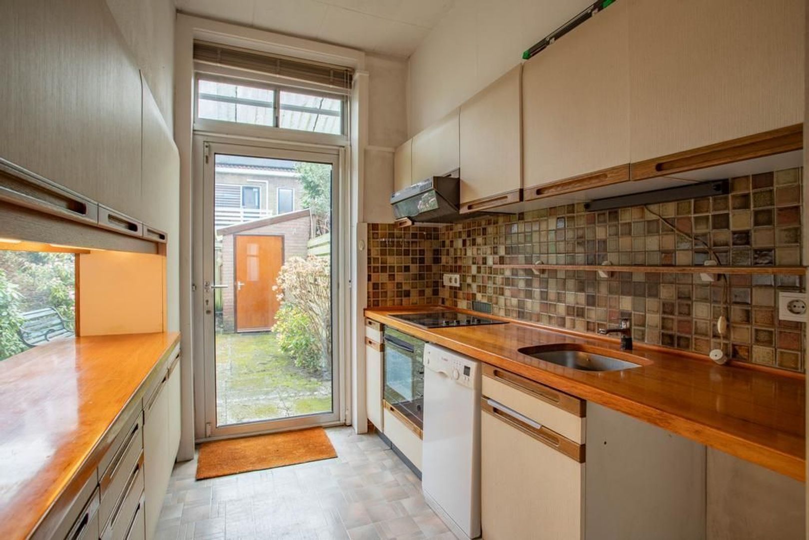 Naast de woonkamer, aan de achterzijde van de woning, is de dichte keuken gelegen. Doormiddel van een opening in muur, tussen de keuken en de woonkamer, zijn de twee ruimtes toch met elkaar verbonden. De keuken is voorzien van inbouwapparatuur, maar heeft een gedateerde staat.