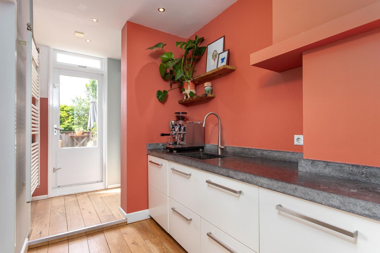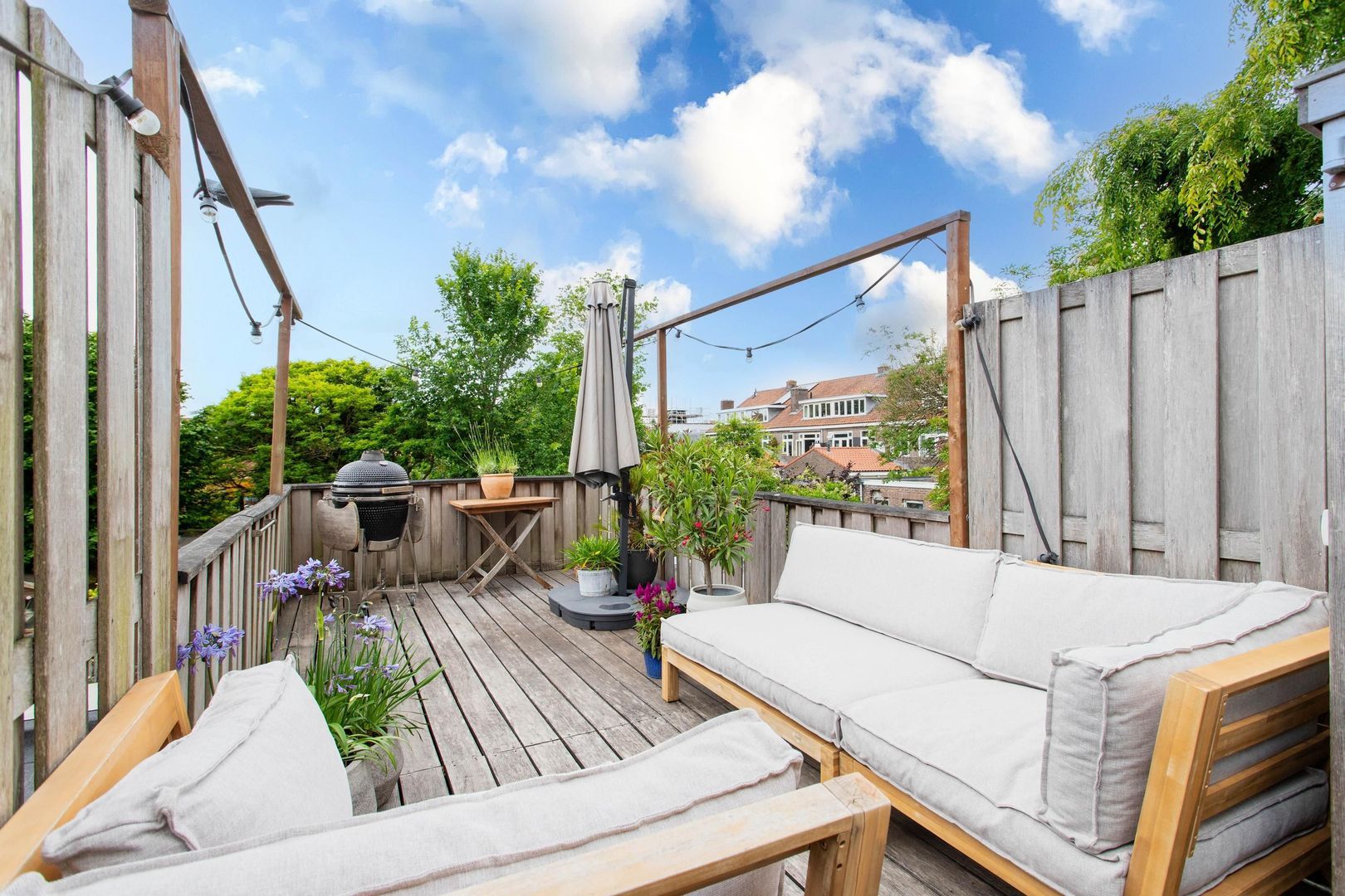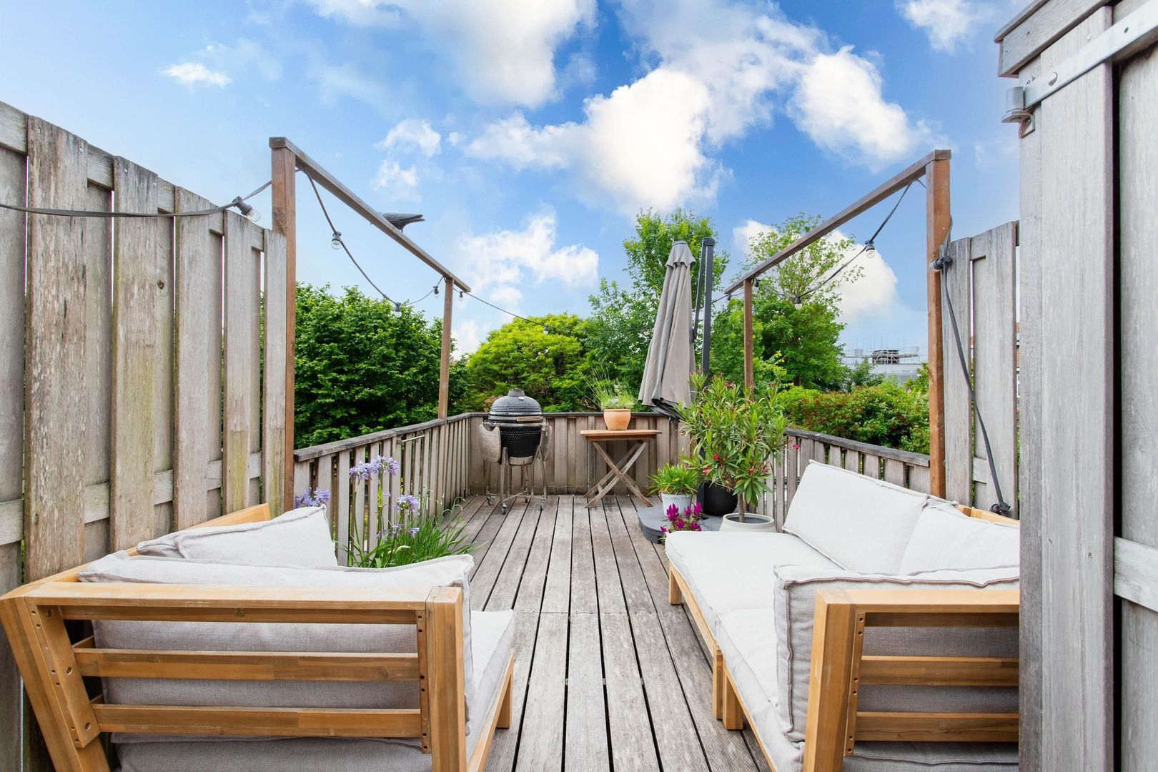 Vanuit de keuken bereik je het ruime en fraai gelegen dakterras. Het sfeervolle dakterras doet qua formaat bijna niet onder voor de gemiddelde stadstuin maar heeft daarentegen aanzienlijk meer zon, mede dankzij de zuidwestelijke ligging. Daarnaast is er een hoge mate van privacy en fraai uitzicht op groen.