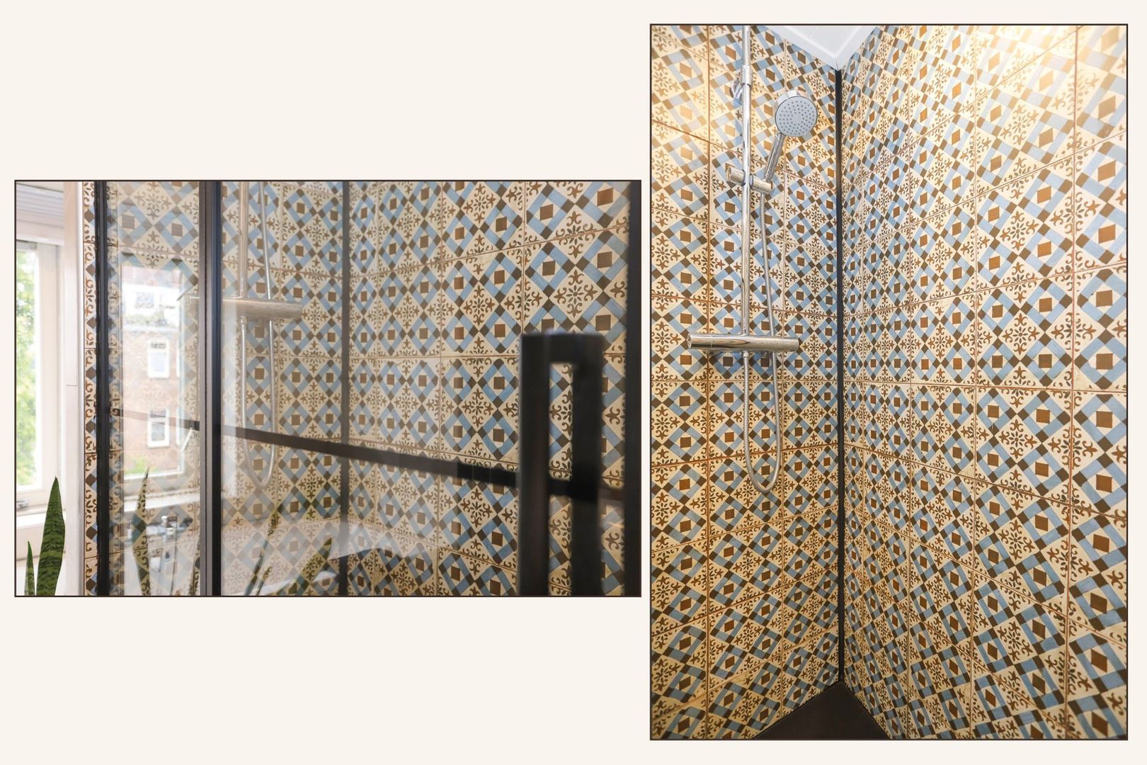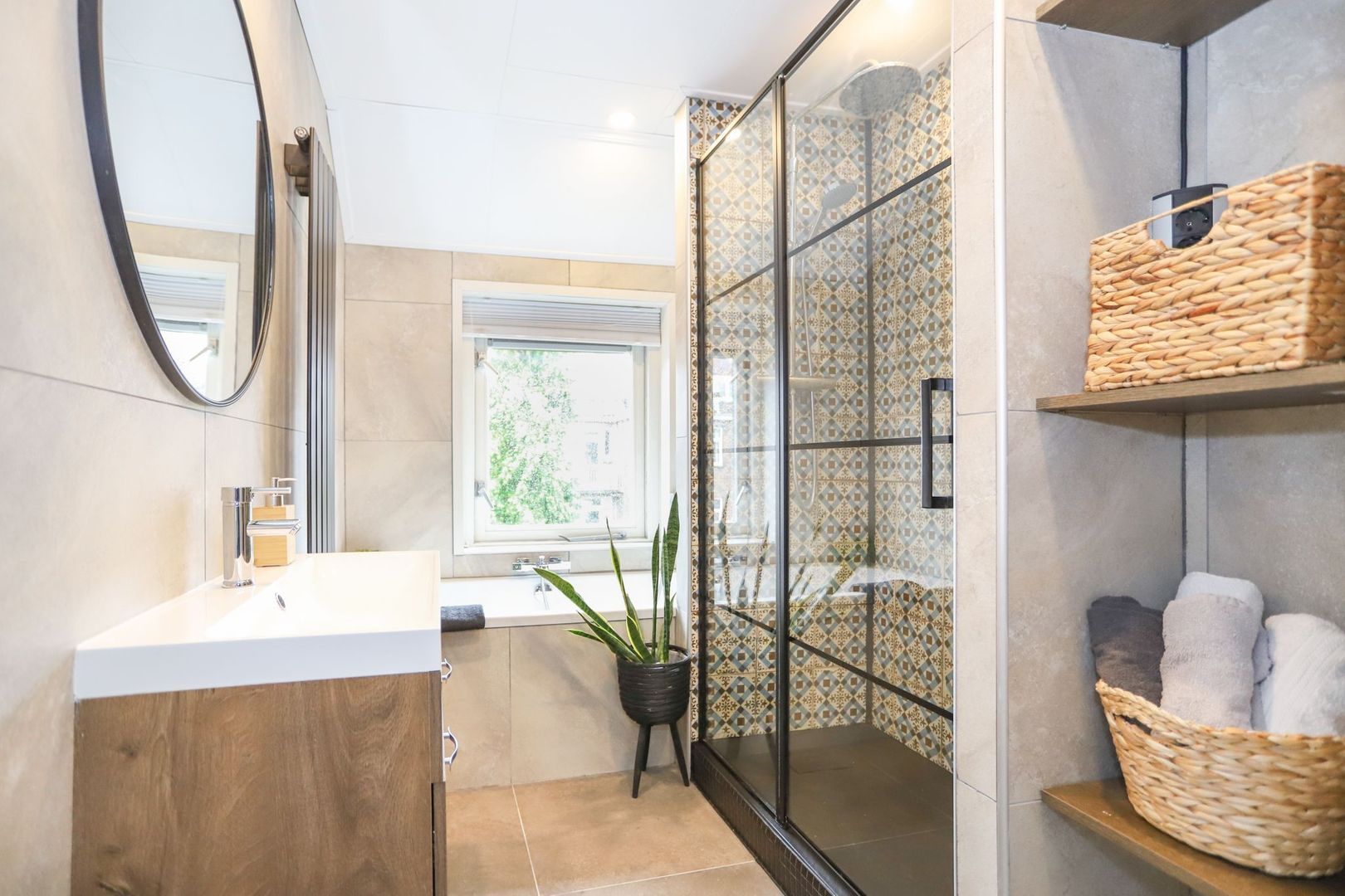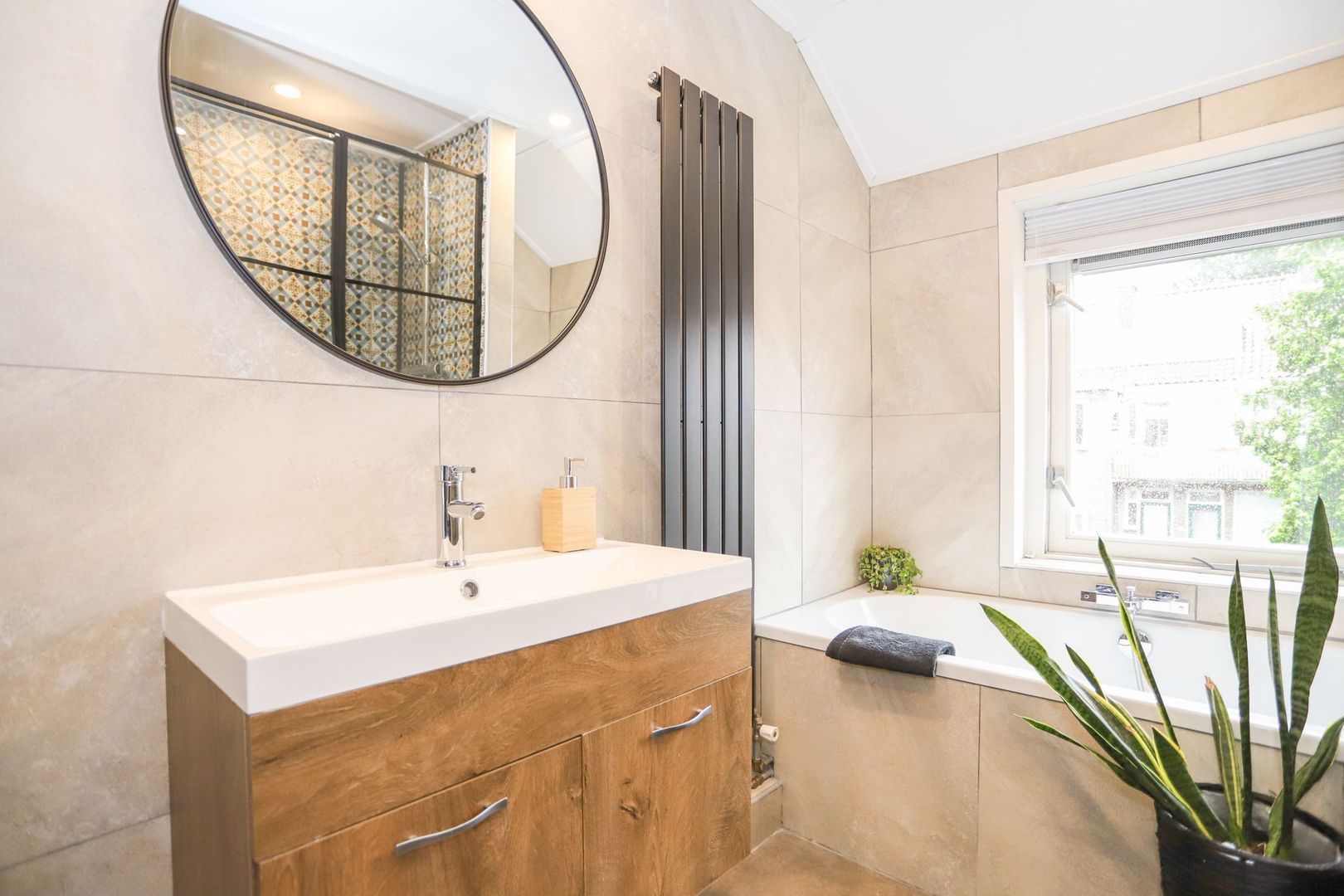 De badkamer (2020) is uitgevoerd met tegelwerk en voorzien van een ligbad, douche (2023), wastafel met meubel en een design radiator.