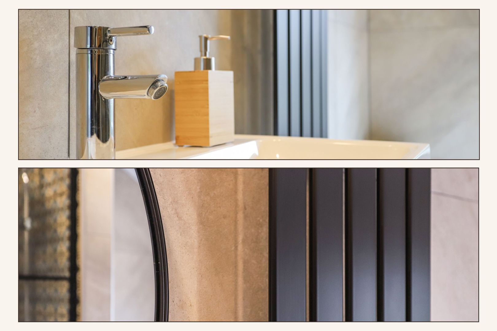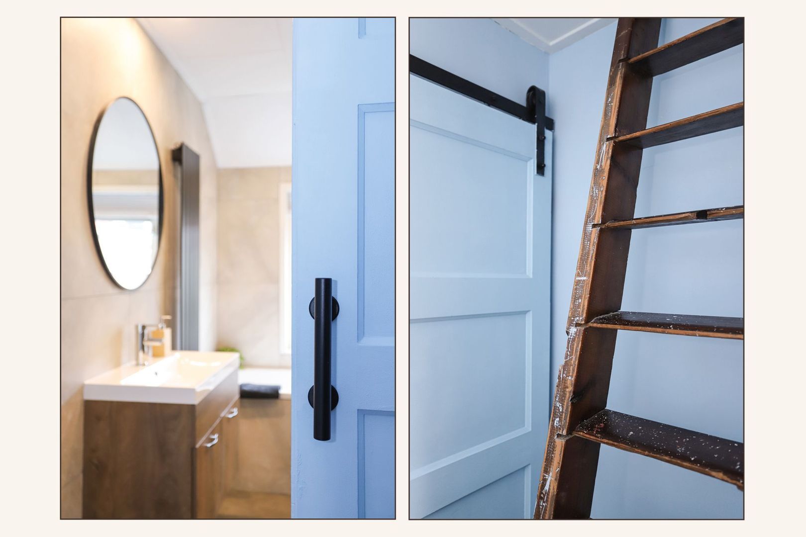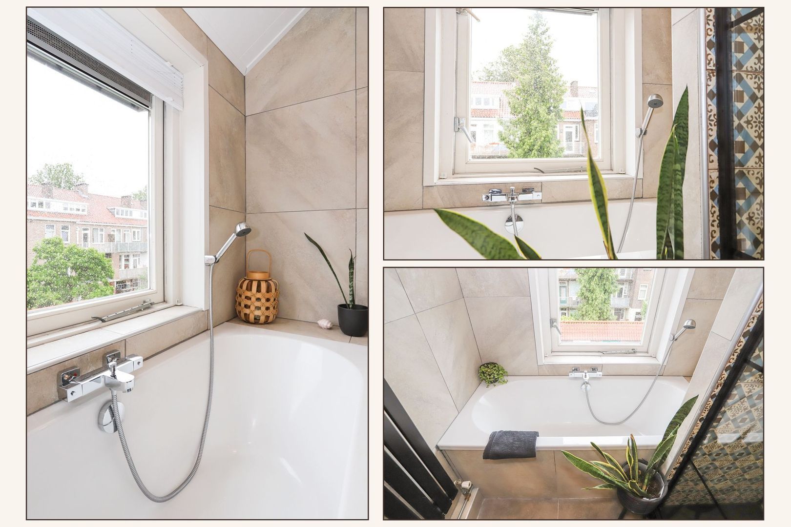 De badkamer (2020) is uitgevoerd met tegelwerk en voorzien van een ligbad, douche (2023), wastafel met meubel en een design radiator.