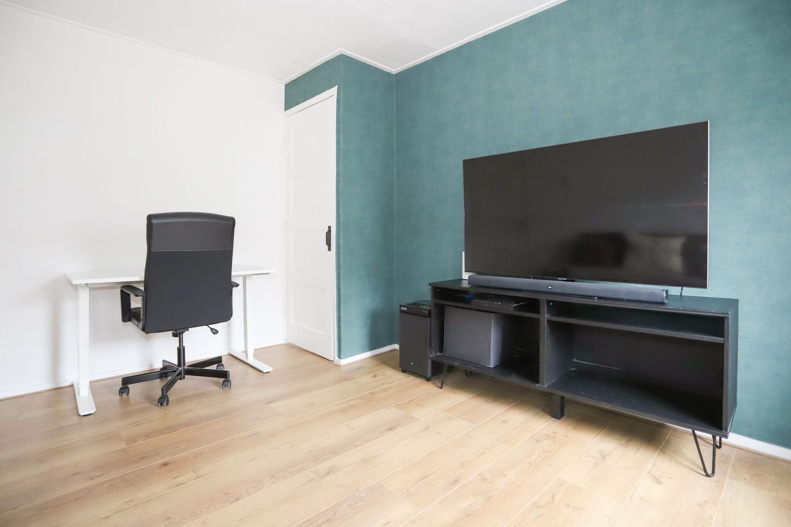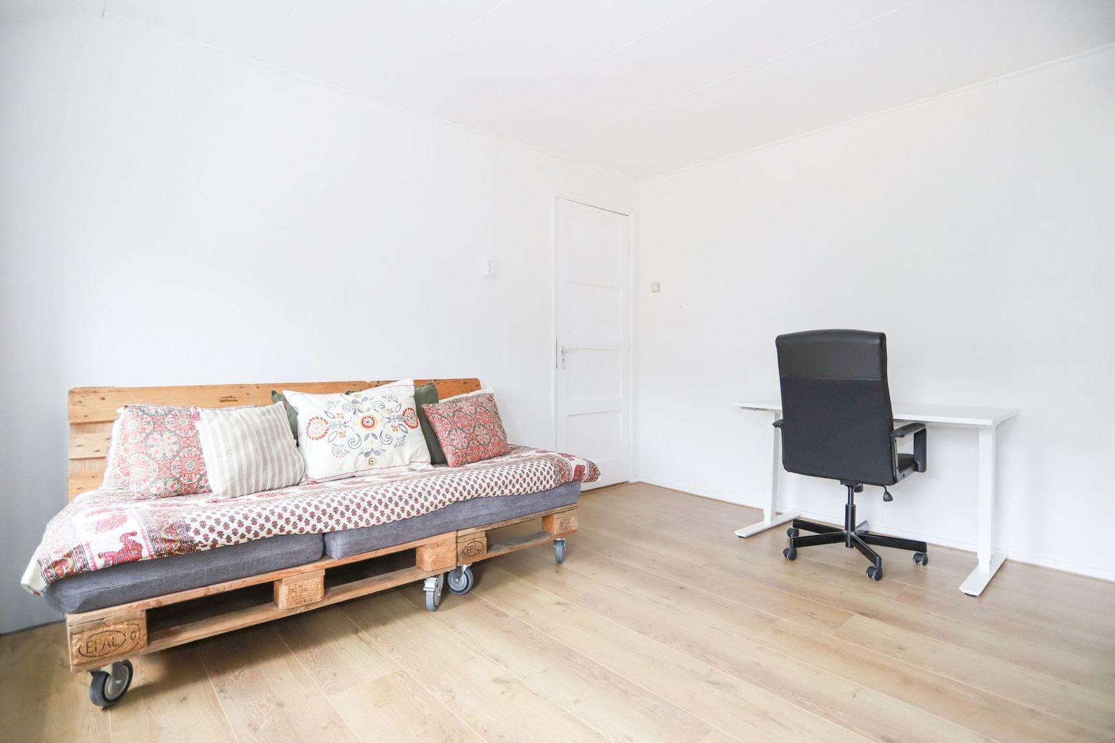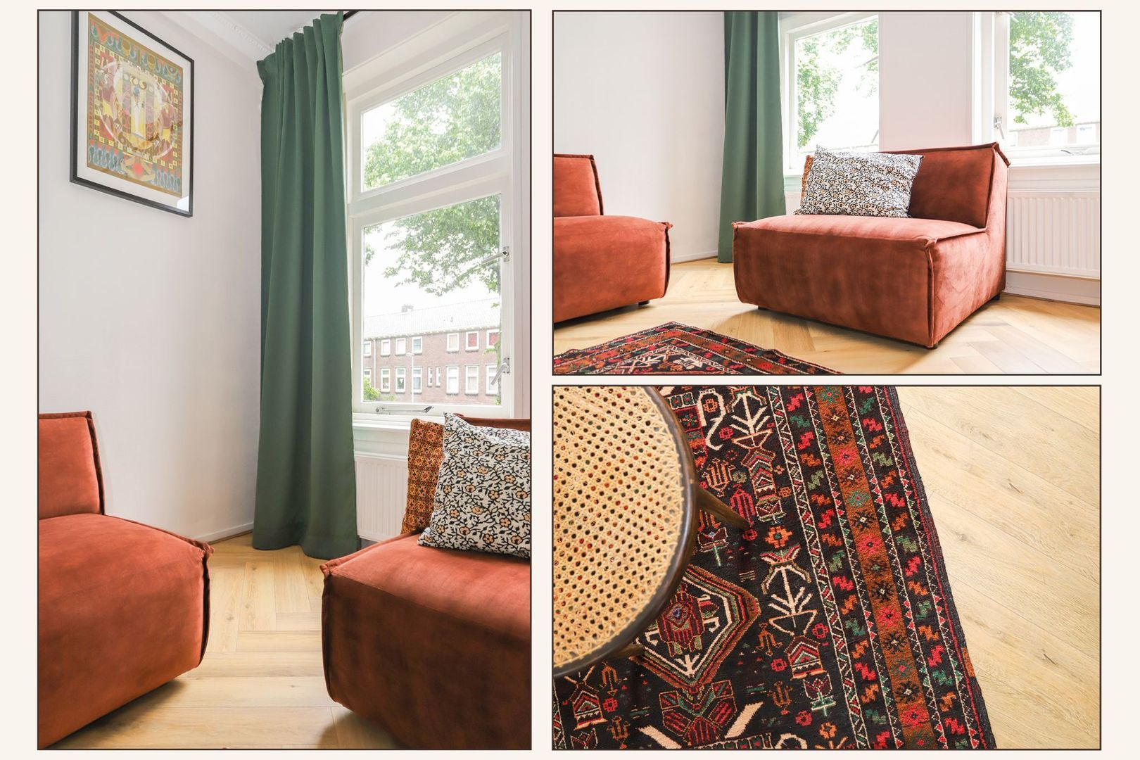 Eerste verdieping: Overloop met toilet en bergkast. De sfeervolle woon- en eetkamer voelt heerlijk ruim aan door de grote raampartijen en het hoge plafond. De ruimte is praktisch in te delen met aan de voorzijde een fijne zithoek en aan de achterzijde een gezellig eettafel. Er is een moderne visgraatvloer en nette wand afwerking aanwezig.