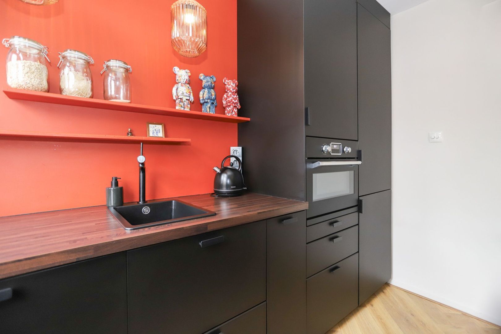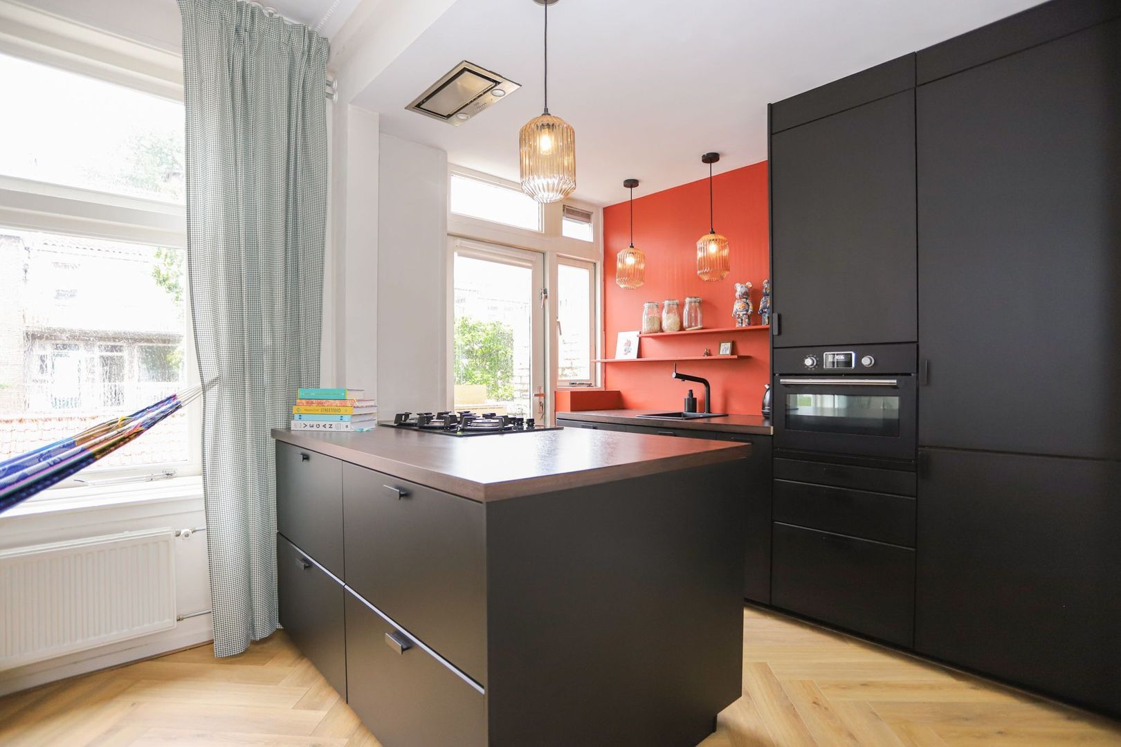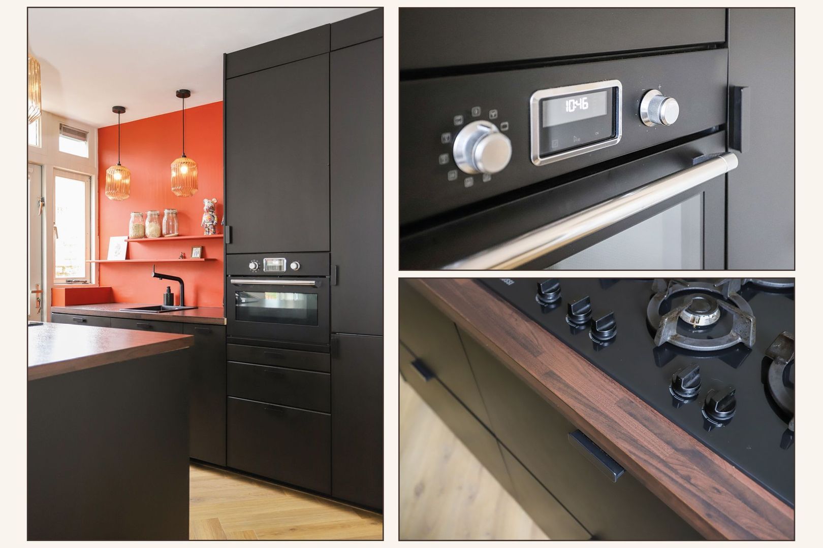 De moderne zwarte keuken (2021) is aan de achterzijde van de woning gelegen. Hier kan er heerlijk gekookt worden aan het kookeiland. Verder is er inbouwapparatuur aanwezig zoals een 5-pits, afzuigkap, combi-oven, koel-vriescombinatie en een vaatwasser. Via de keuken kom je op het balkon die gelegen is op het zuidwesten en waar je van ca. 14:00 en 20:00 uur van de zon kan genieten!