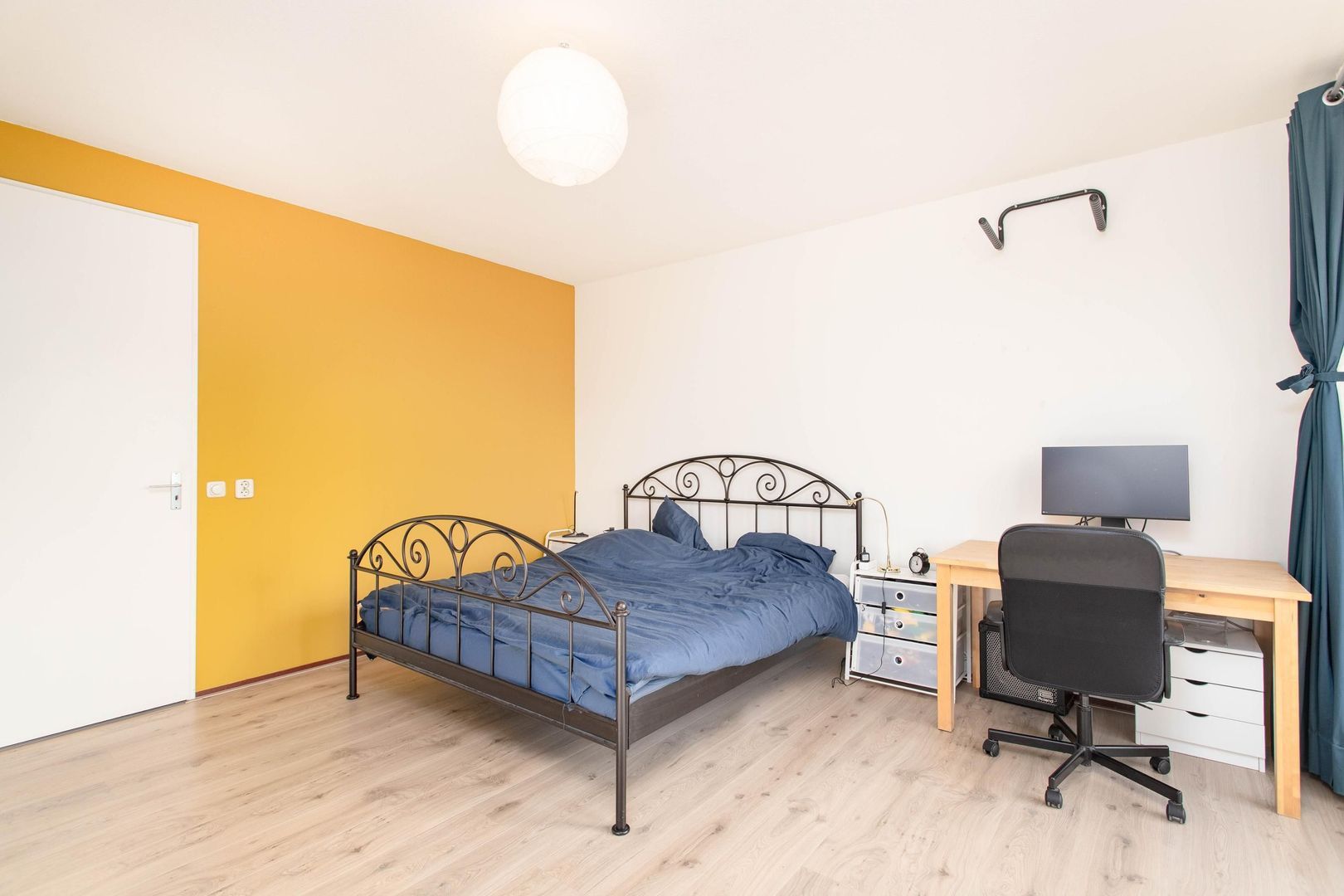 De slaapkamer is ruim opgezet en gelegen op het zuiden. Er is genoeg plek voor een groot tweepersoonsbed, een royale garderobekast en zelfs een bureau – ideaal voor wie vaak thuis werkt.