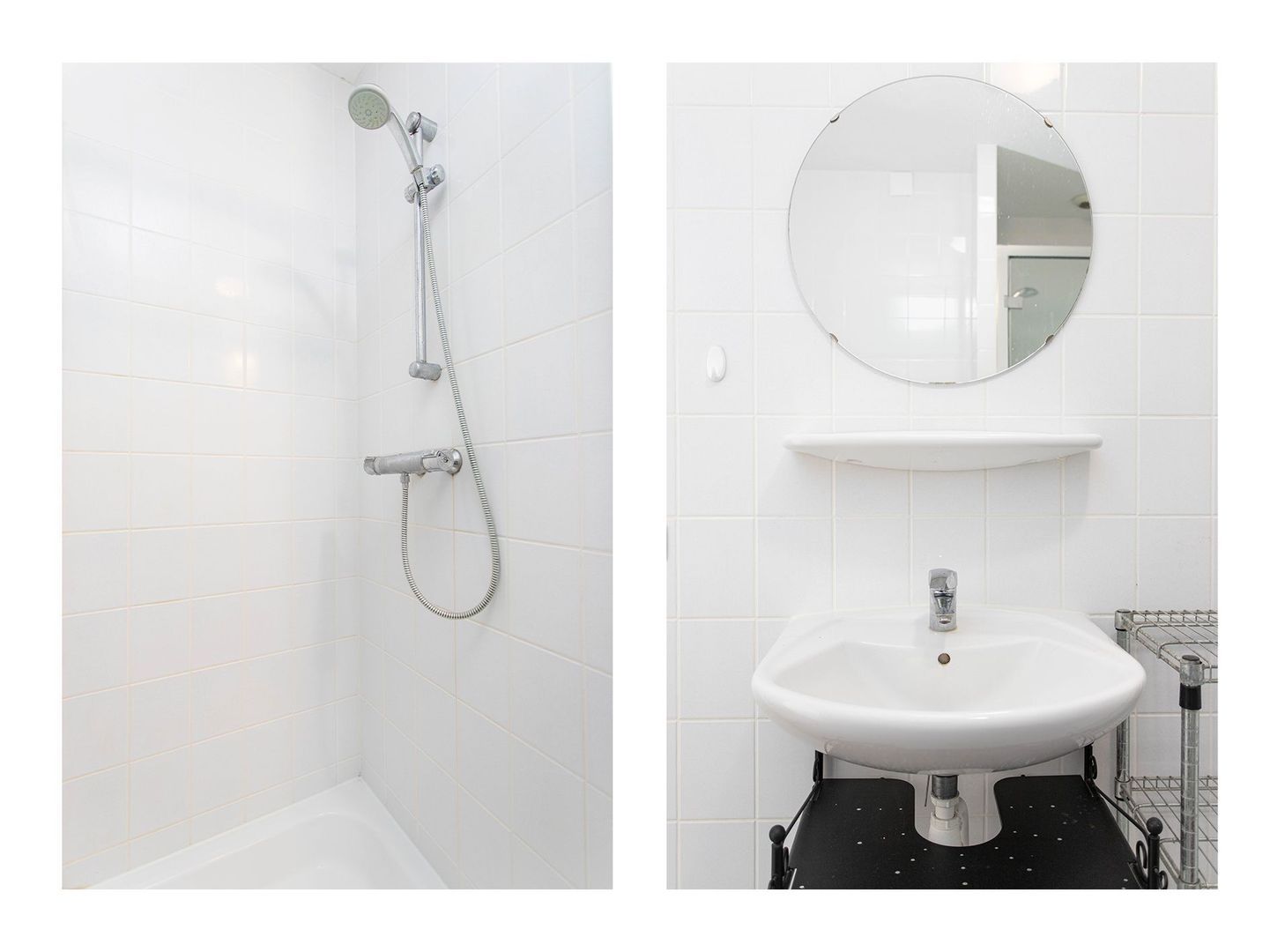 De badkamer is ingericht met een douche, wastafel, toilet en een witgoedaansluiting voor de wasmachine.