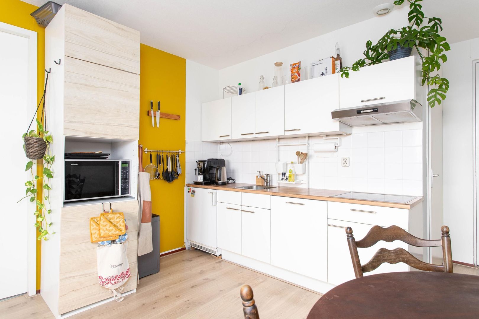 De moderne keuken is uitgerust met een afzuigkap, vaatwasser (2022), keramische kookplaat en koelkast. Dankzij de oostelijke ligging van de woonkamer geniet je hier van een prettige lichtinval in de ochtend. De ruimte is royaal en biedt voldoende plaats voor een comfortabele zithoek en een grote bank. Via het Franse balkon kun je heerlijk de deuren openzetten en genieten van de zon.
