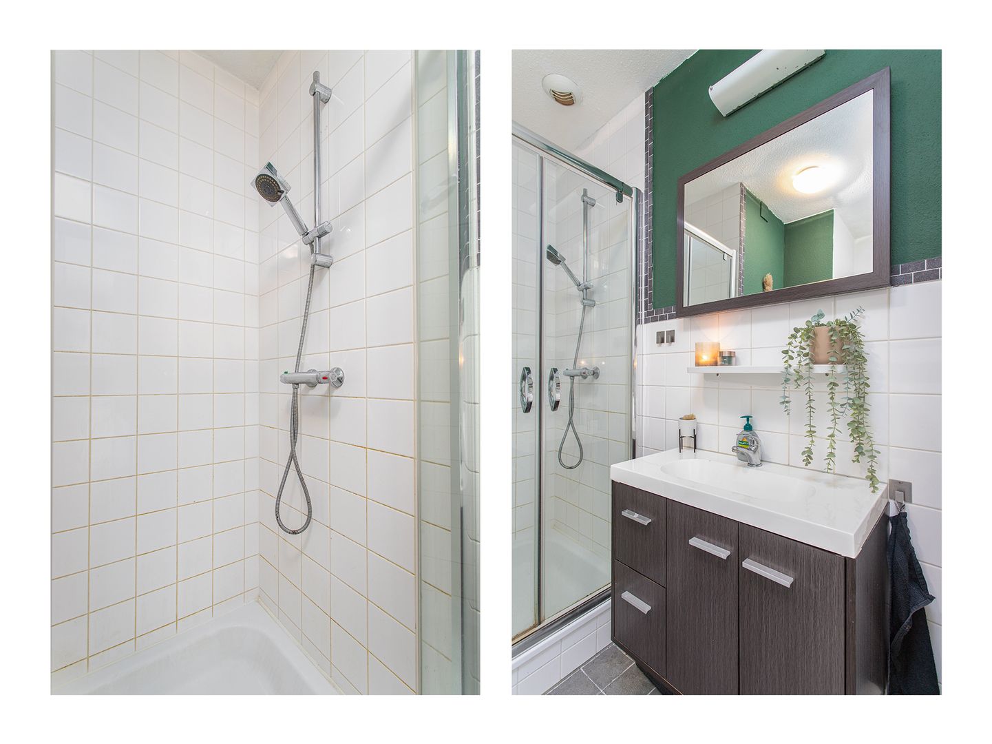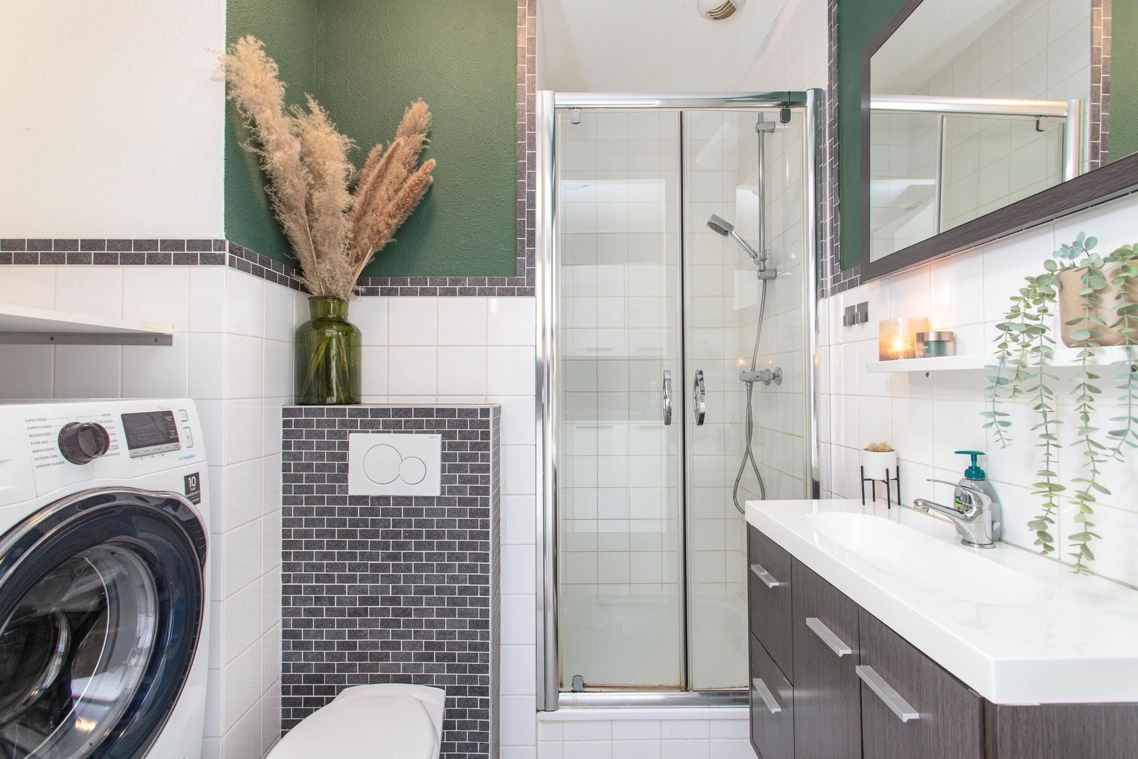 De badkamer is praktisch en verzorgd ingericht, met een douche, toilet een wastafel en de opstelplaats voor de wasmachine.