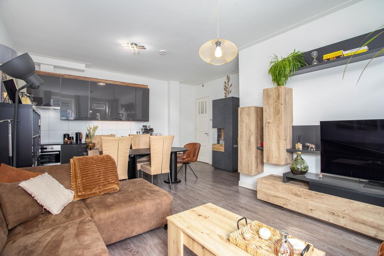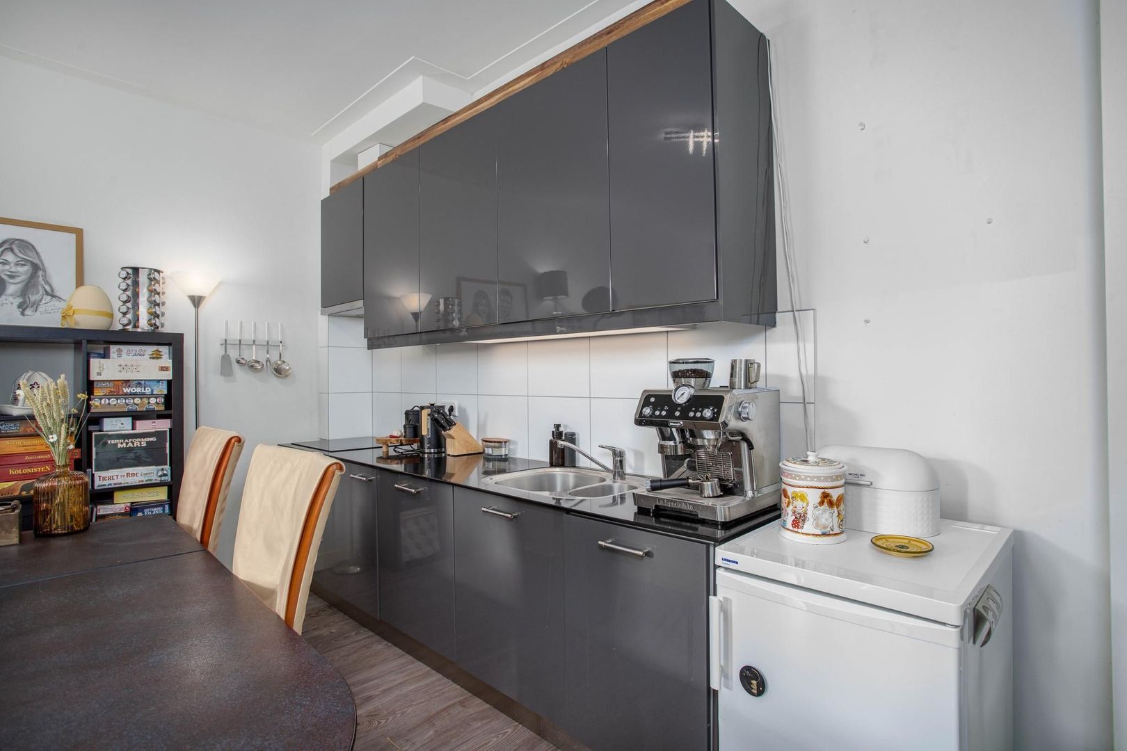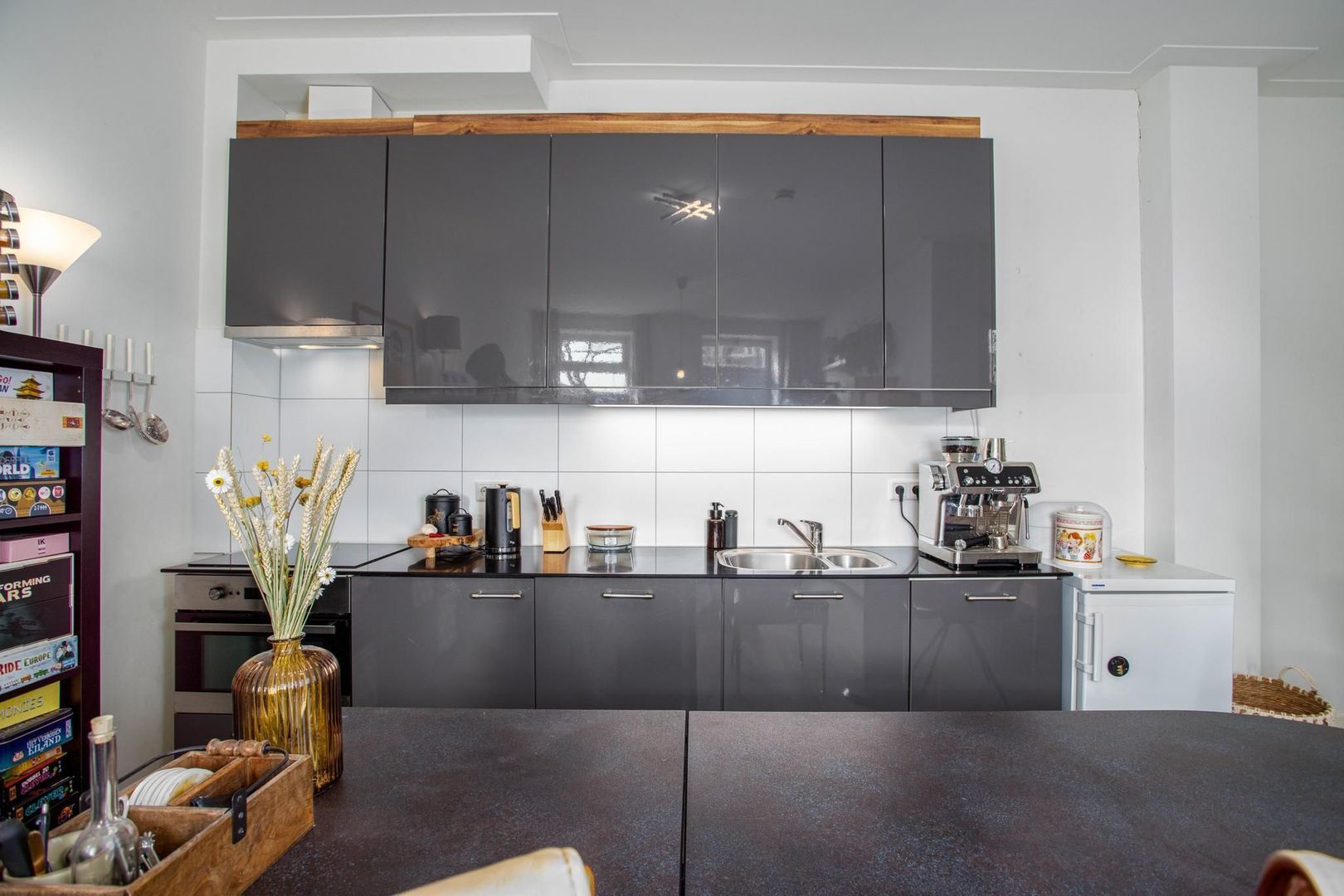 Je komt binnen via de voordeur. Je stapt direct de lichte en sfeervolle woonkamer binnen. Deze ruimte biedt volop mogelijkheden voor een gezellige inrichting. De woning is voorzien van een open keuken. De keuken is modern afgewerkt met glanzende antracietkleurige kasten en voorzien van een inductiekookplaat, afzuigkap en vaatwasser.