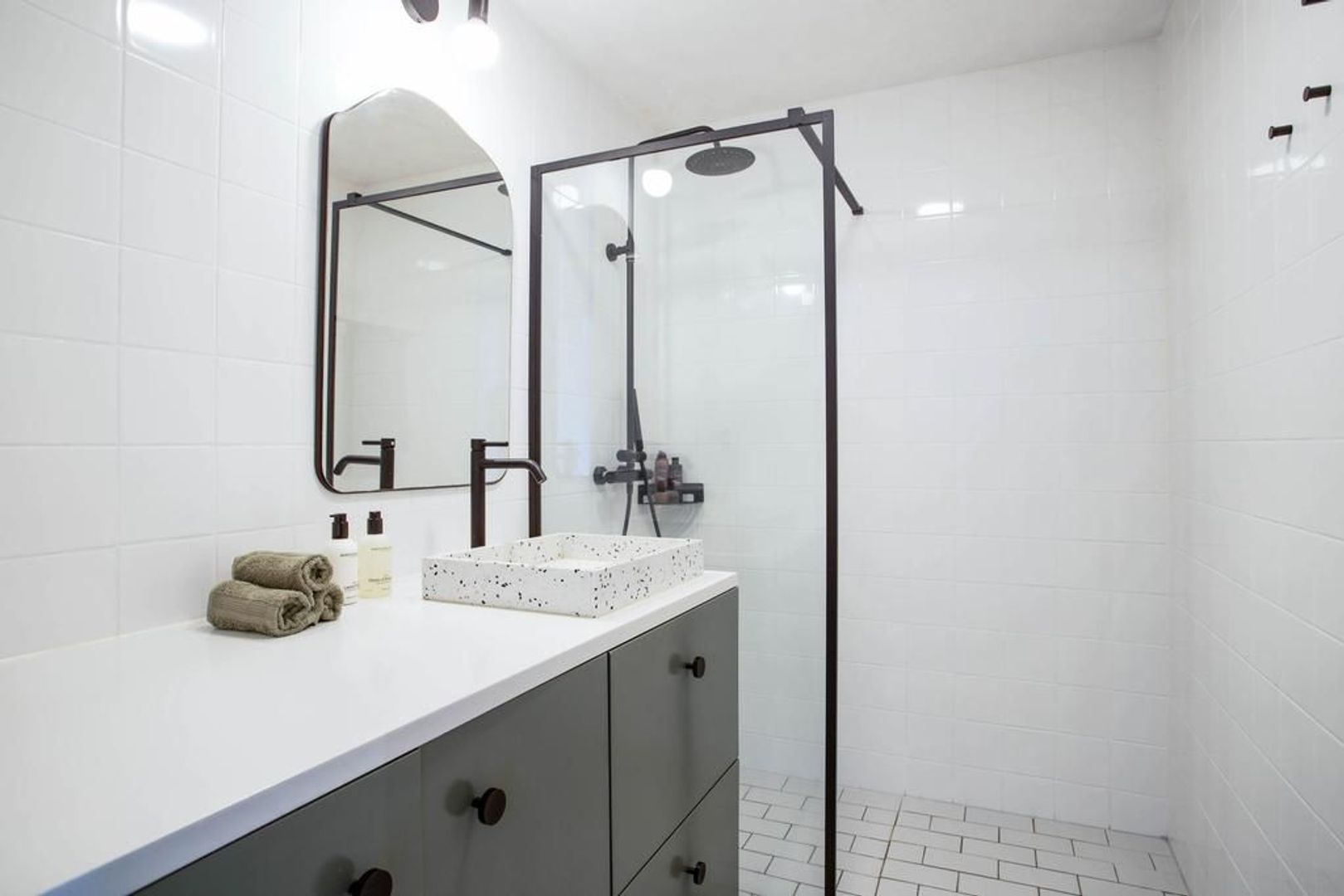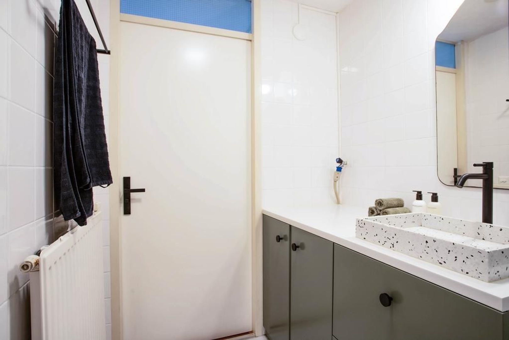 De badkamer is tussen de twee slaapkamers in gelegen. De badkamer is in 2022 vernieuwd en voorzien van een moderne tegelafwerking, inloopdouche en wastafel met wastafelmeubel. In de badkamer is daarnaast de mogelijkheid voor het plaatsen van een wasmachine. Het toilet is in 2024 volledig gerenoveerd en voorzien van luxe inbouwtoilet.