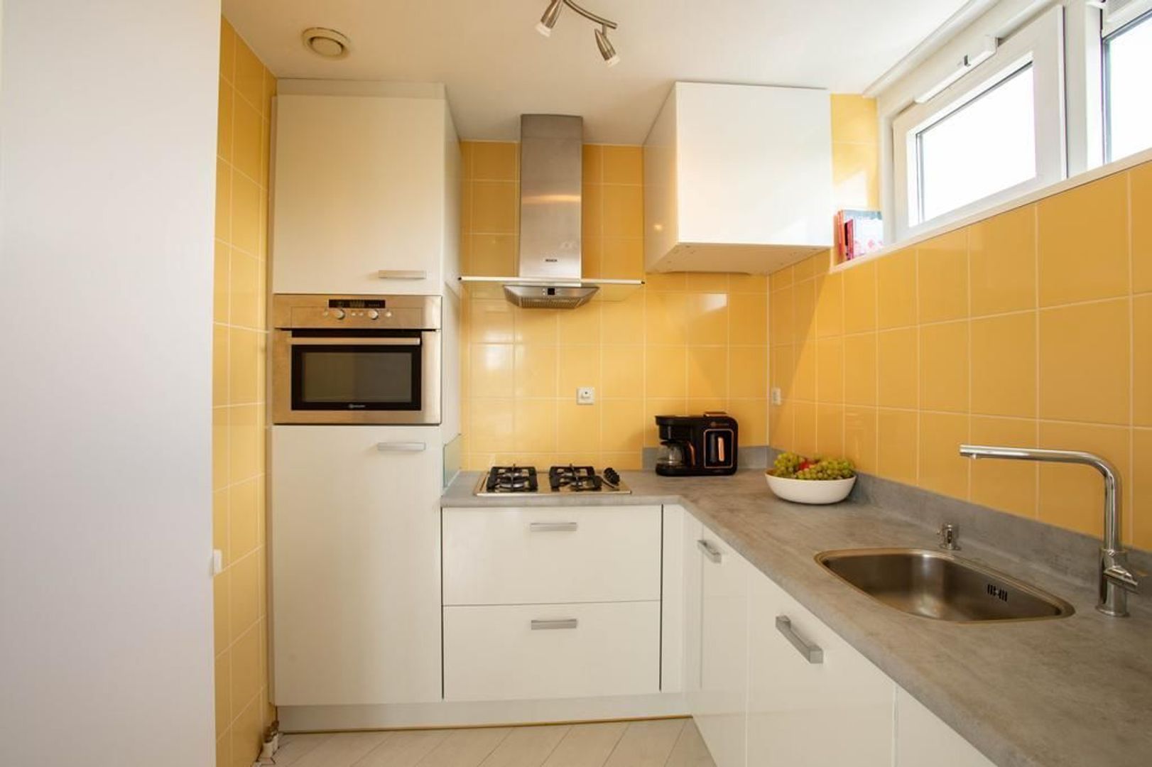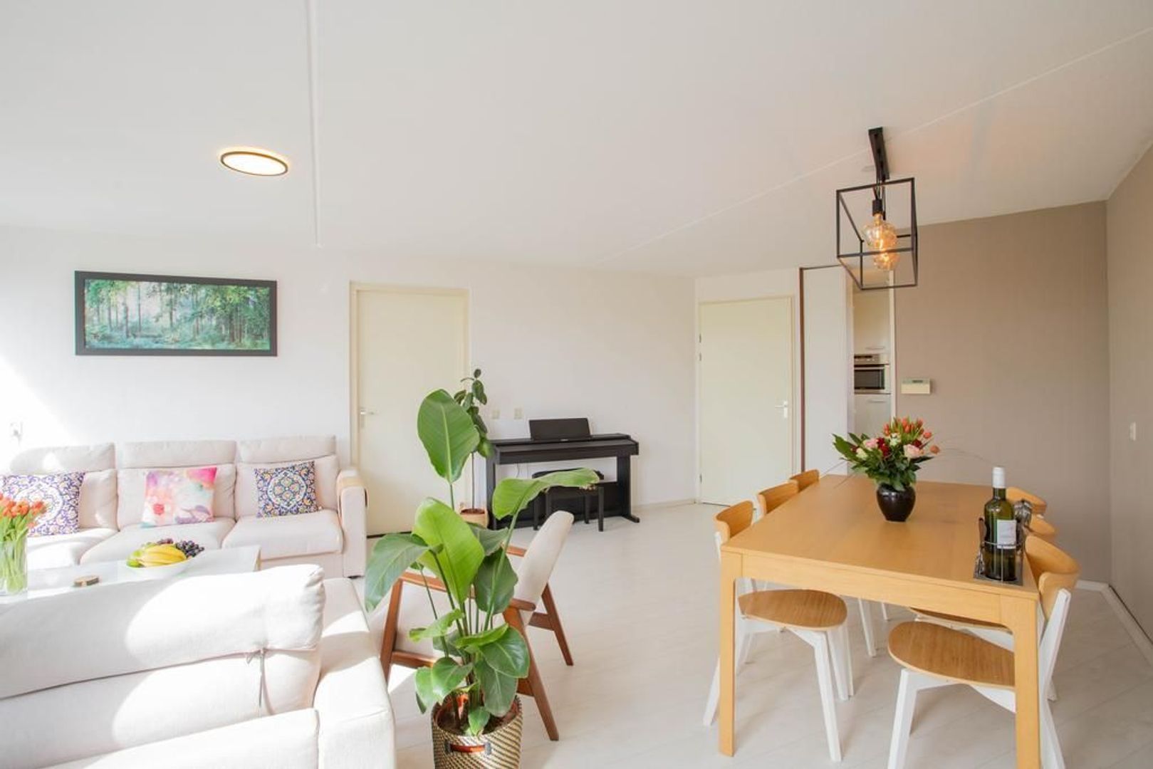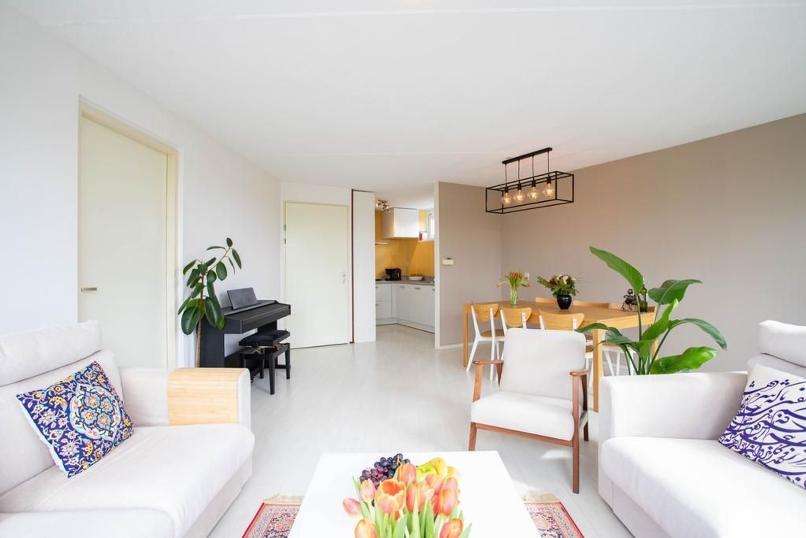 Bij binnenkomst van de woonkamer valt de lichte uitstraling direct op. Mede dankzij de ligging van het appartement op de bovenste etage wordt de woning voorzien van een prettige lichtinval. De woon- en eetkamer kenmerken zich door de ruime opzet en de nette staat van afwerking. In de ruimte is voldoende mogelijkheden voor het creëren van een fijne zit- en eethoek. Aangrenzend aan de woon- en eetkamer is de keuken gelegen. De half open keuken heeft een moderne uitstraling en is voorzien van het volgende inbouwapparatuur: vierpits-gasfornuis, oven, afzuigkap, koelkast, vriezer en vaatwasser.
