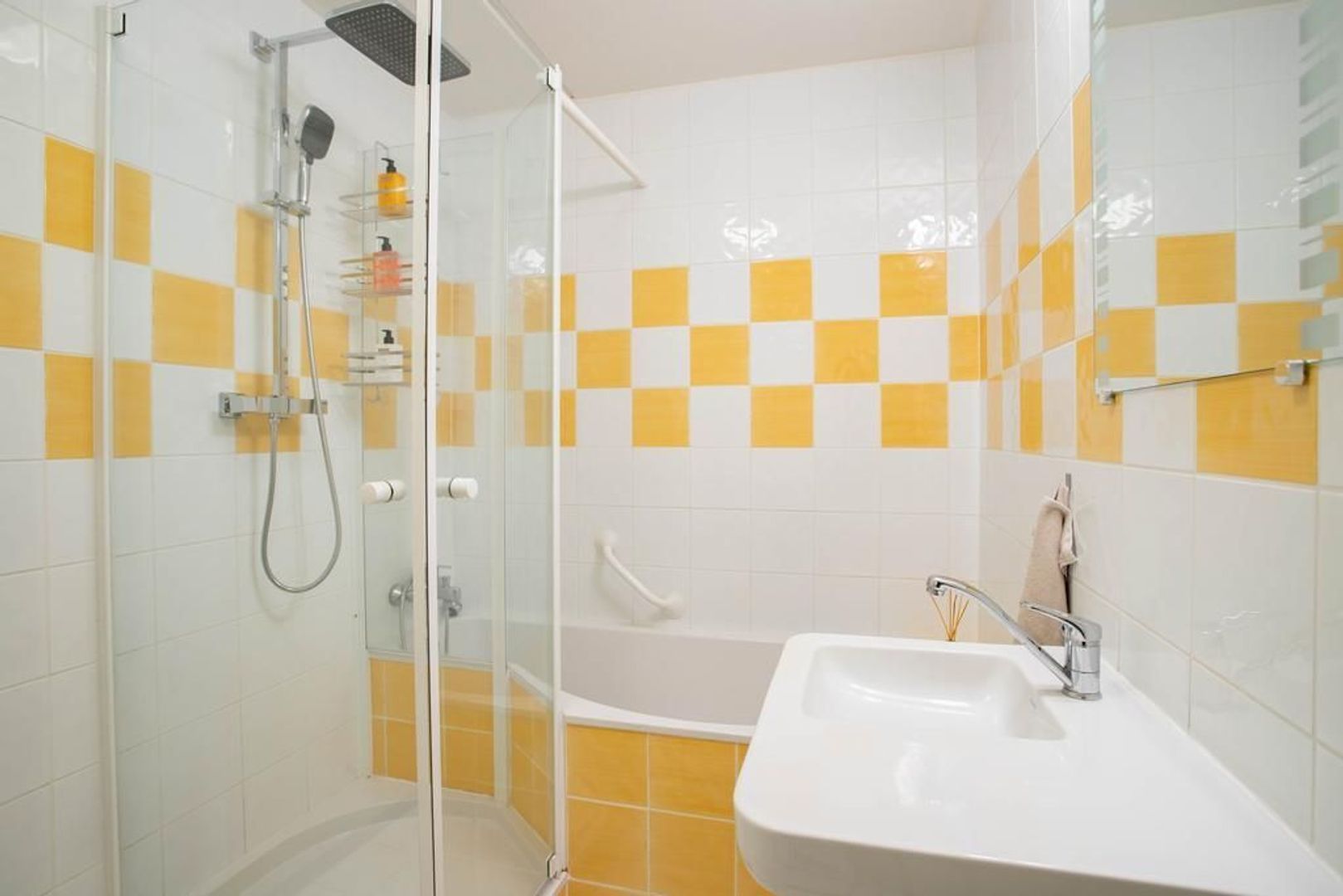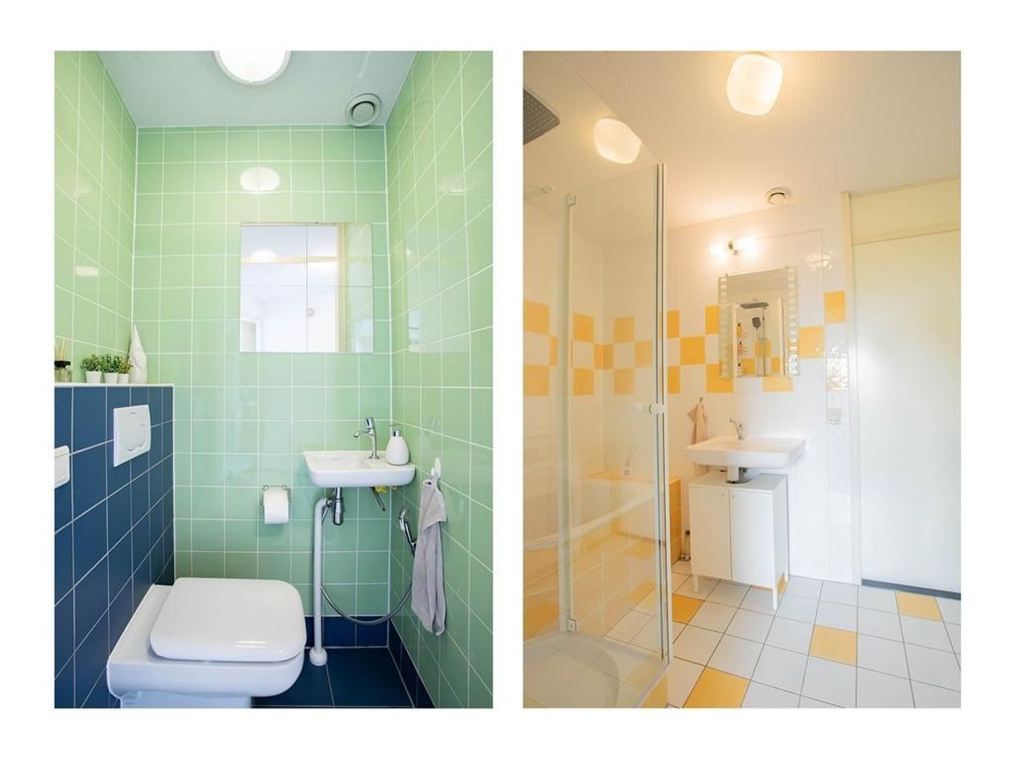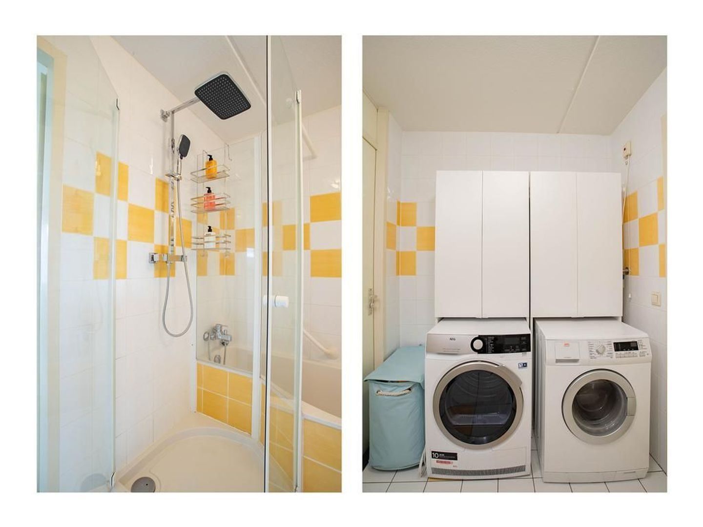 De badkamer heeft een tegelafwerking en is voorzien van een ligbad, douche, wastafel en opstelplaats voor de wasmachine/droger.
