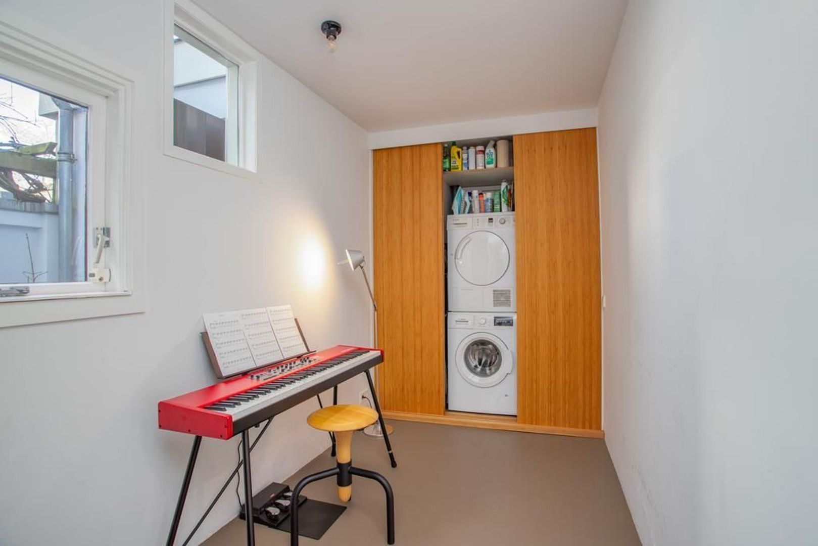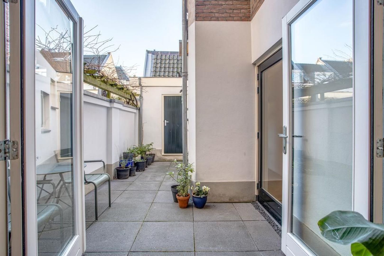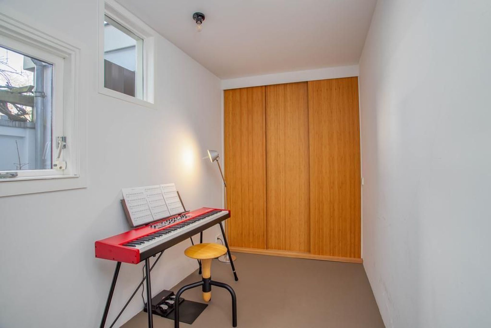 Wanneer je verder loopt, kom je in de eetkamer, die een heerlijk uitzicht biedt op de rustige straat. Aan de andere zijde van de keuken vind je het separate toilet en de hobbykamer, waar fraai weggewerkt ook de aansluitingen voor de witgoedinstallaties zijn. De begane grond blijft heerlijk koel in de zomer. Via de openslaande deuren van de keuken en via de gang is de stadstuin te bereiken. De tuin heeft een ideale ligging op het zuid(oost)en. De tuin voorzien van een ruime berging.