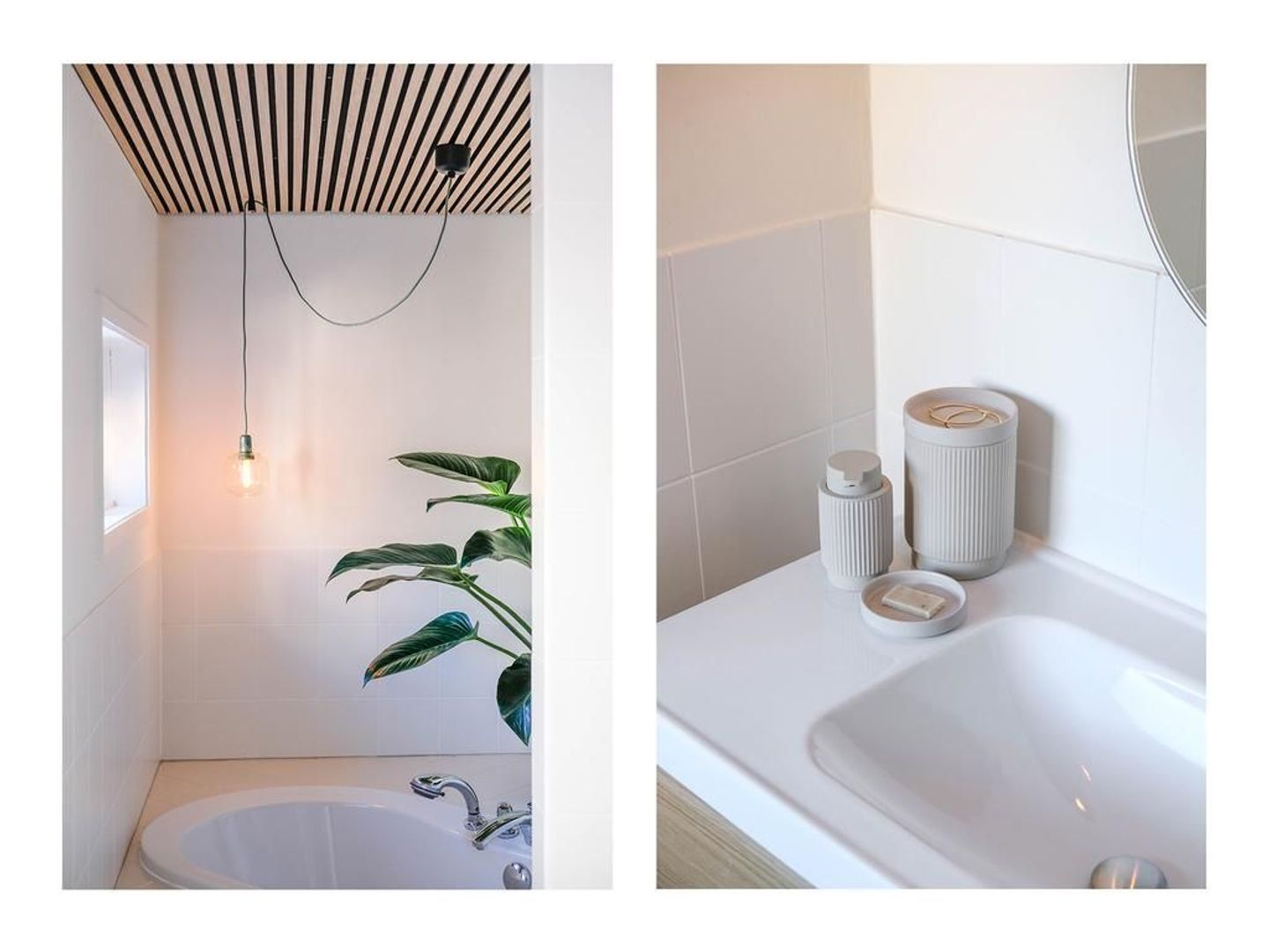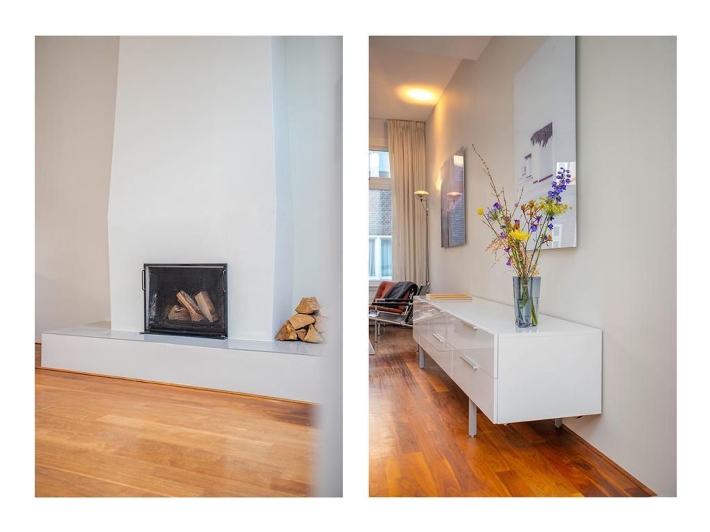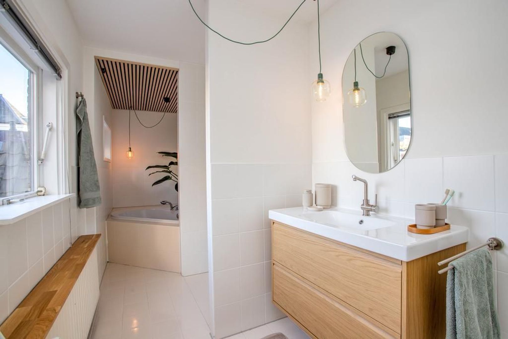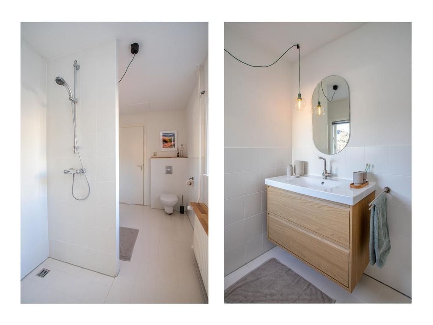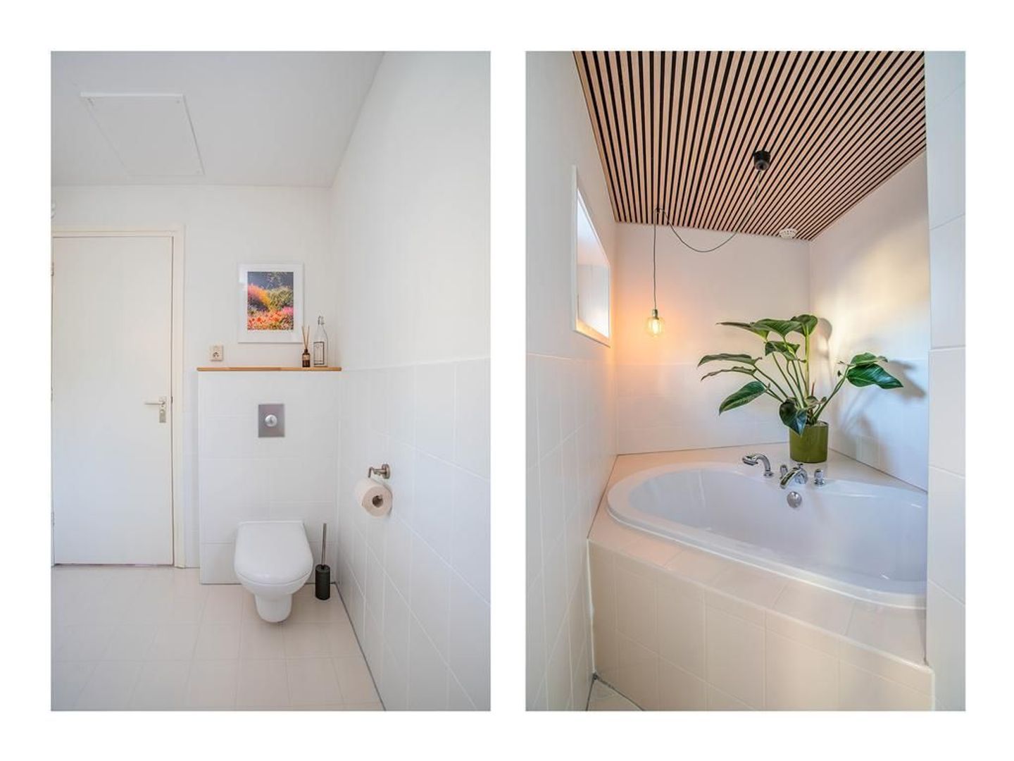 Via de overloop bereik je de eerste zithoek aan de voorzijde van de woning. Dit is een lichte ruimte waar je heerlijk kunt lezen en ontspannen. Als je doorloopt, kom je in de tweede zithoek. Beide gedeeltes vormen de woonkamer die is voorzien van een sfeervolle open haard. Wanneer je verder loopt, tref je de badkamer aan. De badkamer is door de combinatie van hout en wit neutraal en van alle gemakken voorzien. De badkamer heeft een wastafel met wastafelmeubel, een inloopdouche, een ligbad en een toilet.