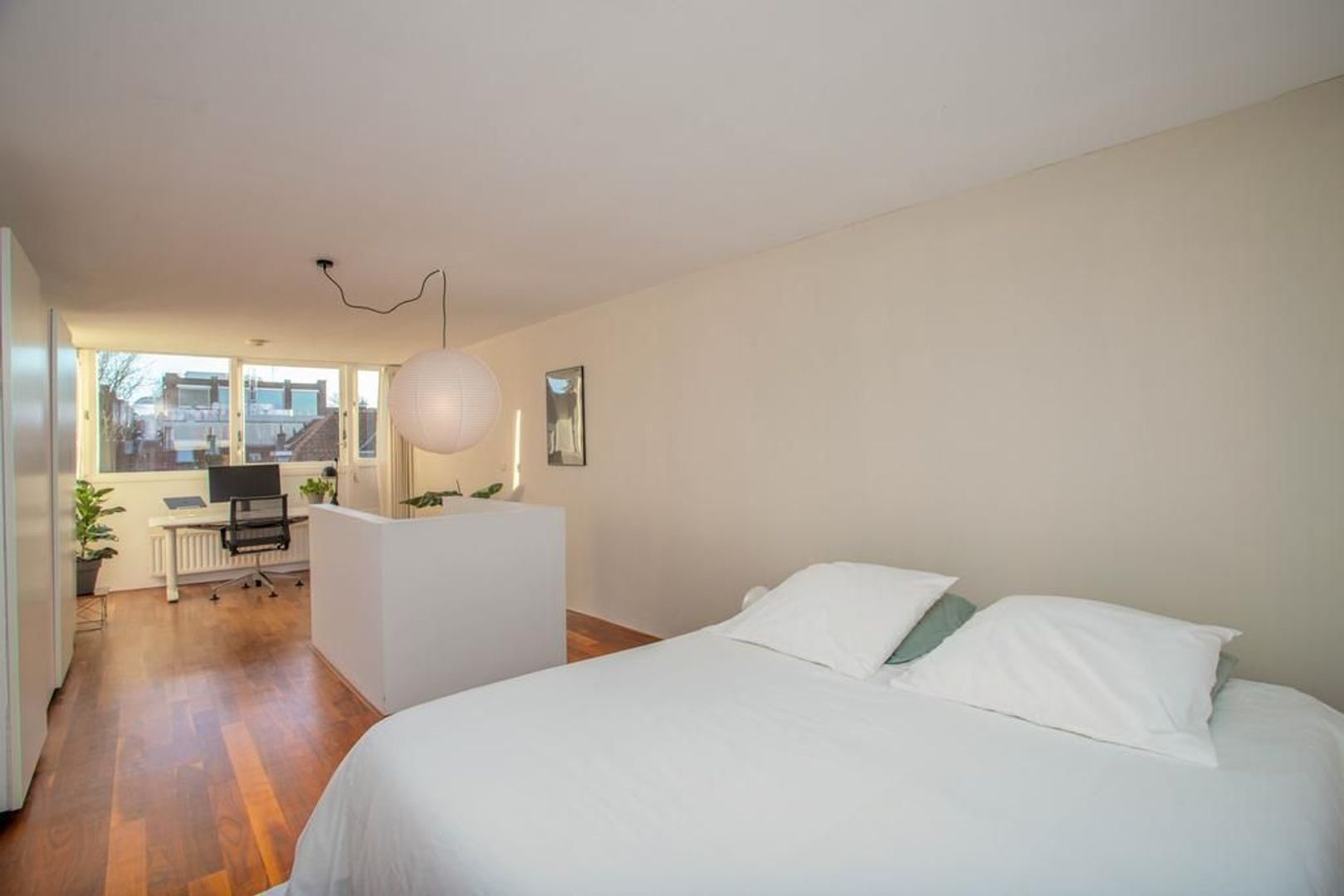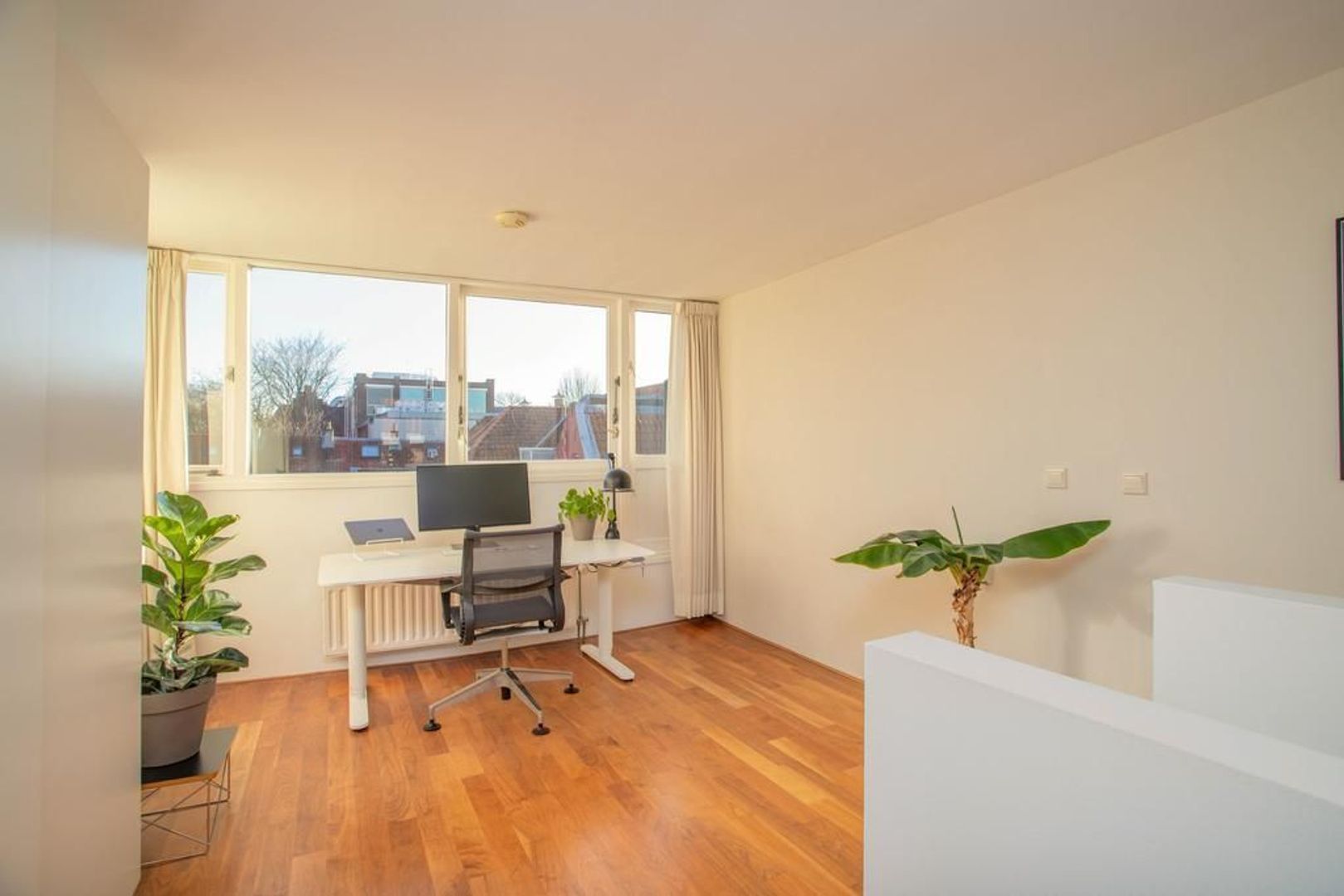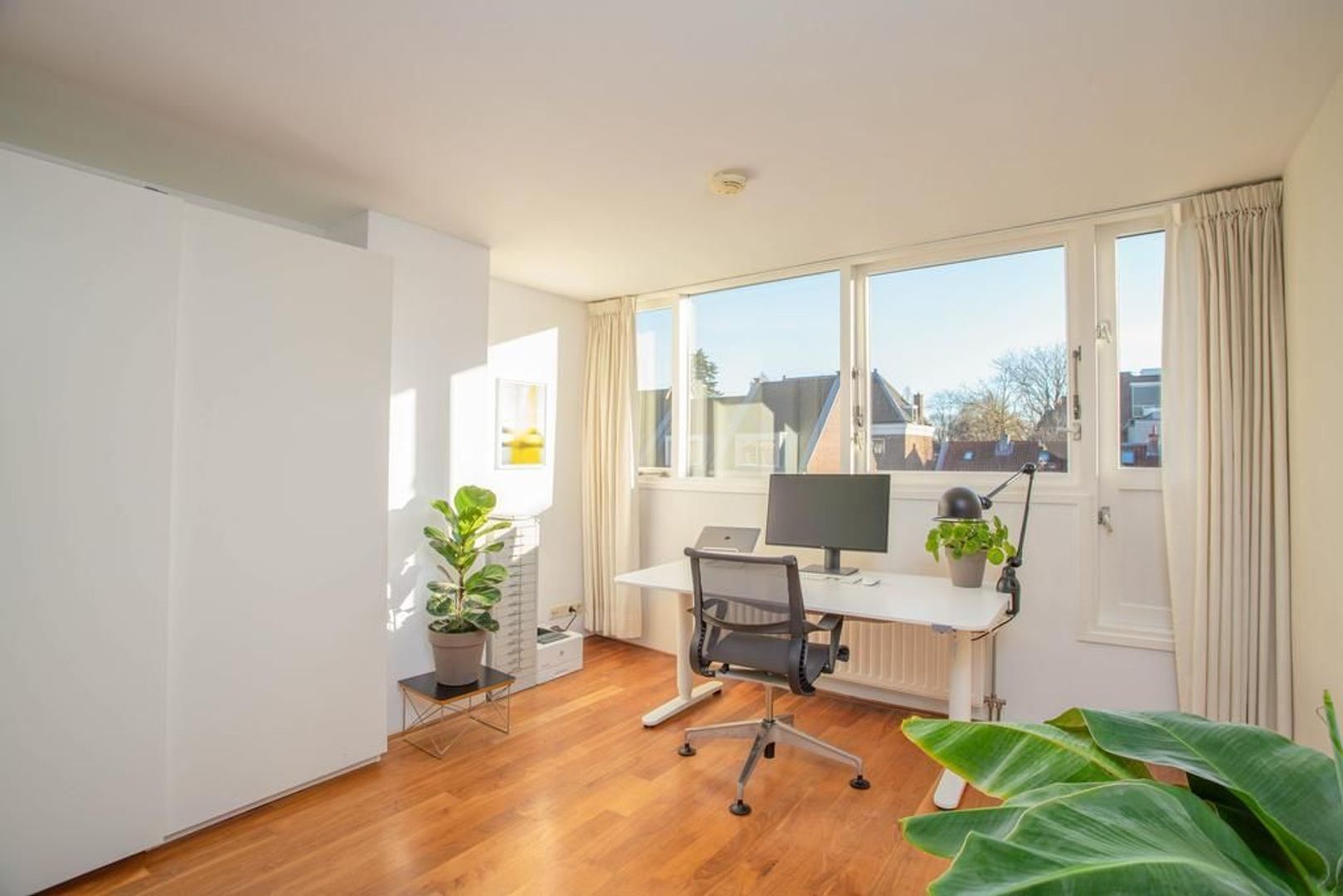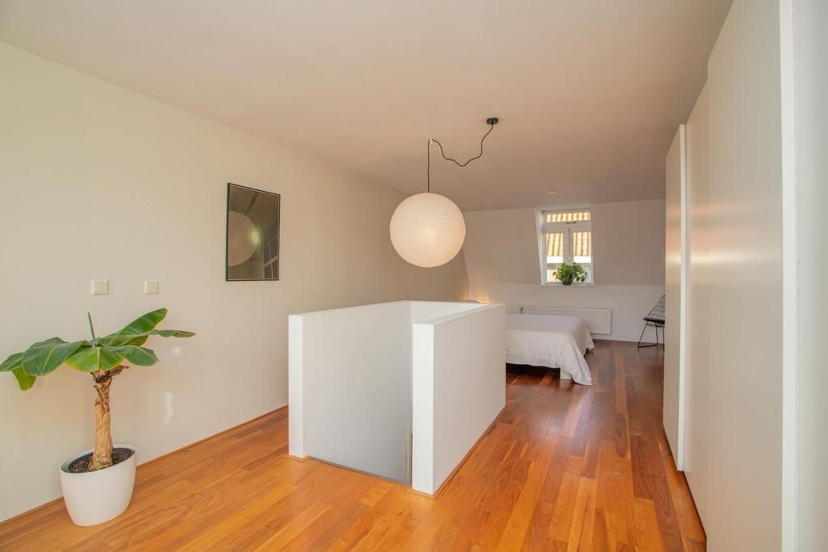 Via de trapopgang kom je in de slaapkamer. Deze grote ruimte beslaat de gehele verdieping en wordt ook gebruikt als werkkamer, met een prachtig uitzicht op het Zaadhuis van de Hortus en de omliggende binnentuinen. Deze verdieping biedt de mogelijkheid om twee aparte kamers te realiseren.