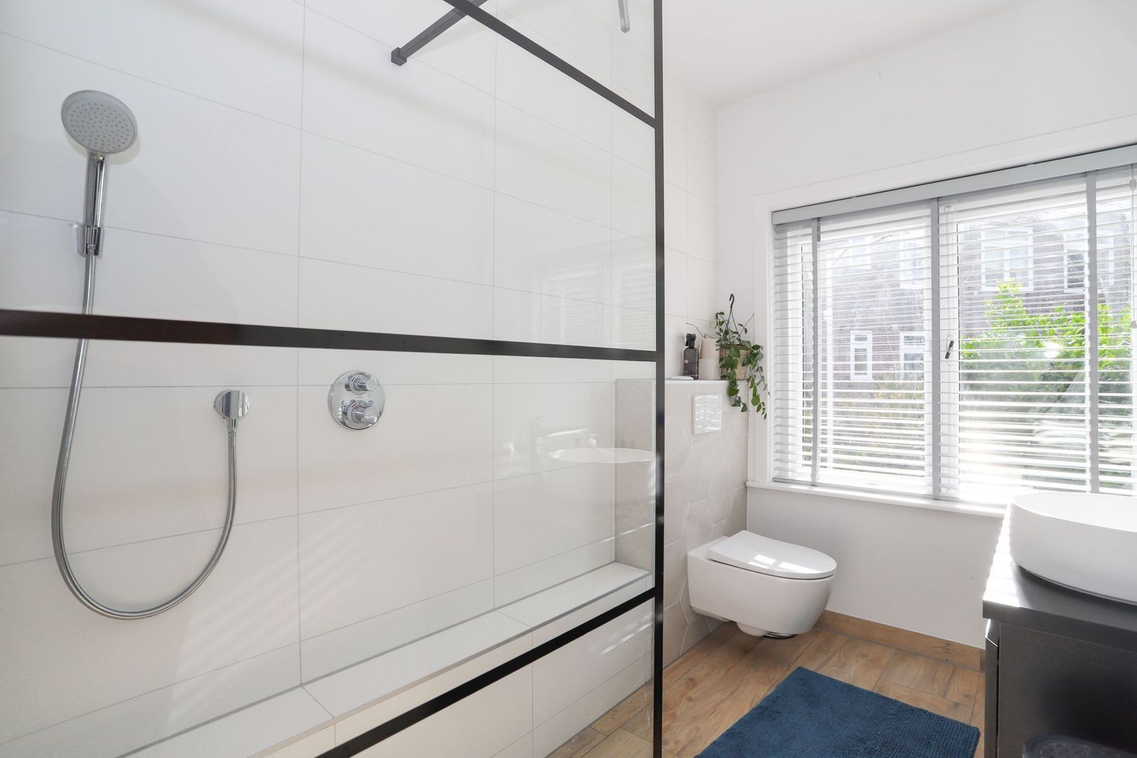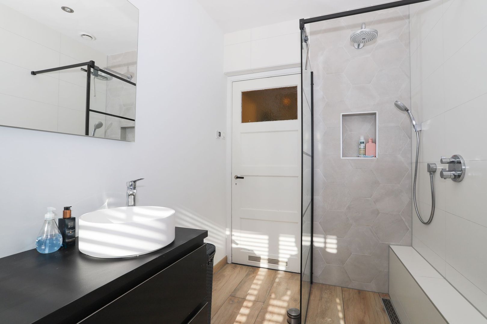 Het moderne gemak is op de eerste verdieping aanwezig in de badkamer. De prachtige inloopdouche, ronde wastafel met meubel en hexagon-tegels stralen veel luxe uit. Verder zijn de prachtige deuren en de praktische inbouwkasten uit de jaren '30 nog aanwezig. Door deze inbouwkasten en de knieschotten op de tweede verdieping is er veel bergruimte in de gehele woning.