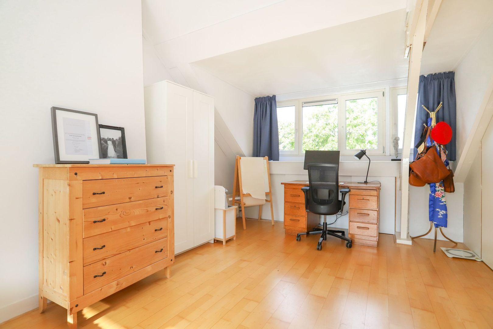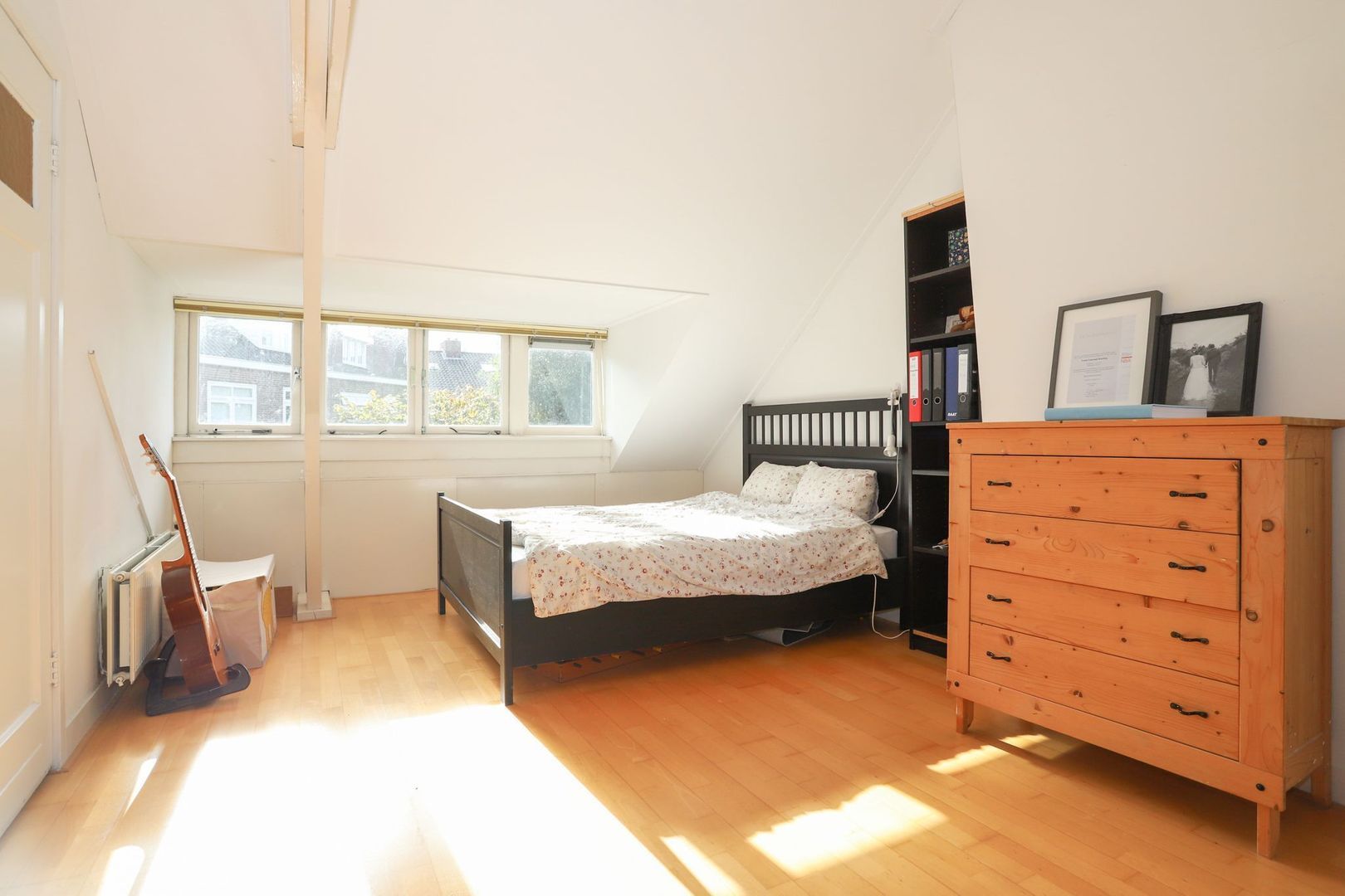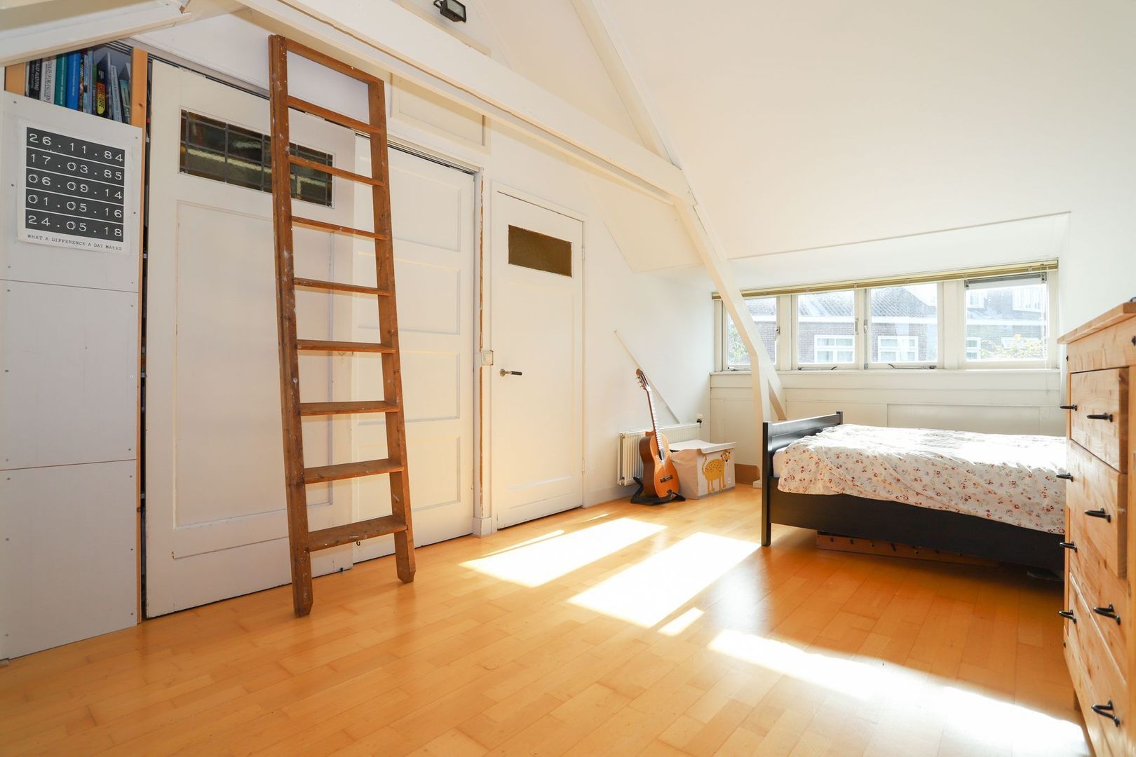 2e verdieping: een ruime slaapkamer met veel bergruimte en een vliering met veel lichtinval, de slaapkamer is voorzien van een dakkapel aan zowel de voorzijde als de achterzijde van de woning. De overloop is voorzien van witgoedaansluiting, cv-installatie en een wastafel.