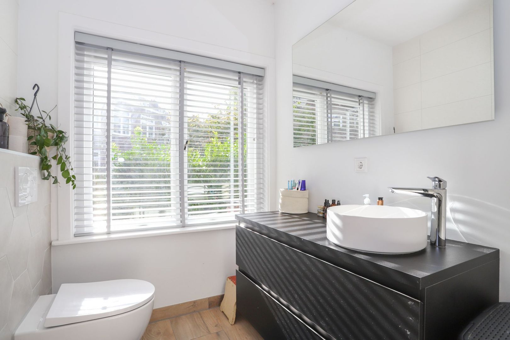 1e verdieping: Ruime lichte overloop met toegang tot drie slaapkamers en de badkamer. Grote slaapkamer aan de voorzijde en grote slaapkamer aan de achterzijde met inbouwkast en openslaande deuren naar het balkon. Derde slaapkamer aan de voorzijde. Moderne badkamer met inloopdouche, wastafel en toilet.
