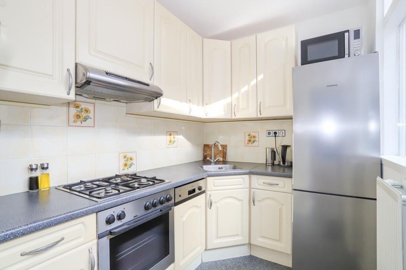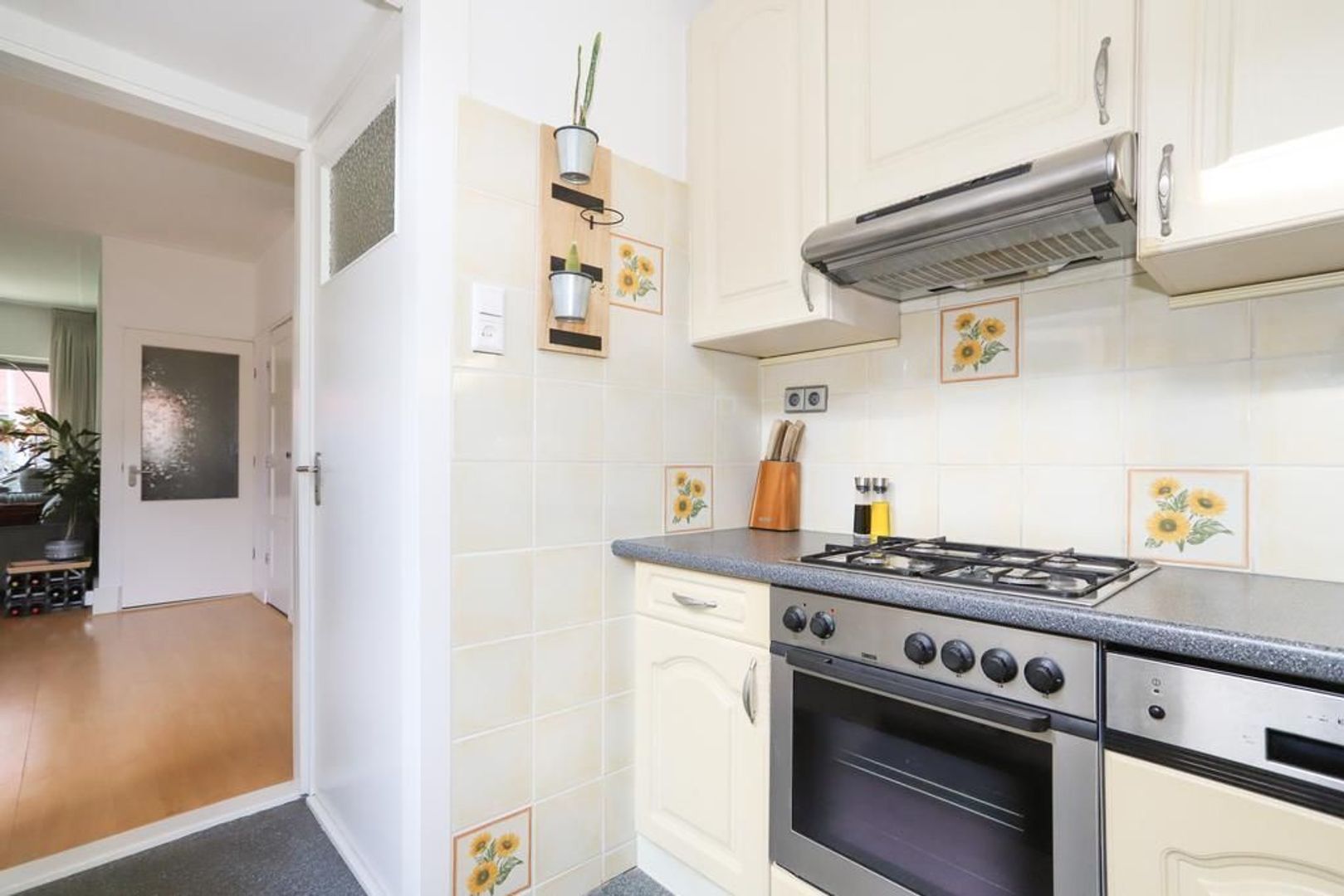 De keuken is voorzien van inbouwapparatuur zoals een 4-pitsgastoestel, afzuigkap en een vaatwasser. Verder is er voldoende opbergruimte en is via de keuken ook de achtertuin te bereiken en het separate toilet.