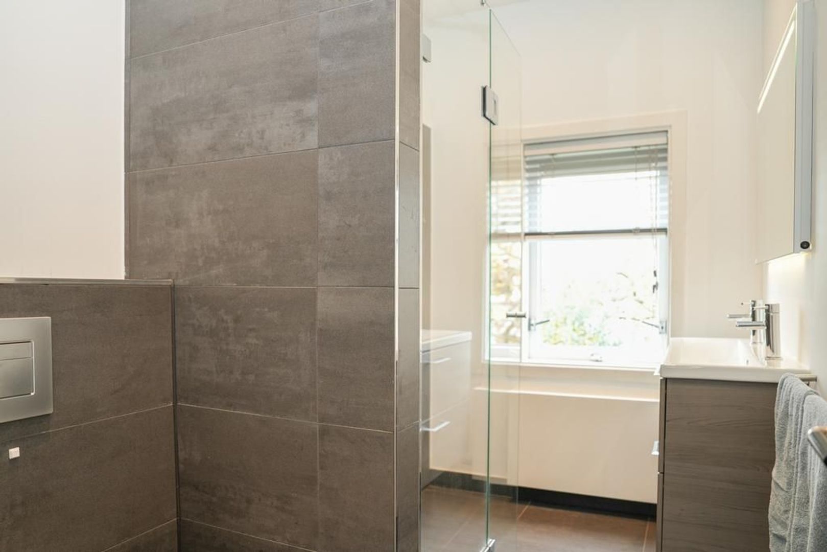 Eerste verdieping: Overloop. Aan de voorzijde van de woning is een grote slaapkamer (v.v. een eigen wastafel) en een kleinere slaapkamer aanwezig. Aan de achterzijde van de woning is de derde slaapkamer (v.v. een inbouwkast) en de badkamer gelegen. Alle slaapkamers zijn goed onderhouden en fijn licht. De moderne badkamer is uitgevoerd met tegelwerk en voorzien van een inloopdouche, dubbele wastafel met meubel en een tweede toilet.