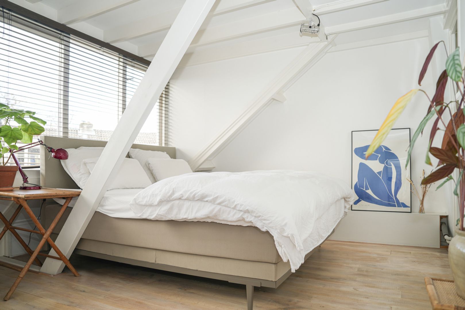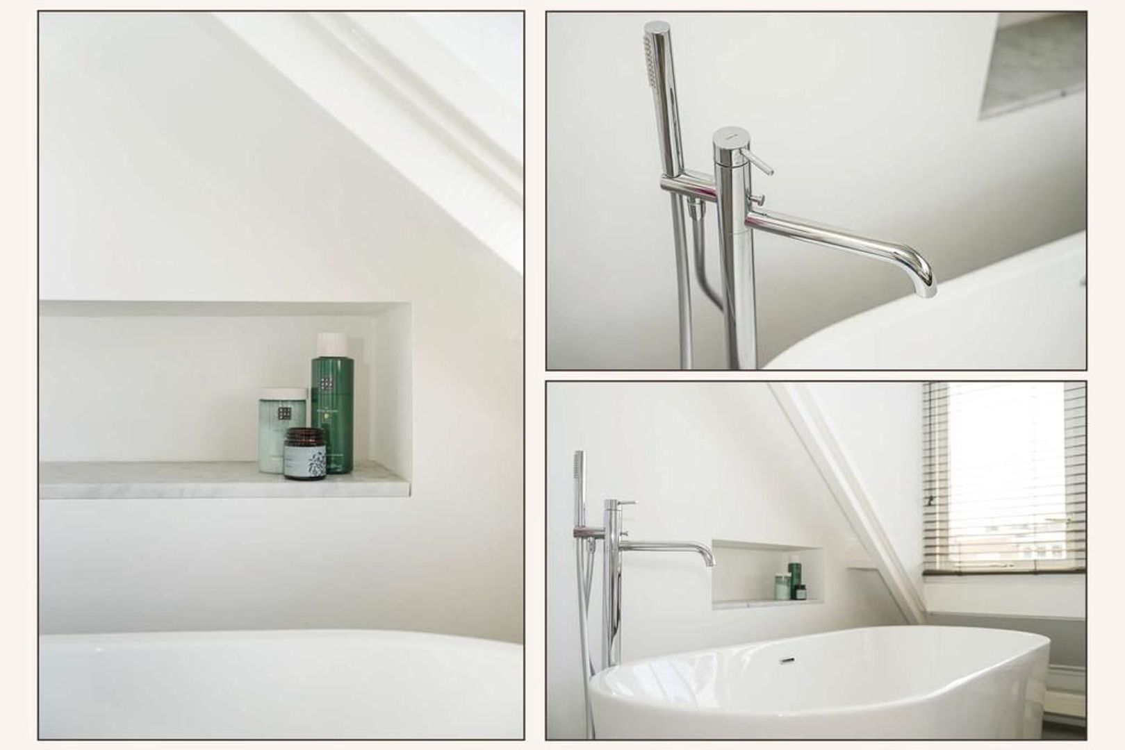Tweede verdieping: Op de tweede verdieping is de vierde slaapkamer gelegen. De vierde slaapkamer is ruim van formaat, hier is voldoende ruimte voor een tweepersoonsbed, eigen ligbad en een eigen wastafel. Een heerlijke plek om jezelf terug te trekken. Door de dakkapel is hier een zee van ruimte en licht ontstaan. De ruime overloop biedt ruimte voor het plaatsen van de CV-ketel, wasmachine, droger en het bergen van spullen achter de schotten. De tweede verdieping geeft toegang tot de vliering.