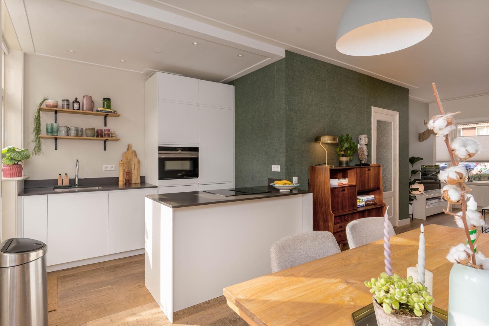 De woning heeft een riante en lichte woonkamer. Mede dankzij de grote raampartijen aan de voor- en achterzijde heerst er een bijzonder licht en ruimtelijk gevoel. Samen met de sierlijke houten vloer en open keuken voelt de ruimte direct aan als een thuis. De open keuken heeft een moderne uitstraling en is uitgevoerd met de nodige inbouwapparatuur, zoals een Quooker, Siemens oven en inductie kookplaat met geïntegreerde afzuiging. Via de deur in de keuken of de openslaande deuren in de eetkamer bereik je de fraai aangelegde en verzorgde achtertuin met berging en achterom. Ondanks de ligging op het oosten weet de zon deze tuin voor het overgrote gedeelte van de dag te vinden.