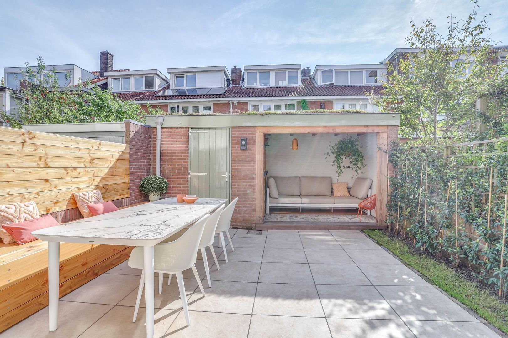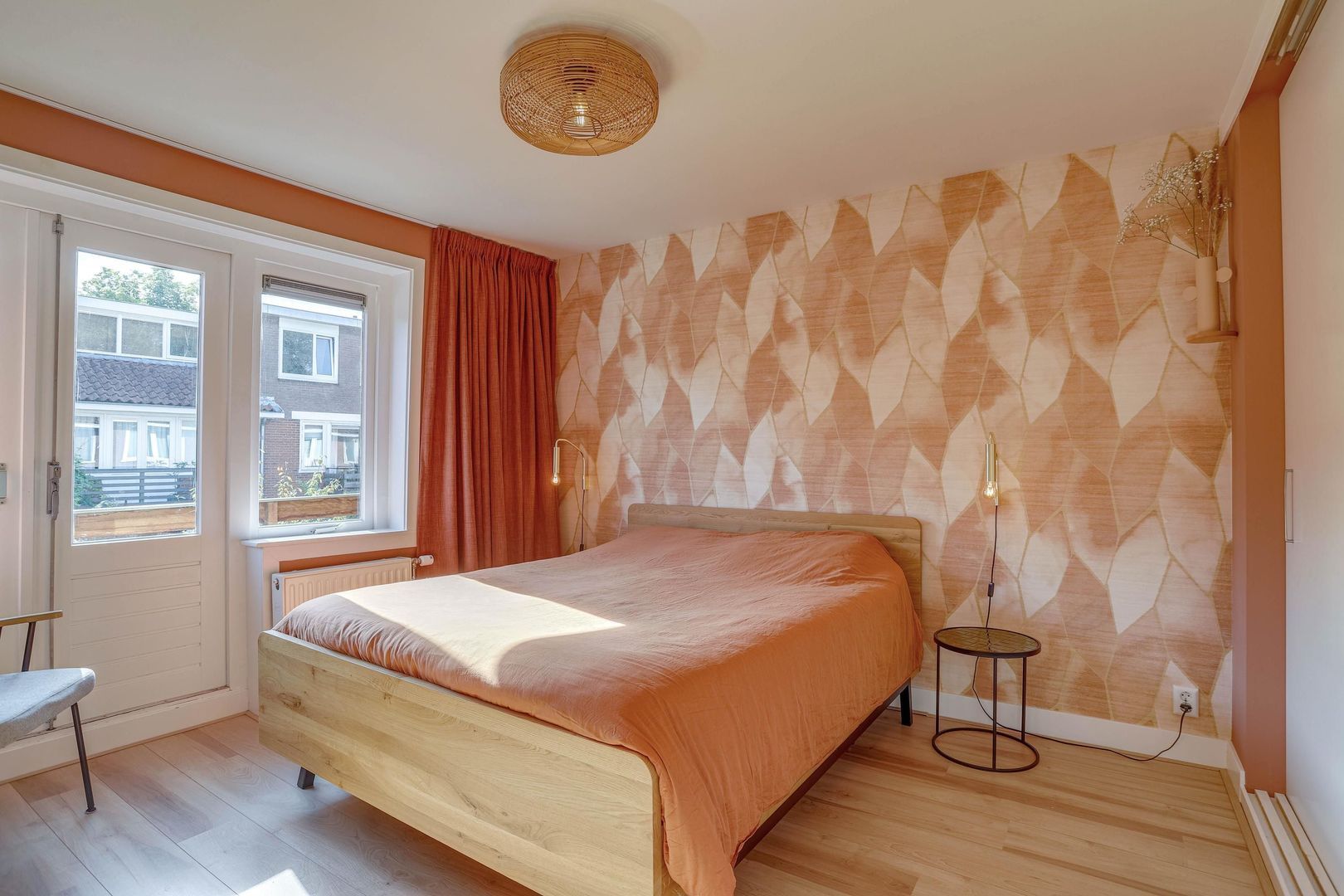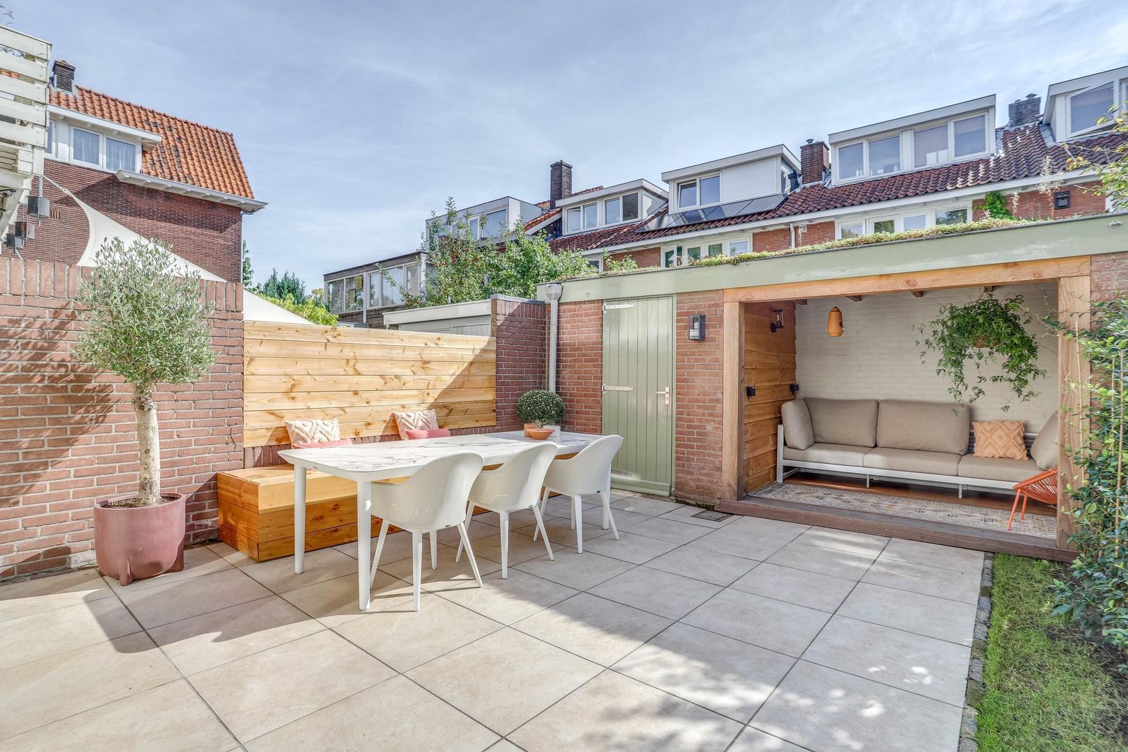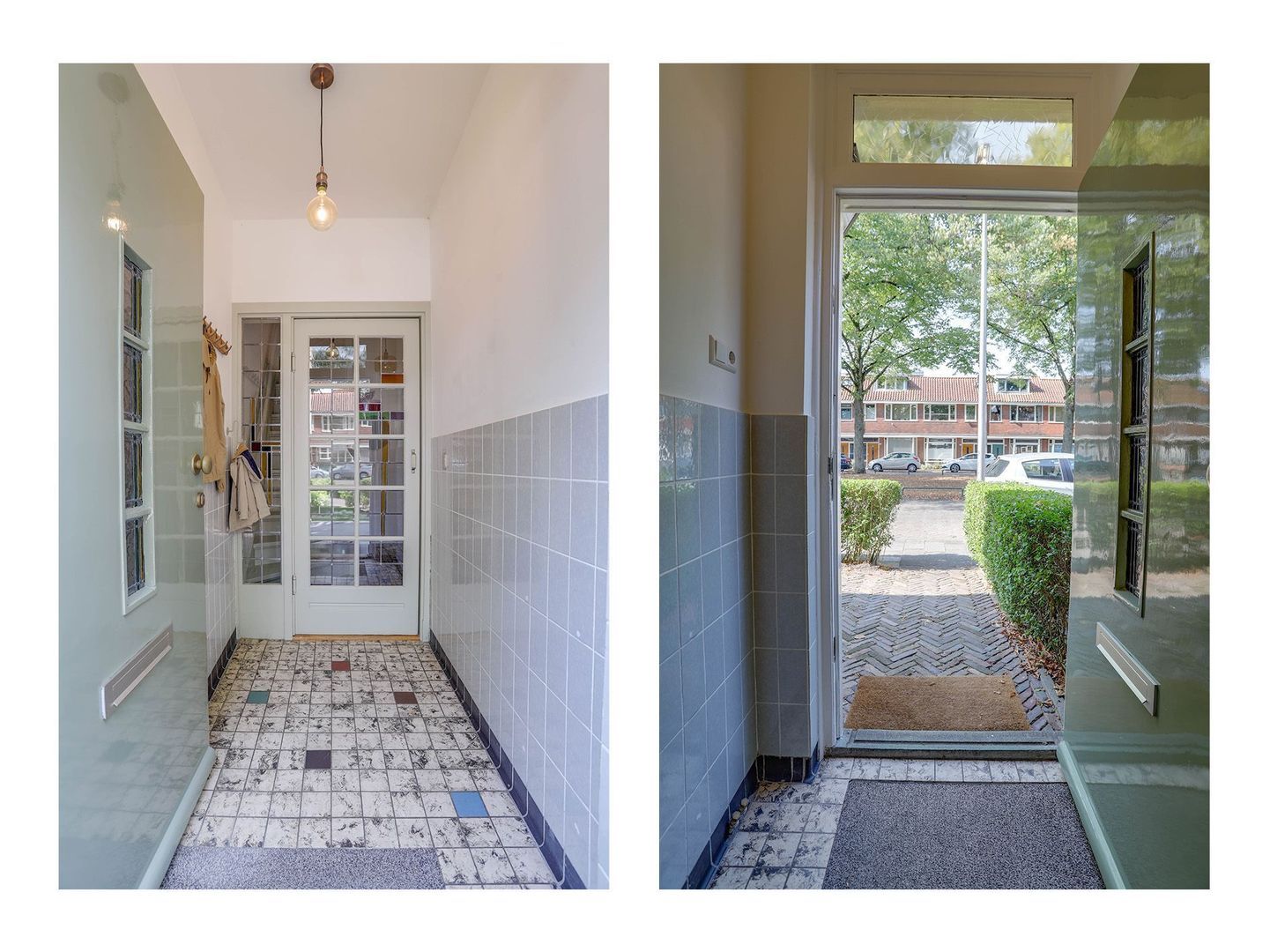 De entree/hal van deze woning wordt middels de voortuin met heg bereikt. De voortuin is nieuw aangelegd door de huidige bewoners. In de hal bevindt zich de trapopgang naar de eerste verdieping, het gastentoilet en bereik je de woonkamer. De woonkamer is voorzien van een gezellige erker en grote ramen welke uitzicht bieden op de voortuin en de brede straat met groenstrook. De woonkamer leent zich uitstekend voor een ruime zithoek. De en-suite-deuren met glas-in-lood ramen geven toegang tot de ruime eetkamer met aansluitend de open keuken. In zowel de woonkamer als eetkamer bevindt zich een inbouwkast met fijne extra bergruimte. De eetkamer is erg ruim waardoor er ruimte is voor een grote tafel waar heerlijk aan geborreld en gedineerd kan worden. De keuken heeft een moderne uitstraling en is voorzien van het volgende inbouwapparatuur: inductiekookplaat, afzuigkap, vaatwasser, quooker, koelkast en vriezer. De grote raampartijen zorgen gedurende de heel de dag voor een fijne daglicht inval in de woning. Door de enkele en dubbele openslaande deuren is de tuin makkelijk te betreden. De tuin is gelegen op het oosten waardoor er gedurende het grootste deel van de dag een plekje in de zon of schaduw te vinden is. De tuin is fraai aangelegd en helemaal vernieuwd in 2024. De tuin beschikt over een terras, diverse planten borders, een veranda en een berging. De overkapping is de ideale plek om tot in de late uurtjes en/of op slechtere dagen te genieten van de buitenlucht. De berging en overkapping hebben een sedum dak. Dit dak is erg onderhoudsarm en door het sedum dak wordt de temperatuur in de berging beter gereguleerd.