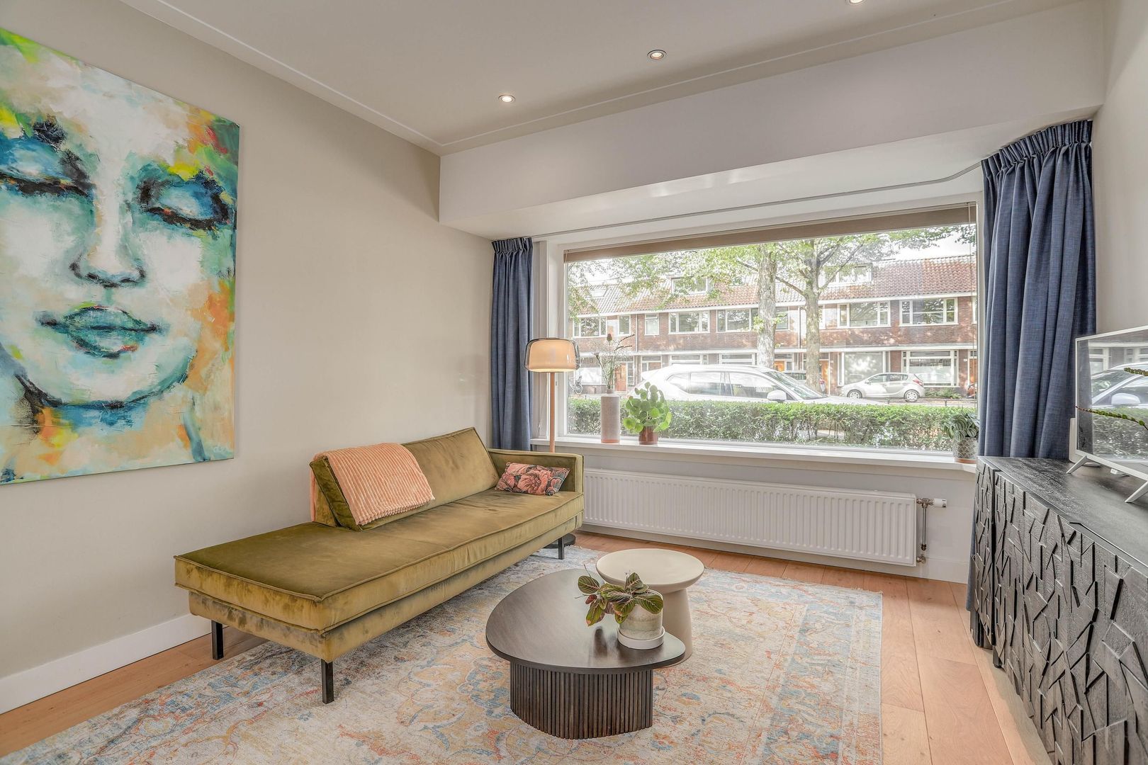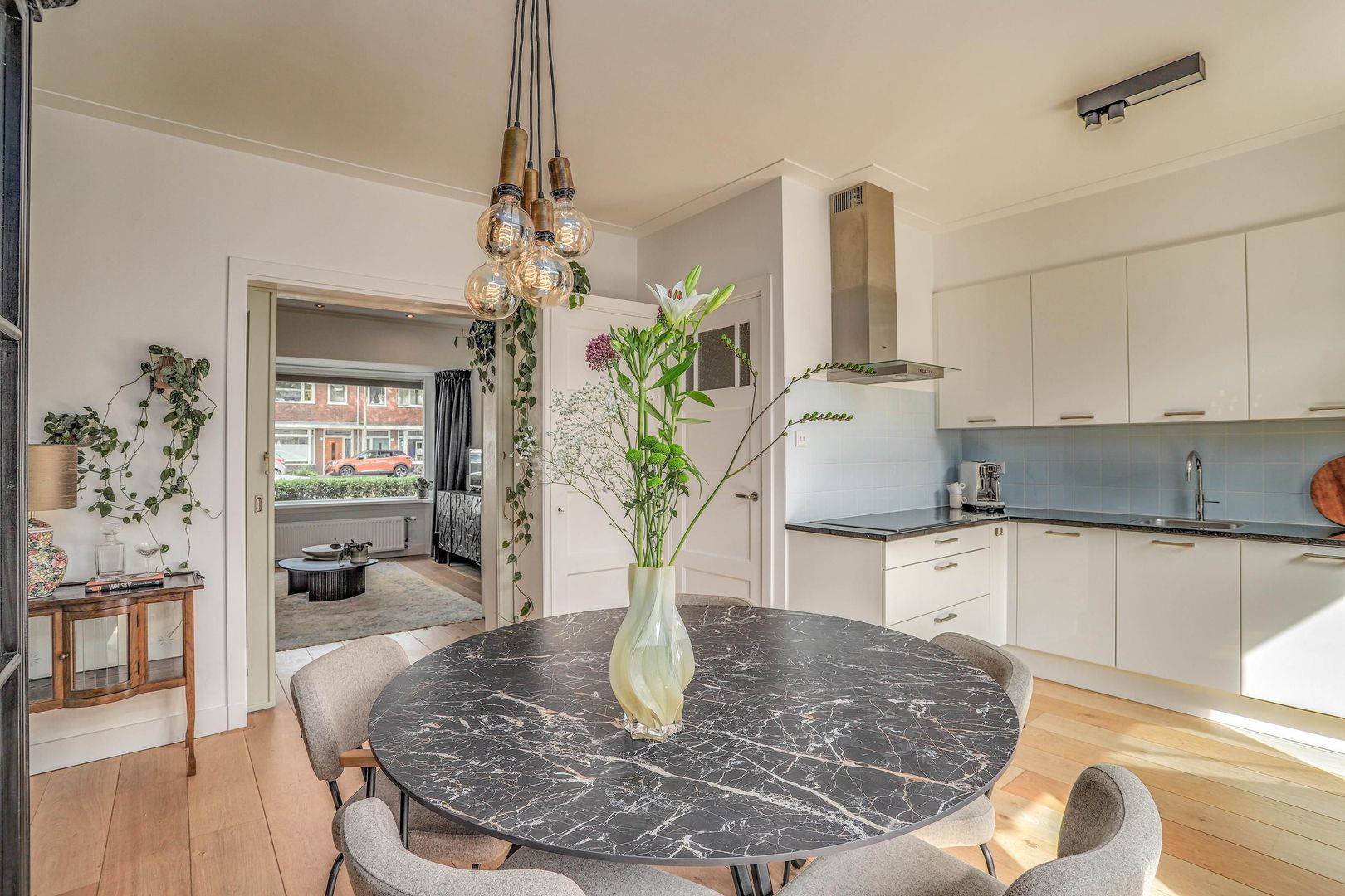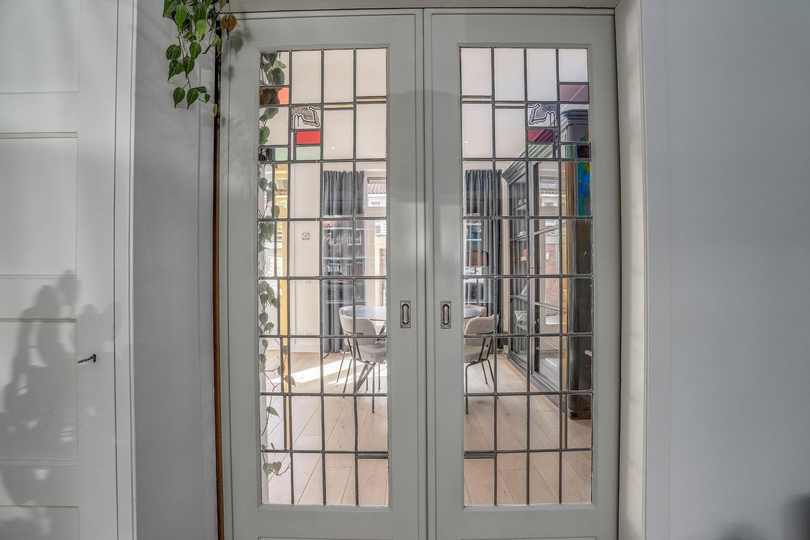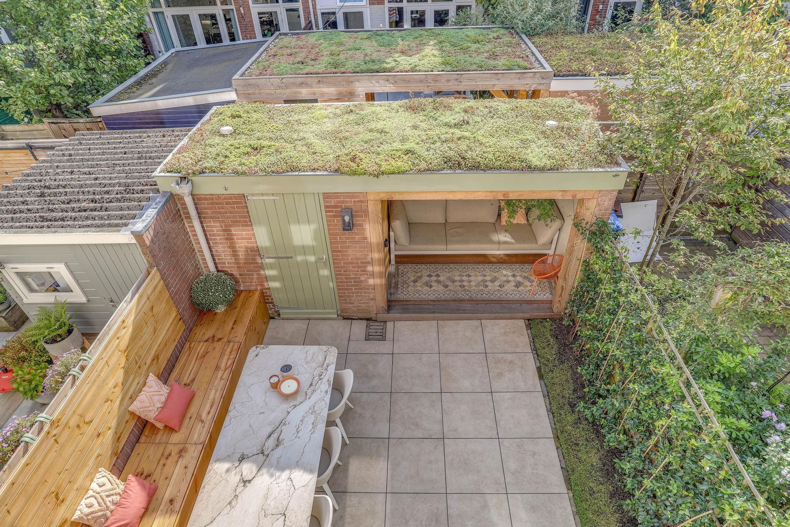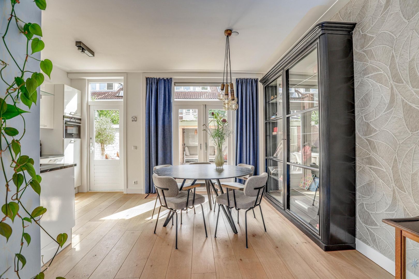 De entree/hal van deze woning wordt middels de voortuin met heg bereikt. De voortuin is nieuw aangelegd door de huidige bewoners. In de hal bevindt zich de trapopgang naar de eerste verdieping, het gastentoilet en bereik je de woonkamer. De woonkamer is voorzien van een gezellige erker en grote ramen welke uitzicht bieden op de voortuin en de brede straat met groenstrook. De woonkamer leent zich uitstekend voor een ruime zithoek. De en-suite-deuren met glas-in-lood ramen geven toegang tot de ruime eetkamer met aansluitend de open keuken. In zowel de woonkamer als eetkamer bevindt zich een inbouwkast met fijne extra bergruimte. De eetkamer is erg ruim waardoor er ruimte is voor een grote tafel waar heerlijk aan geborreld en gedineerd kan worden. De keuken heeft een moderne uitstraling en is voorzien van het volgende inbouwapparatuur: inductiekookplaat, afzuigkap, vaatwasser, quooker, koelkast en vriezer. De grote raampartijen zorgen gedurende de heel de dag voor een fijne daglicht inval in de woning. Door de enkele en dubbele openslaande deuren is de tuin makkelijk te betreden. De tuin is gelegen op het oosten waardoor er gedurende het grootste deel van de dag een plekje in de zon of schaduw te vinden is. De tuin is fraai aangelegd en helemaal vernieuwd in 2024. De tuin beschikt over een terras, diverse planten borders, een veranda en een berging. De overkapping is de ideale plek om tot in de late uurtjes en/of op slechtere dagen te genieten van de buitenlucht. De berging en overkapping hebben een sedum dak. Dit dak is erg onderhoudsarm en door het sedum dak wordt de temperatuur in de berging beter gereguleerd.