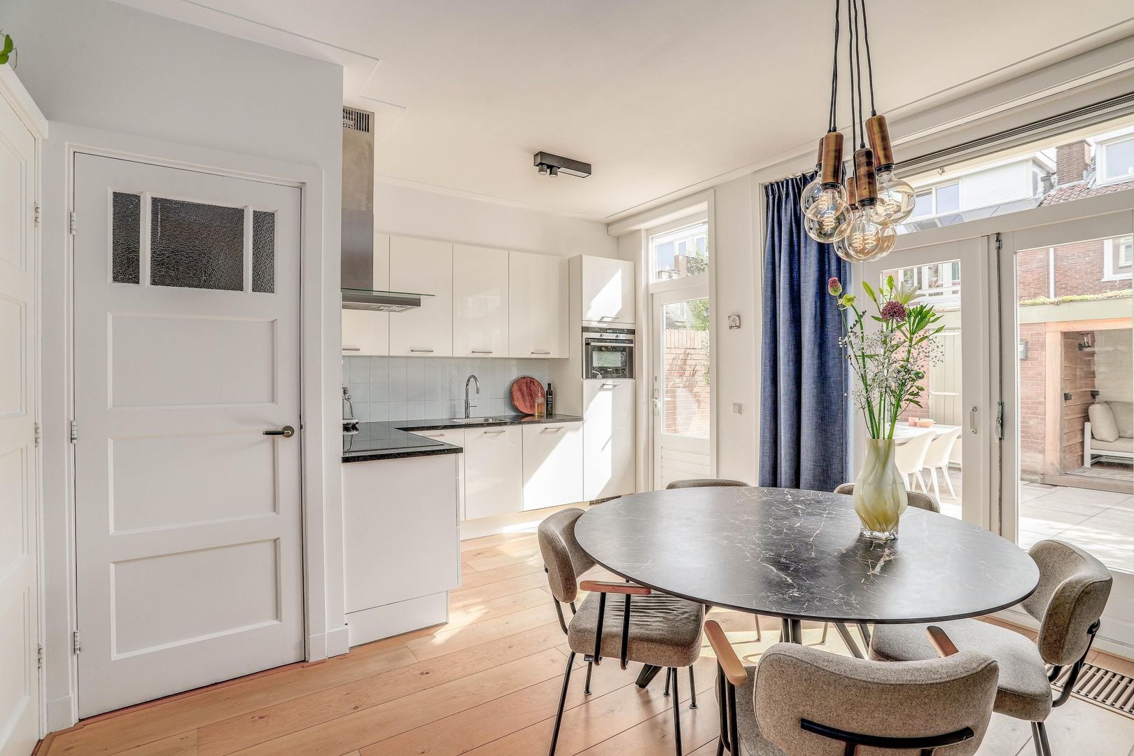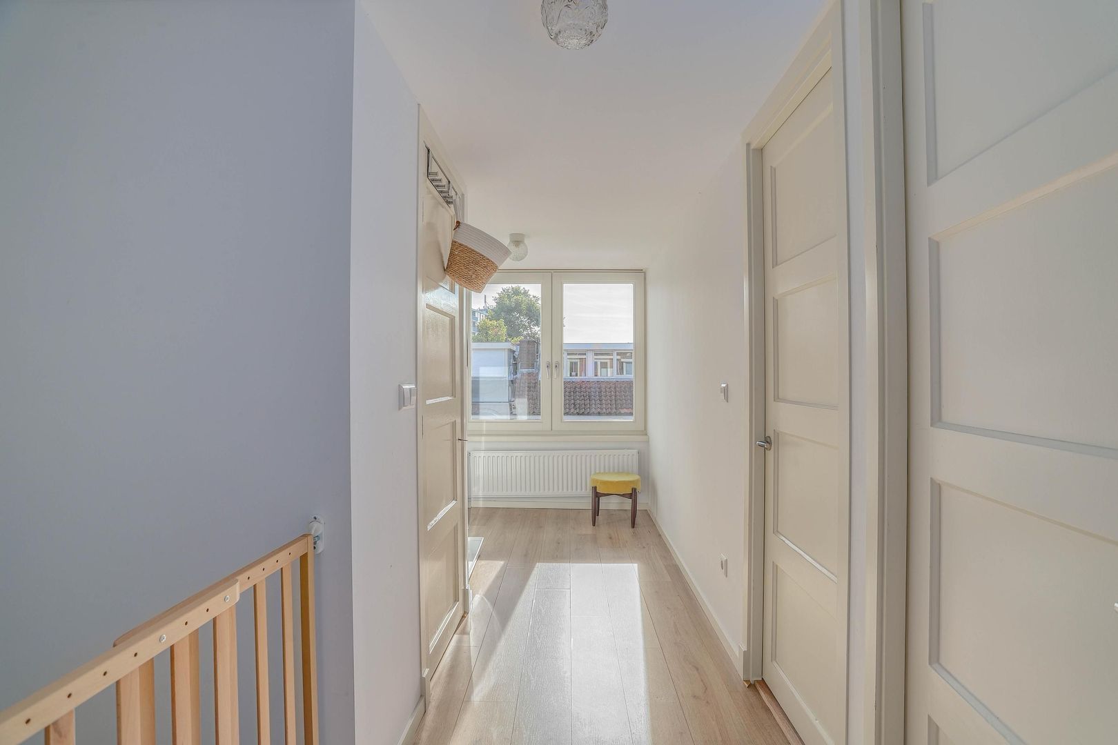 De woonkamer is uitgevoerd met de charmante en-suite deuren met een goede balans tussen de zit- en eetkamer. De open keuken heeft een verzorgde en moderne uitstraling en maakt echt onderdeel uit van de woonruimte. Middels onder andere de openslaande deuren bereik je de achtertuin met vele uurtjes zon die naast de berging en achterom is uitgevoerd met een fraaie veranda welke is geplaatst door de huidige bewoners. Op de eerste verdieping zijn 3 slaapkamers en een moderne badkamer aanwezig. Laatst genoemde is voorzien van een inloopdouche, tweede toilet en dubbele wastafel. Door doordachte verbouwing van de zolderverdieping is hier, door het plaatsen van een opbouw, een praktische voorzolder ontstaan. De zolder biedt opstelplaats voor de CV ketel, een ruime wasruimte en twee slaapkamers.