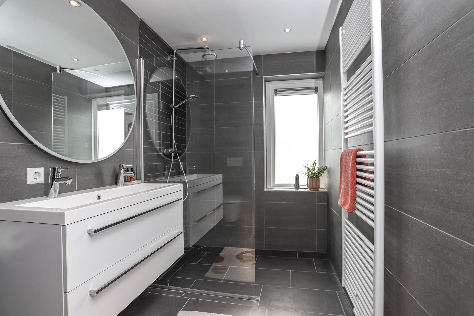 Middels de vaste trap bereik je de overloop op de eerste verdieping. Op deze verdieping bevinden zich de badkamer en drie slaapkamers, welke ook als bijvoorbeeld werkkamer of inloopkast gebruikt kunnen worden. De badkamer heeft een nette uitstraling met een donkere tegel op de muur en vloer. De badkamer beschikt over een toilet, dubbele wastafel, spiegel met licht en verwarming, inloopdouche en een handdoekenradiator. De eerste slaapkamer is aan de achterzijde van de woning gelegen, heeft een warme sfeer en beschikt over een grote inbouwkast. In de ruimte is voldoende plek voor het plaatsen van een groot tweepersoonsbed. Deze slaapkamer geeft toegang tot het balkon. Het balkon is een fijne extra buitenruimte waar je met uitzicht over het groen kan genieten van de buitenlucht.