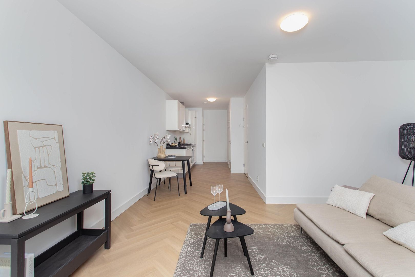Het appartement is volledig afgewerkt met frisse wanden en plafonds en beschikt over een nieuwe PVC-vloer in visgraatmotief.