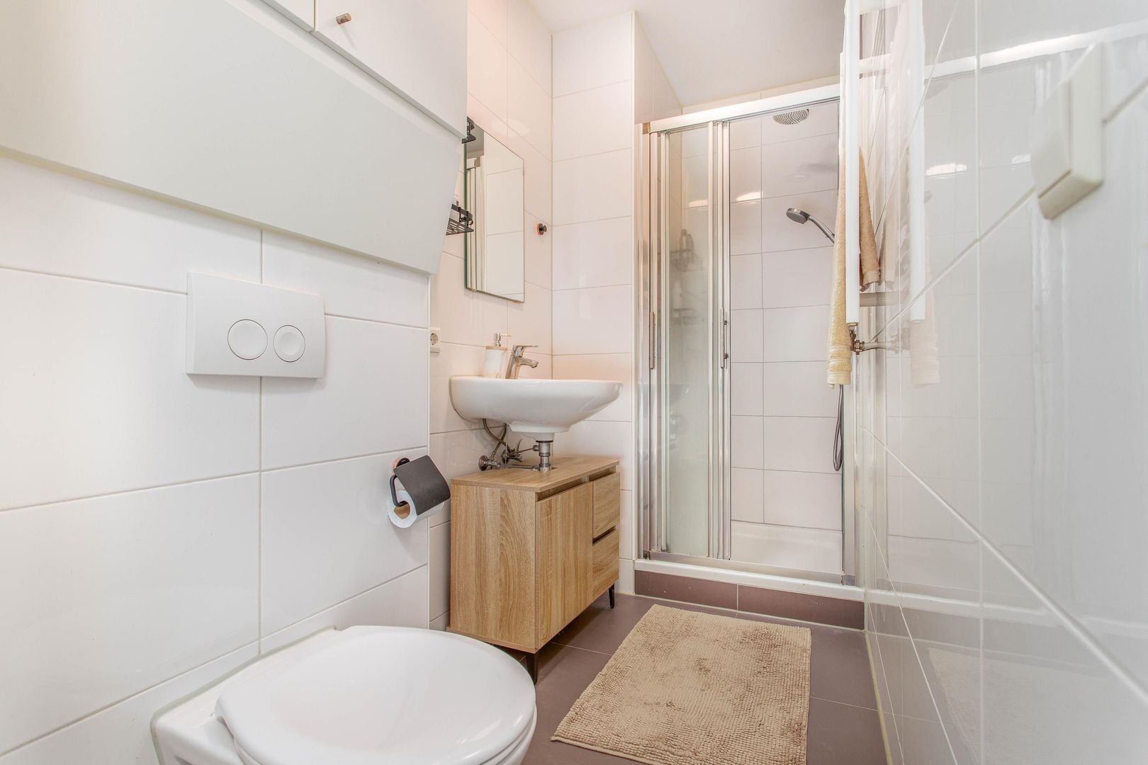 De moderne keuken is strak afgewerkt en voorzien van diverse inbouwapparatuur, waaronder een koelkast, vriezer, oven, gasfornuis, afzuigkap en vaatwasser. Vanuit de woonkamer heb je toegang tot de ruime en lichte slaapkamer. De nette badkamer, gelegen naast de slaapkamer, is uitgerust met een douche, wastafel en toilet. De wasmachine zit naast de keuken in een aparte kast.