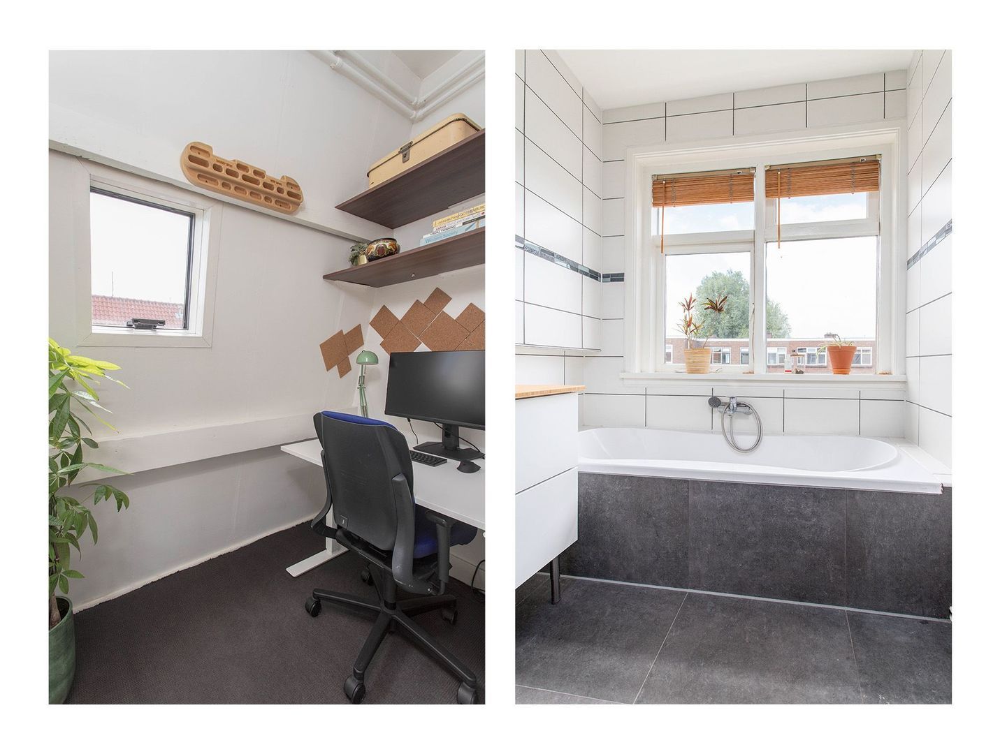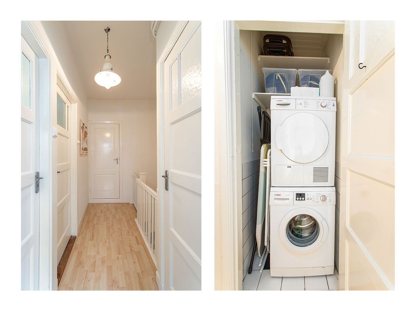 Overloop met een aparte ruimte voorzien van aansluitingen voor een wasmachine en droger. Aan de voorzijde bevindt zich een royale slaapkamer met een vaste kast. Aan de achterzijde ligt een tweede ruime slaapkamer, groot genoeg voor een groot tweepersoonsbed en een linnenkast. Daarnaast is er aan de voorzijde een kantoor kamer gerealiseerd met dakraam. De moderne badkamer is uitgerust met een ligbad, een inloopdouche, een wastafelmeubel en een designradiator.