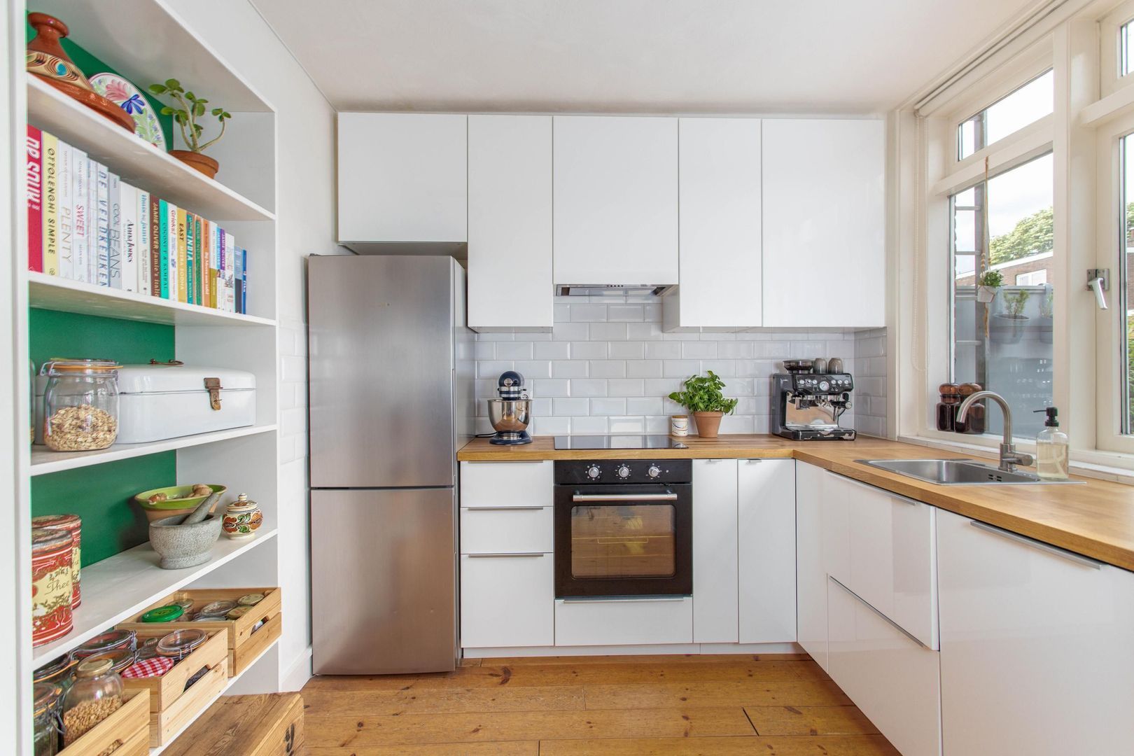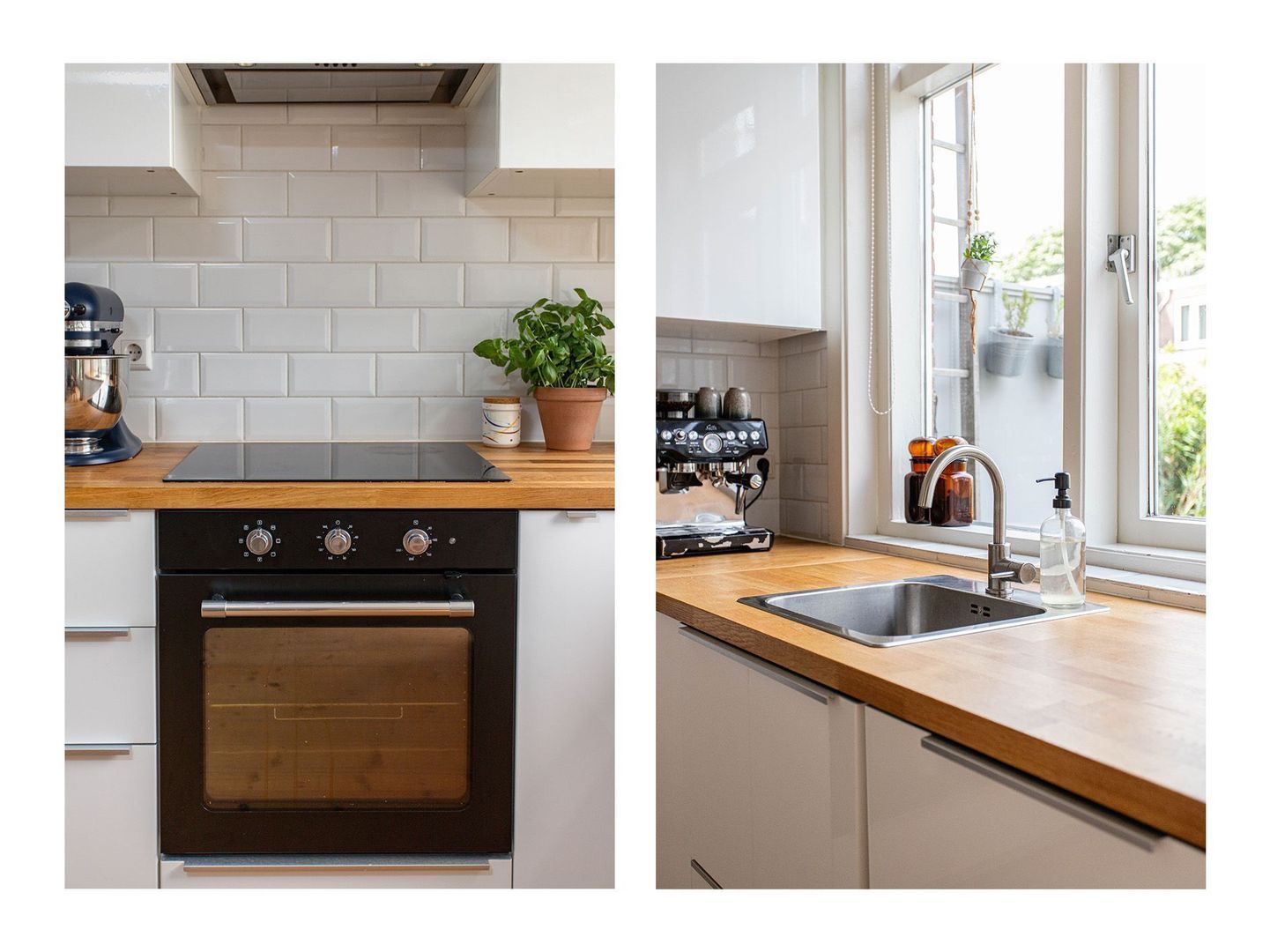 Overloop met toilet en trapopgang naar de tweede verdieping. Op de overloop is een garderobe gemaakt, ideaal om al je jassen en schoenen op te bergen of te gebruiken als voorraadkast en opbergplek voor de stofzuiger. De lichte woonkamer is voorzien van een houten vloer en beschikt over openslaande deuren naar het balkon aan de achterzijde. Momenteel is aan de voorzijde de gezellige woonkamer gemaakt. Achter is er genoeg ruimte om een grote eettafel te plaatsen. Aangrenzend bevindt zich tevens de moderne open keuken, uitgerust met diverse inbouwapparatuur, waaronder een inductiekookplaat, afzuigkap, oven, vaatwasser en een koelkast. Aan de achterzijde zijn openslaande deuren naar het balkon op het westen. Heerlijk om van de zon te genieten.