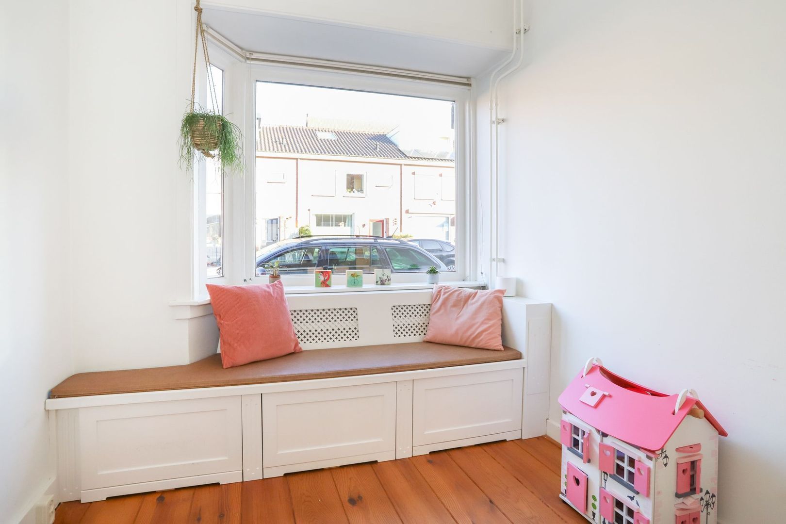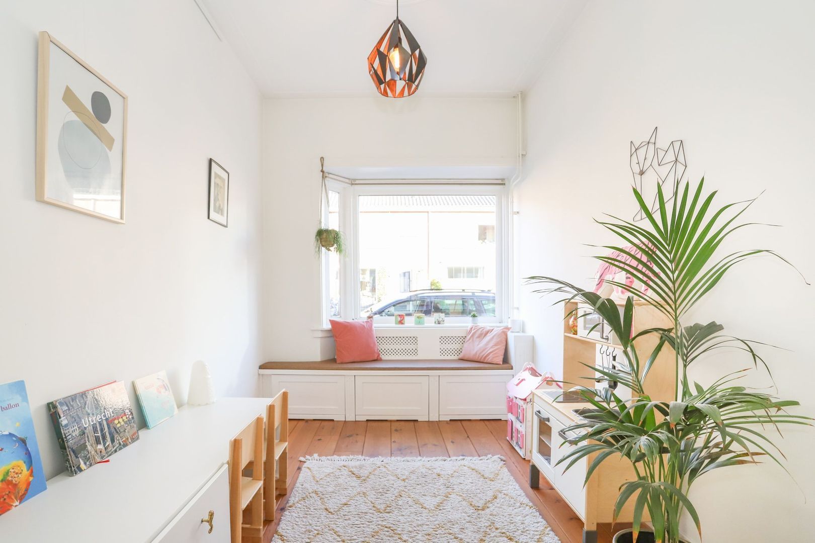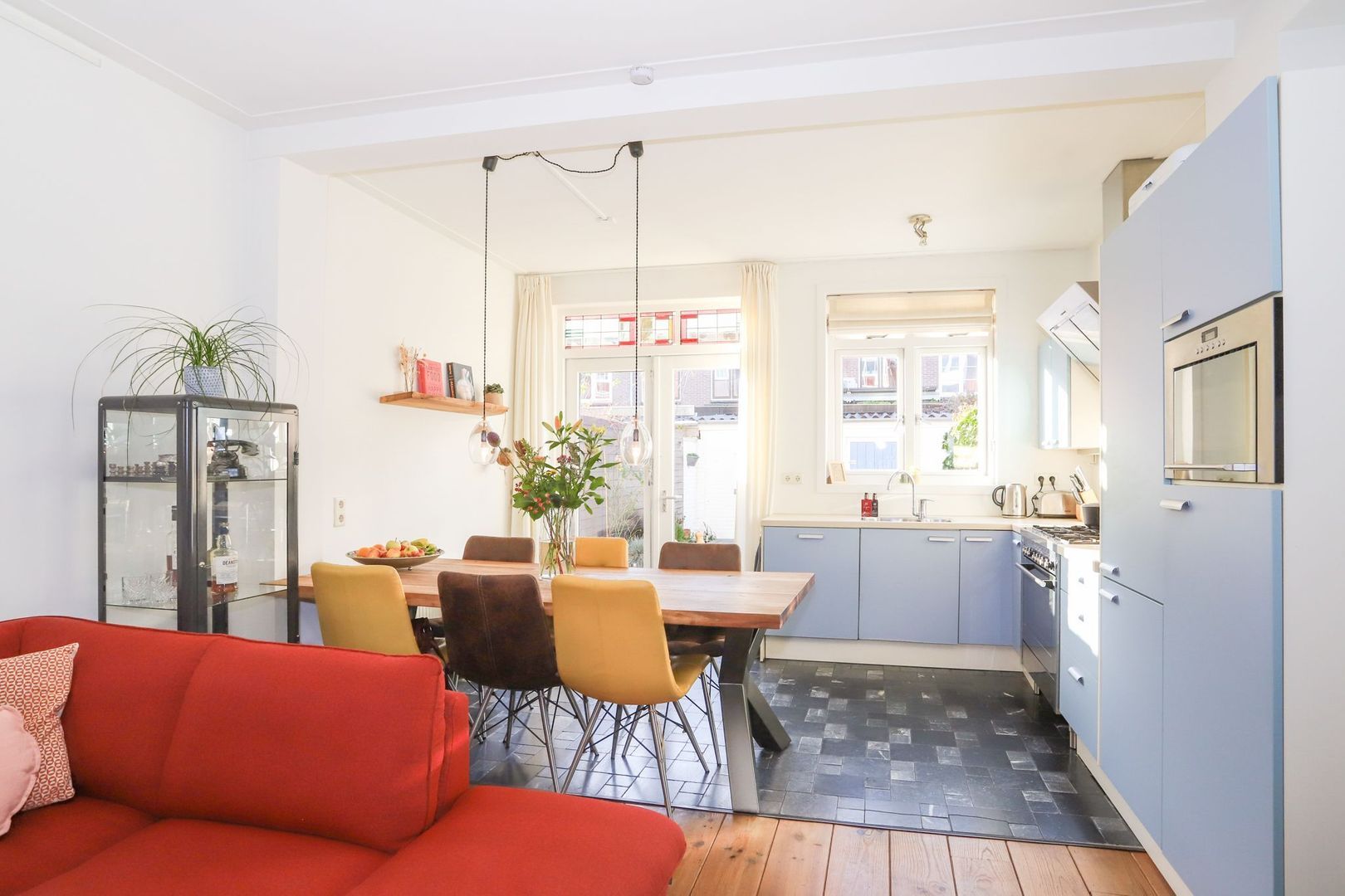 Begane grond: Entree met garderobe voorzien van originele granito vloer en wandtegels. Separate toilet. De woonkamer is voorzien van een nette parketvloer en glad gestuukte wanden. Aan de voorzijde van de woning is de speelhoek aanwezig met erker, uiteraard kun je hier ook een fijne werkplek/ leeshoek creëren. In het midden van de woning is de zithoek aanwezig met opbergkast. Aan de achterzijde tref je de fijne en lichte woonkeuken aan. De keuken is voorzien van een karakteristieke tegelvloer, openslaande deuren naar de zonnige achtertuin en glas-in loodramen. Verder is de keuken uitgevoerd met een 6-pits gasfornuis, afzuigkap, oven, magnetron, koelkast en vaatwasser.
