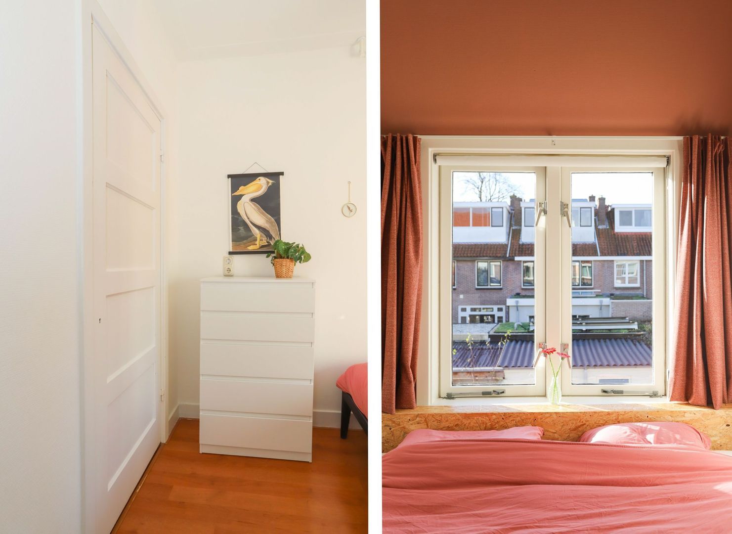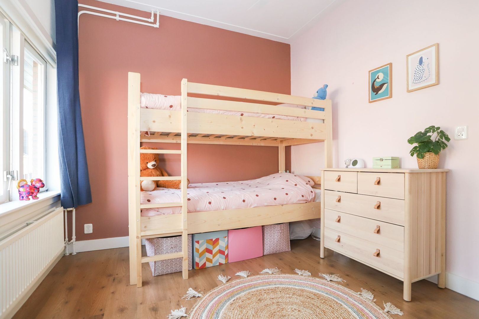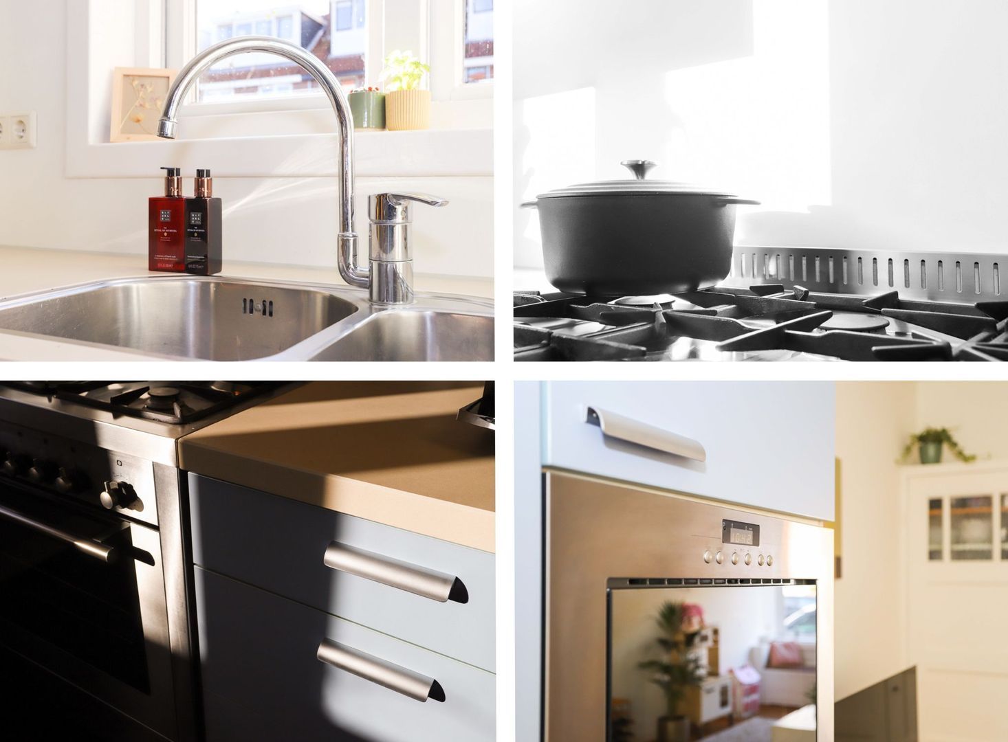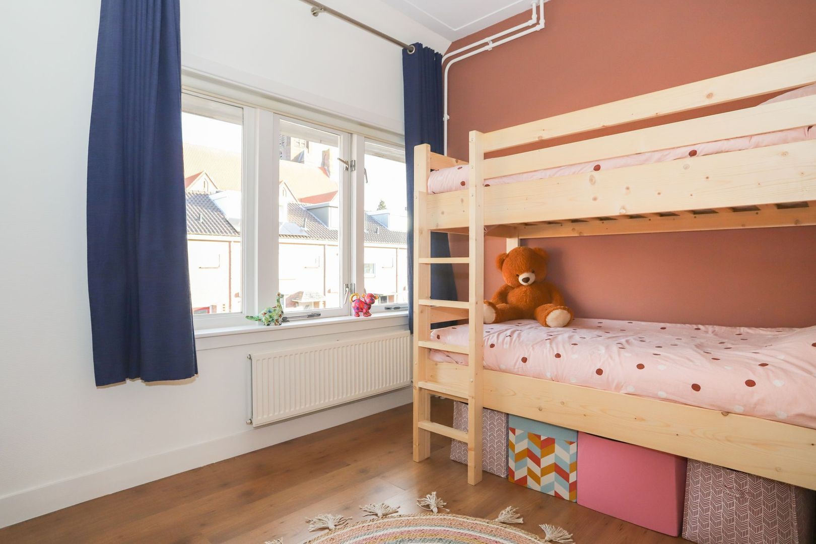 Begane grond: Entree met garderobe voorzien van originele granito vloer en wandtegels. Separate toilet. De woonkamer is voorzien van een nette parketvloer en glad gestuukte wanden. Aan de voorzijde van de woning is de speelhoek aanwezig met erker, uiteraard kun je hier ook een fijne werkplek/ leeshoek creëren. In het midden van de woning is de zithoek aanwezig met opbergkast. Aan de achterzijde tref je de fijne en lichte woonkeuken aan. De keuken is voorzien van een karakteristieke tegelvloer, openslaande deuren naar de zonnige achtertuin en glas-in loodramen. Verder is de keuken uitgevoerd met een 6-pits gasfornuis, afzuigkap, oven, magnetron, koelkast en vaatwasser.
