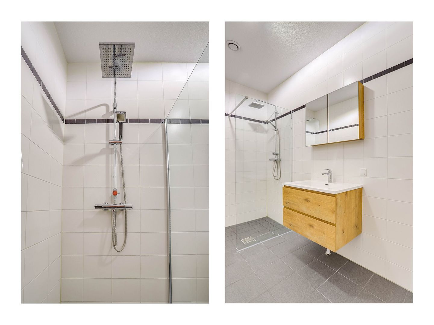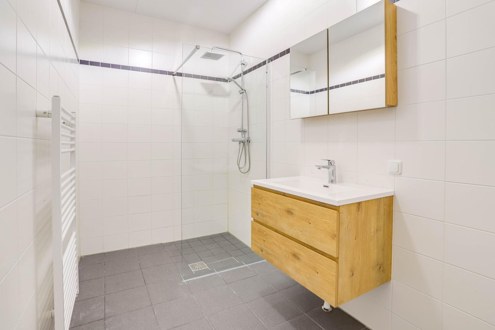 De badkamer is tussen de slaapkamer en woonkamer in gelegen. De badkamer is voorzien van een ruime inloopdouche en een vernieuwde wastafel met wastafelmeubel, deze voegt kleur toe in de badkamer en bied veel opslagruimte.