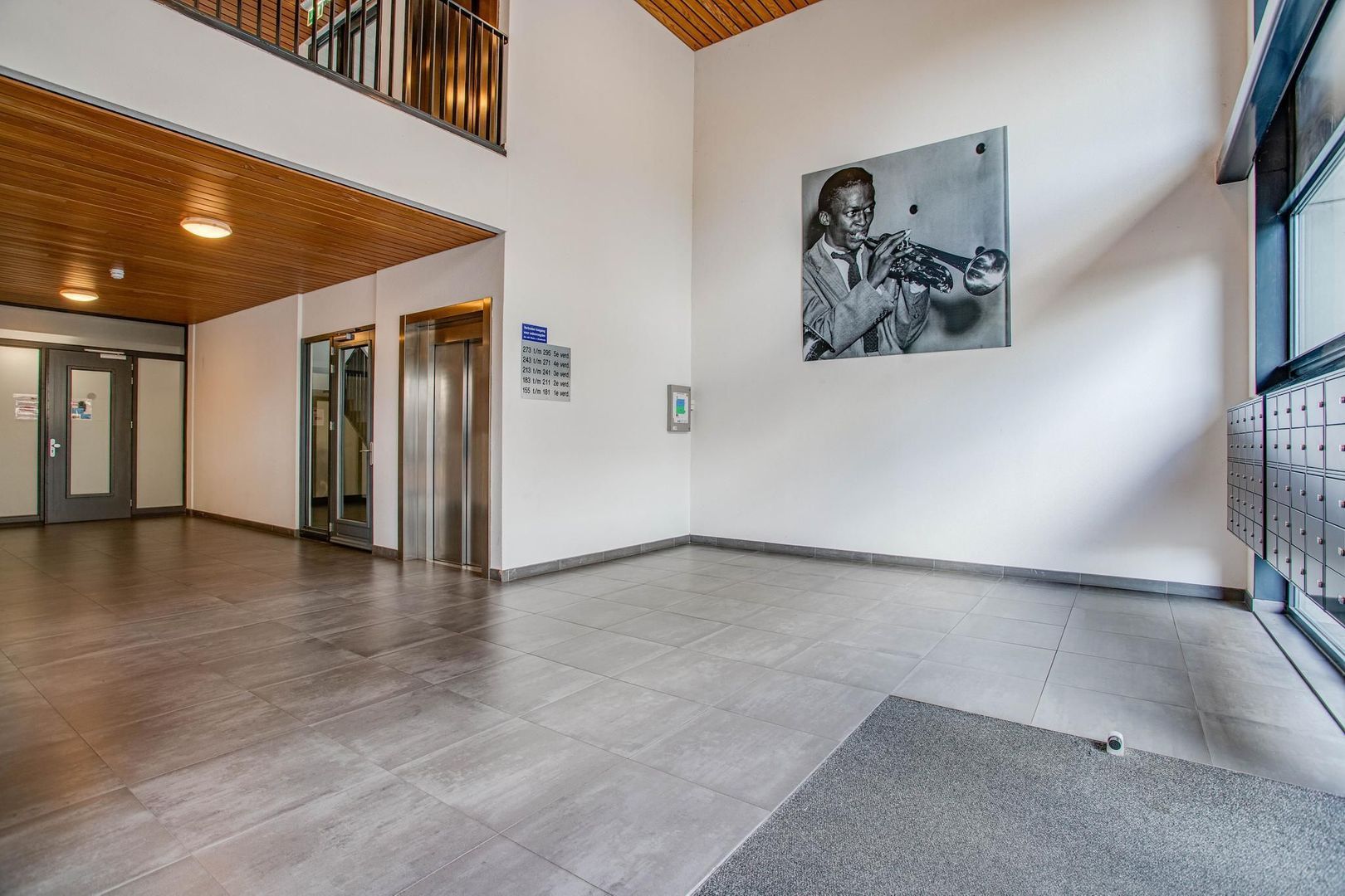 Gezamenlijke entree met brievenbussen, lift en trapopgang. De gezamenlijke entree geeft toegang tot de parkeergarage met eigen parkeerplaats.