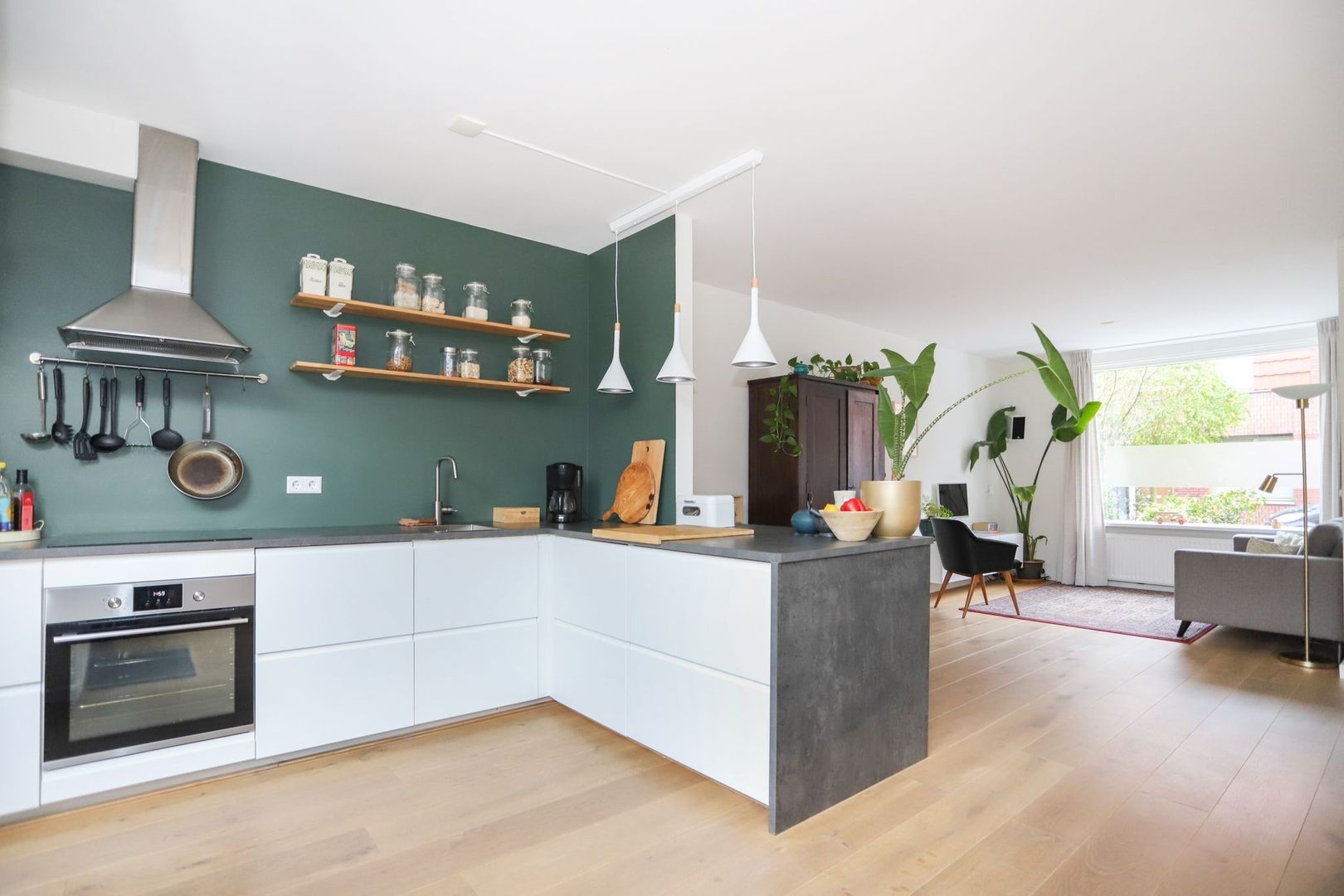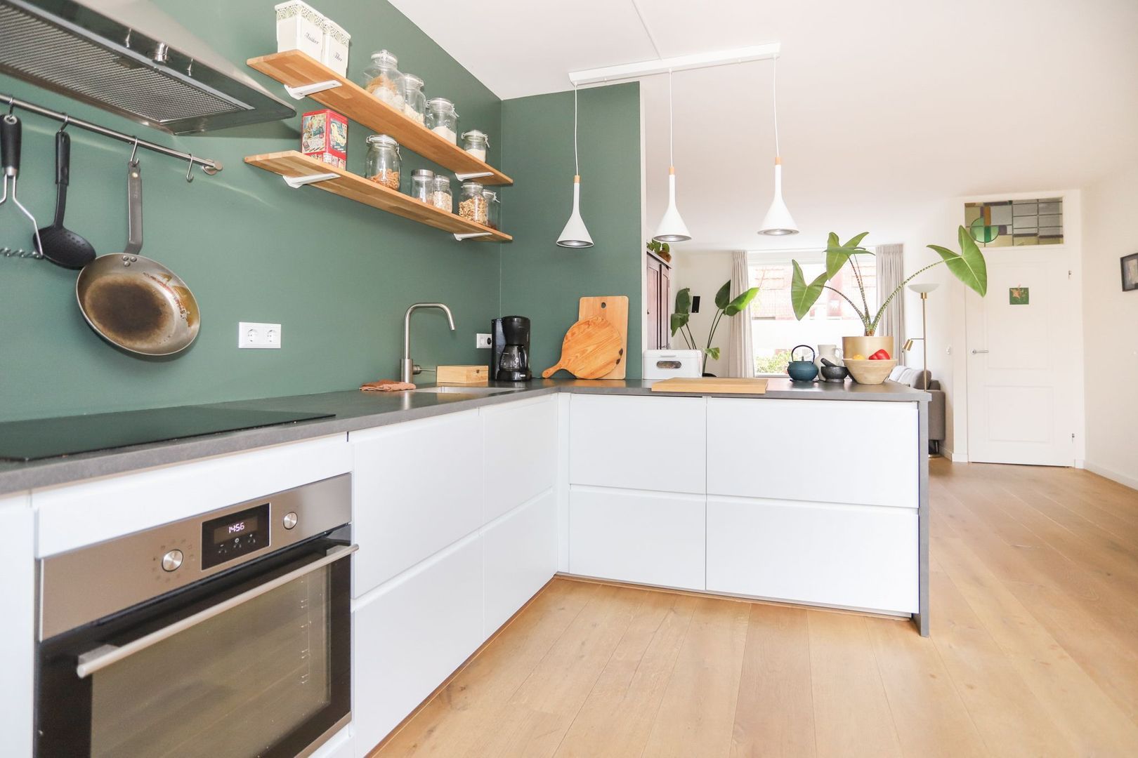 De woonkamer is heerlijk licht door de grote raampartijen aan zowel de voor- als achterzijde van de woning. De zithoek is aan de voorzijde van de woonkamer gesitueerd, de open hoekkeuken met eethoek aan de achterzijde. De keuken is voorzien van koelkast, vriezer, combi-oven, 4-pitskookplaat, afzuigkap en vaatwasmachine. Verder biedt de keuken toegang tot de bijkeuken/ berging.