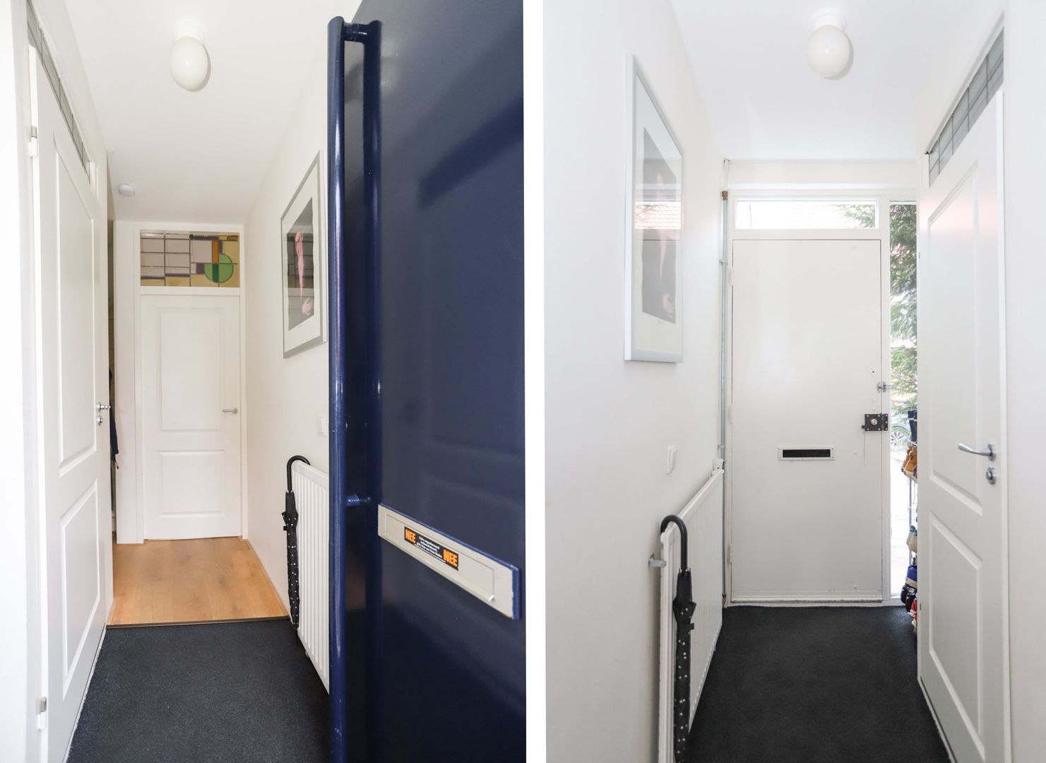 Begane grond: Ruime ontvangsthal met meterkast, toiletruimte, trapopgang naar de eerste verdieping en toegang tot de woonkamer. Boven de deur van de woonkamer is een bovenlicht aanwezig met glas-in-lood.
