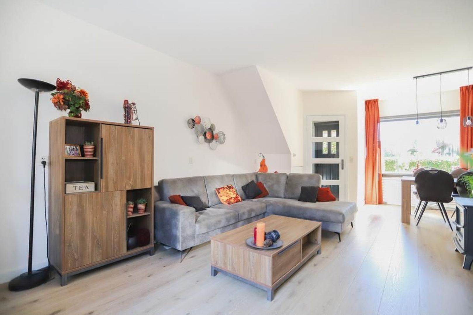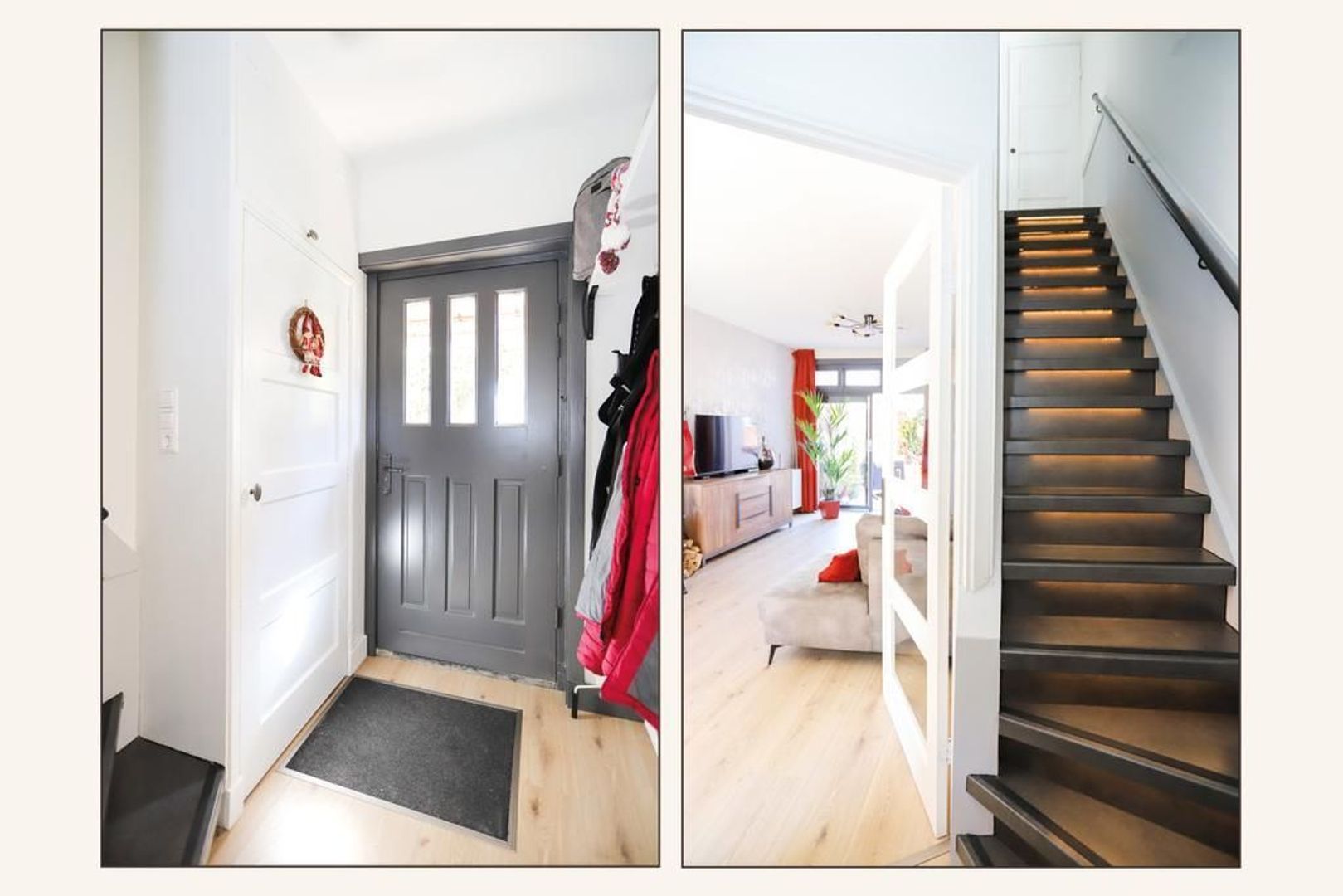 Entree met meterkast en trapopgang (met verlichting, 2021) naar de eerste verdieping. De fijne woon- en eetkamer zijn heerlijk licht en praktisch in te delen. De wanden en het plafond zijn netjes afgewerkt en de vloer is voorzien van een krasbestendig, vochtwerend en antistatische laminaatvloer (2020).
