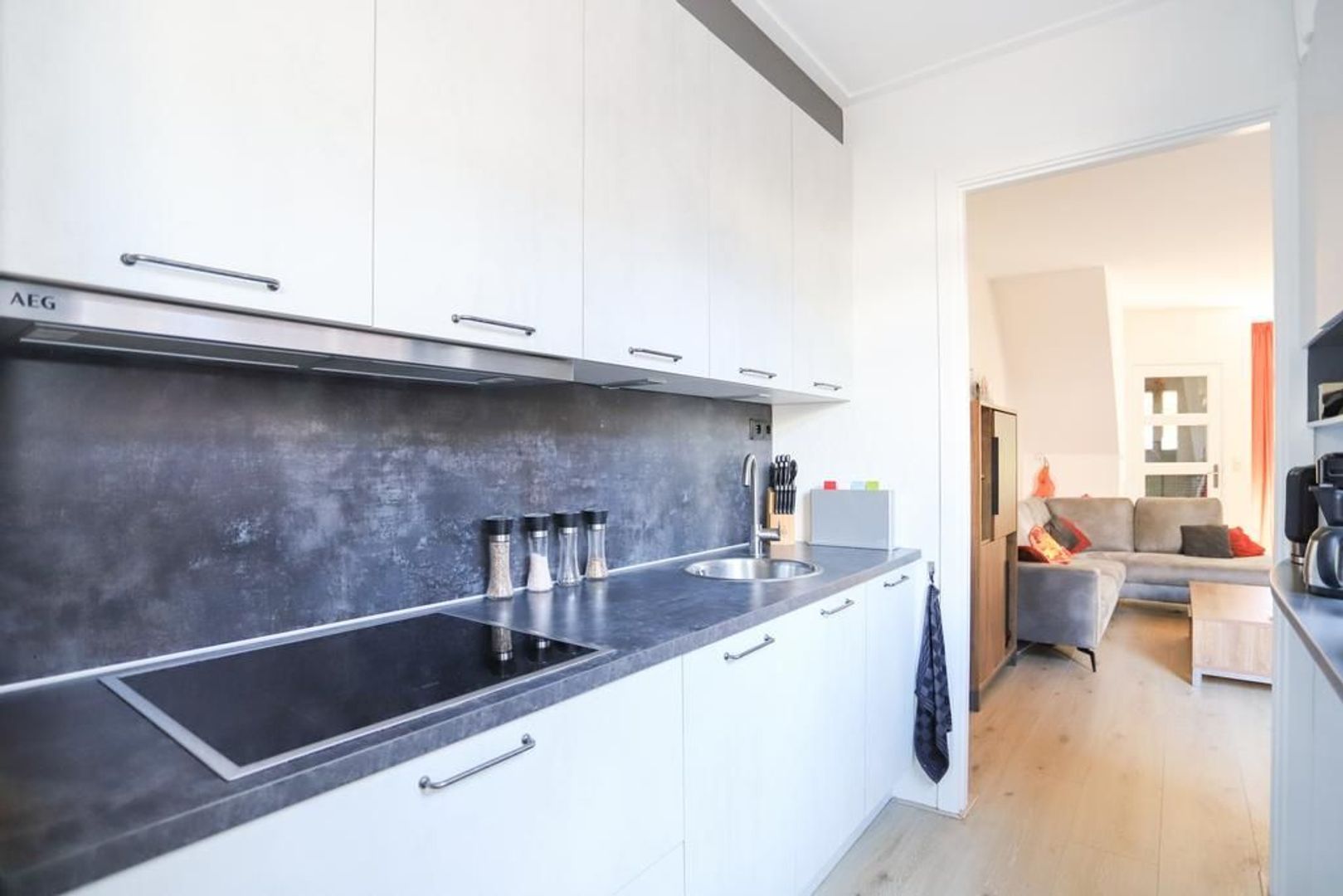 De moderne keuken (2019) is voorzien van een inductiekookplaat, afzuigkap, combi-oven, koelkast en een vaatwasser. Verder is er voldoende opbergruimte aanwezig. Via de keuken is het toilet bereikbaar met daarnaast de wasruimte v.v. de witgoedaansluiting.