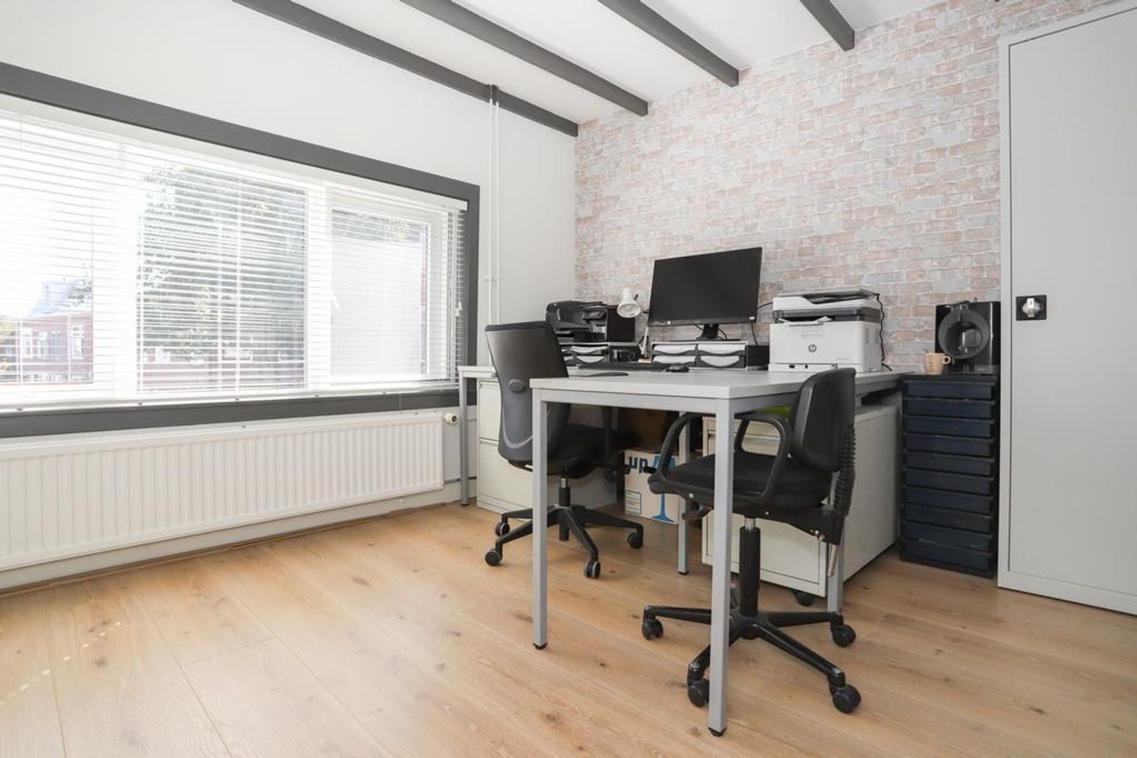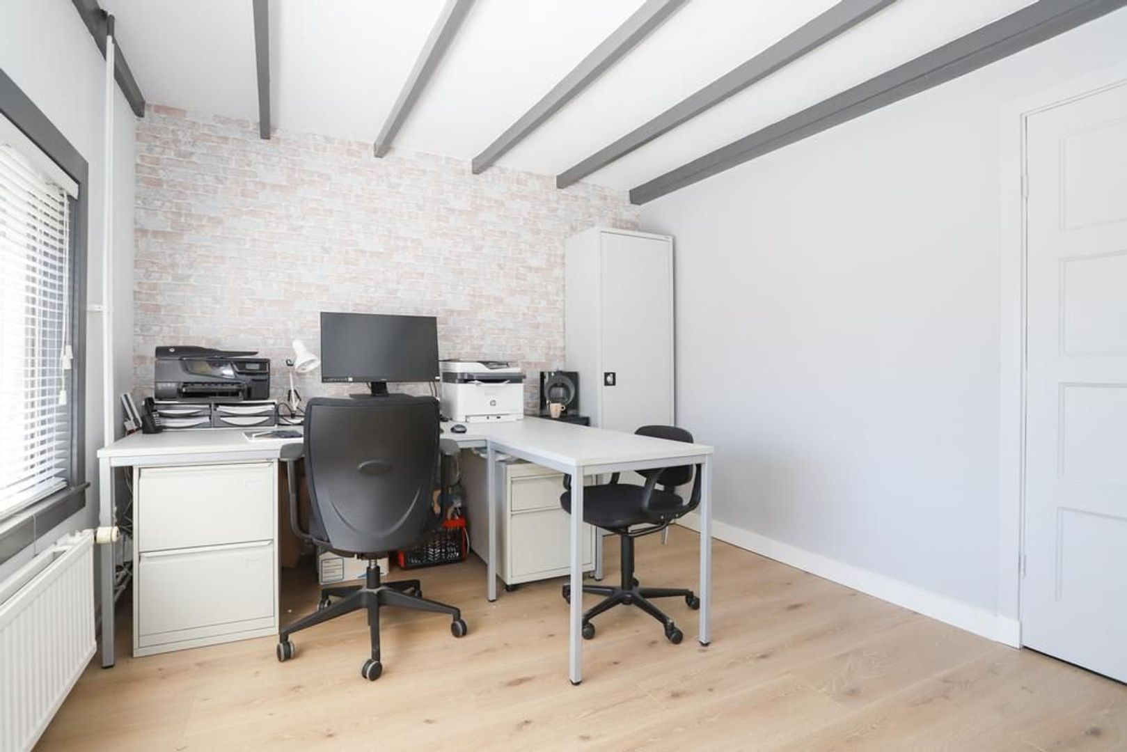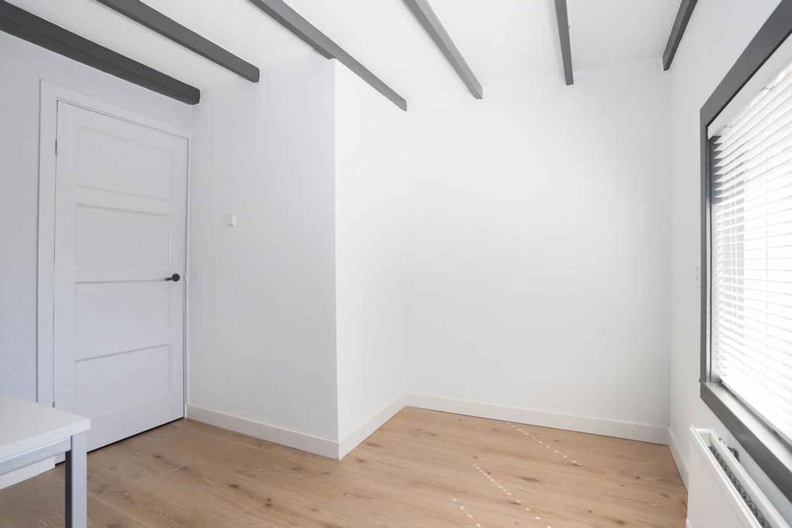 Eerste verdieping: Overloop. Op deze verdieping die in 2021 volledig gerenoveerd is zijn twee slaapkamers van ruim formaat aanwezig. Ze zijn voorzien van strak gestukte wanden, een krasbestendig, vochtwerend en antistatische laminaatvloer en van het authentieke balken plafond. De kamer aan de achterzijde beschikt ook nog over een vaste kast.