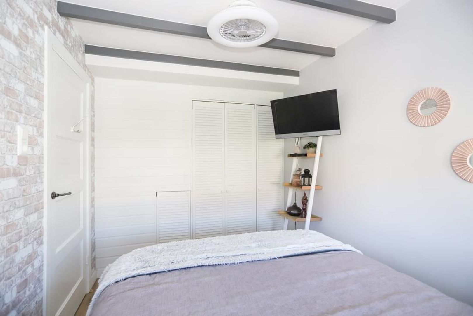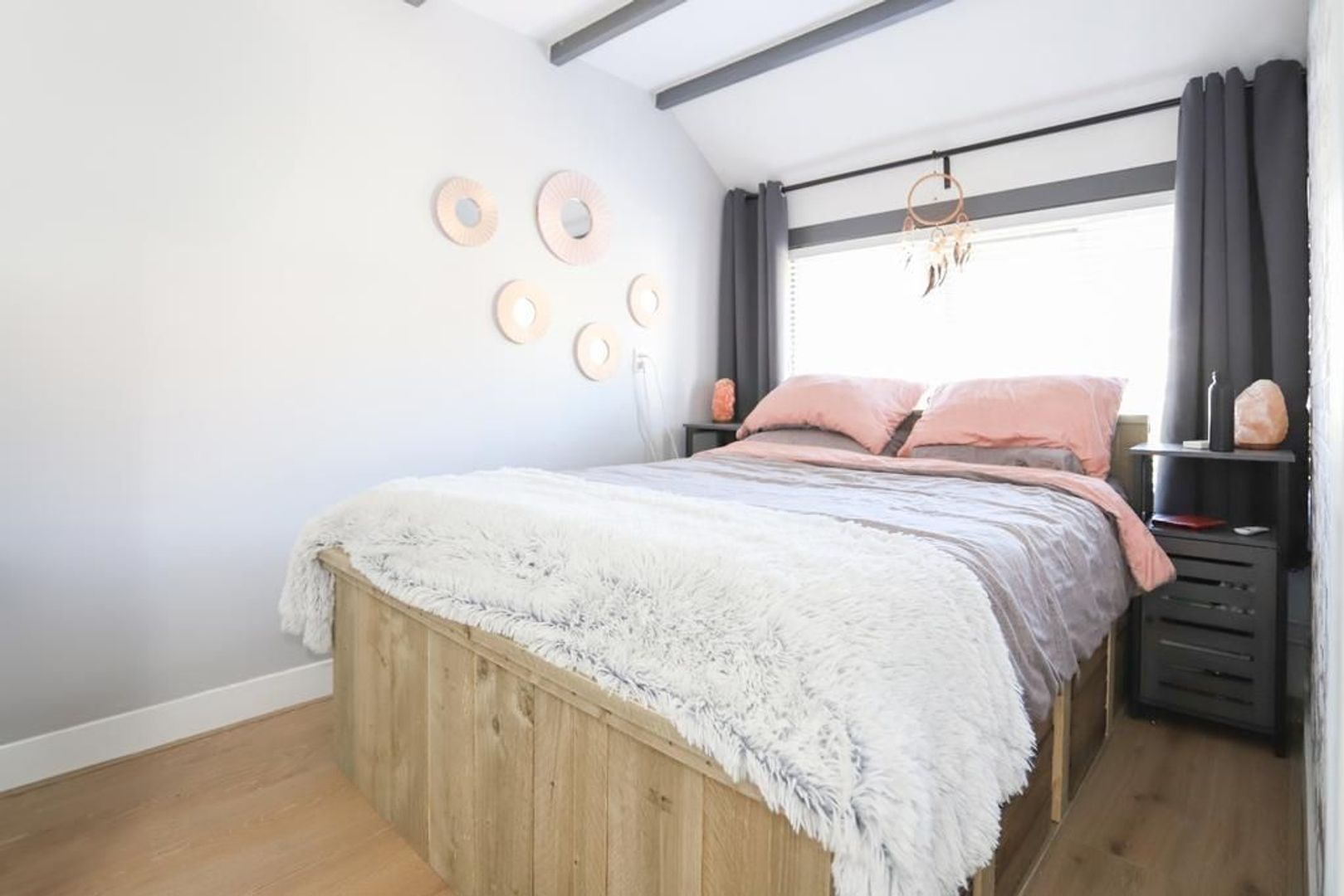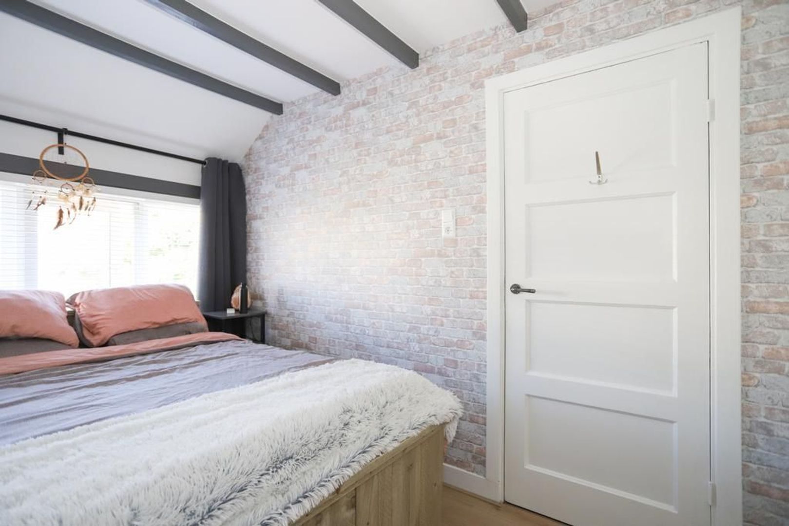 Eerste verdieping: Overloop. Op deze verdieping die in 2021 volledig gerenoveerd is zijn twee slaapkamers van ruim formaat aanwezig. Ze zijn voorzien van strak gestukte wanden, een krasbestendig, vochtwerend en antistatische laminaatvloer en van het authentieke balken plafond. De kamer aan de achterzijde beschikt ook nog over een vaste kast.