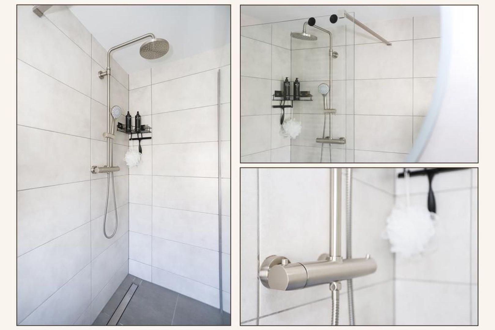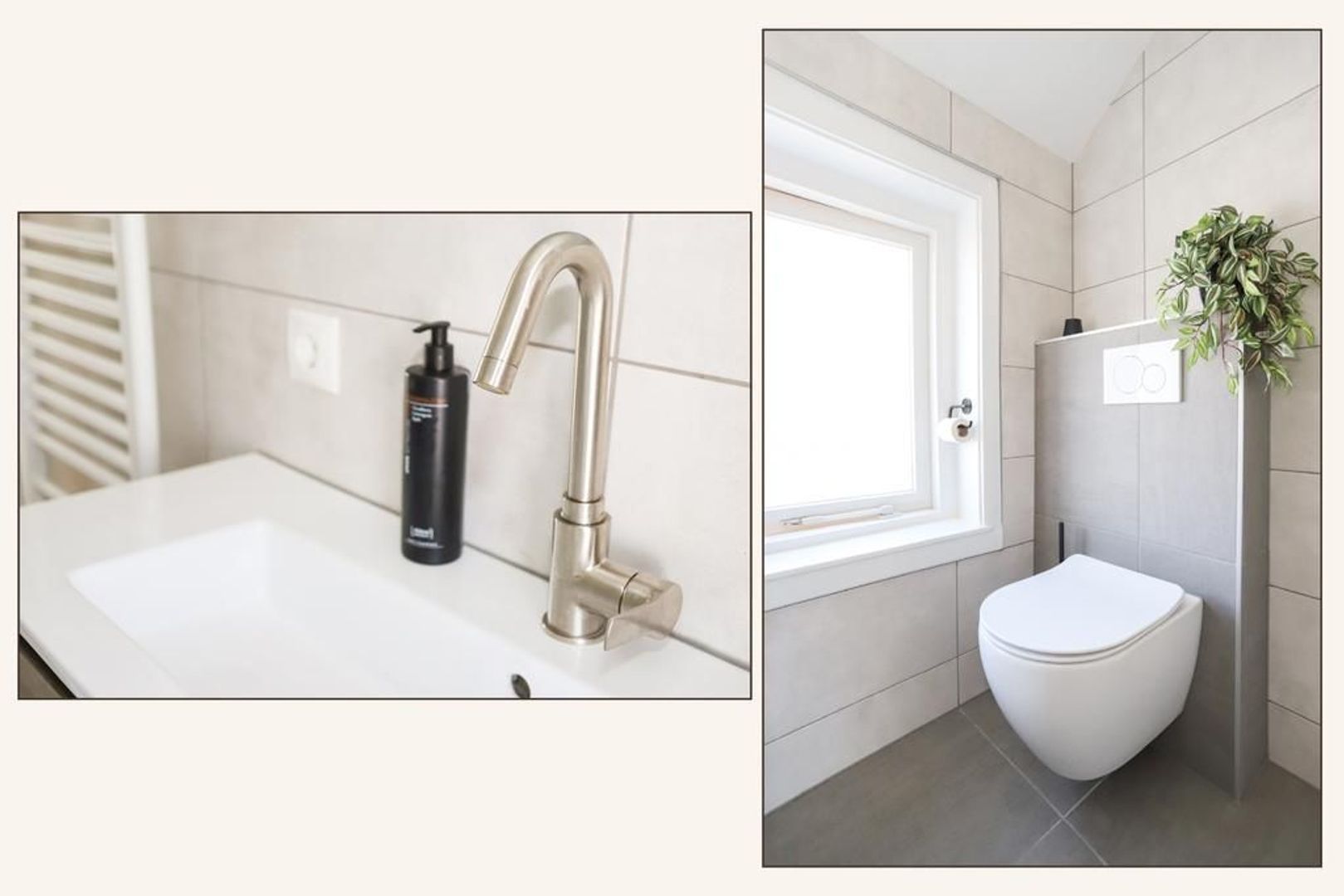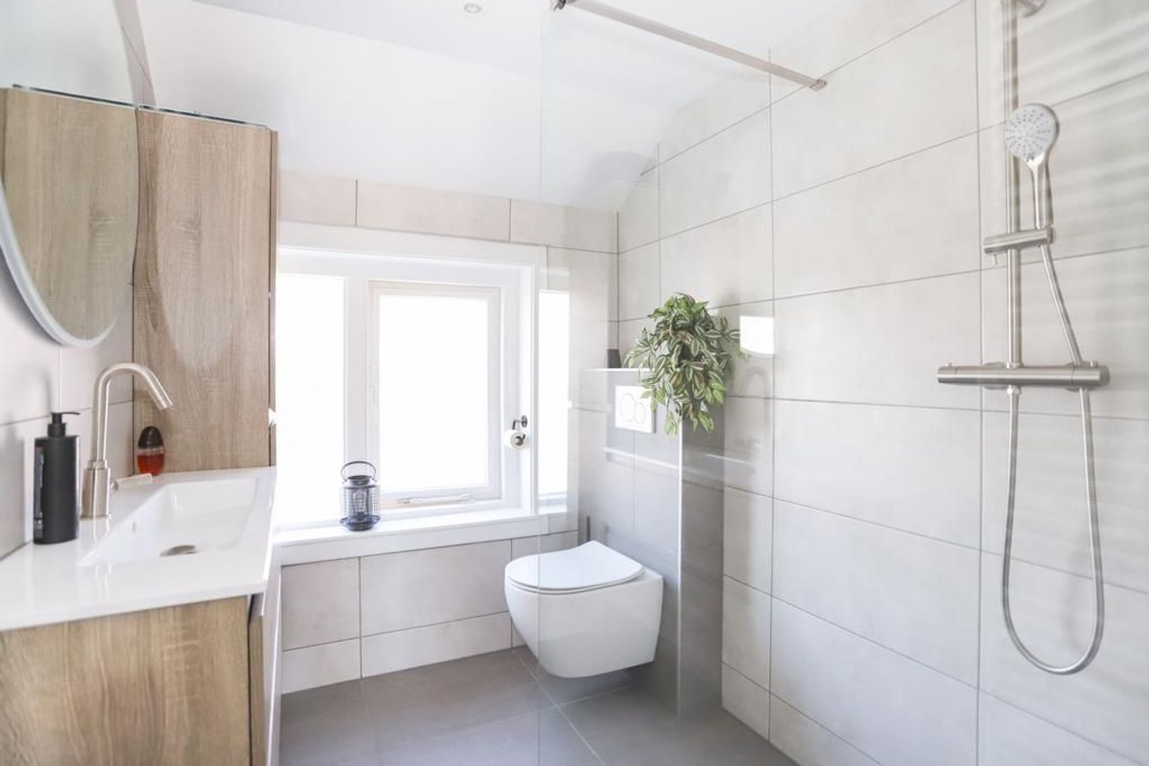 De moderne badkamer (2021) is uitgevoerd met tegelwerk en voorzien van een inloopdouche, tweede toilet en een wastafel met meubel.