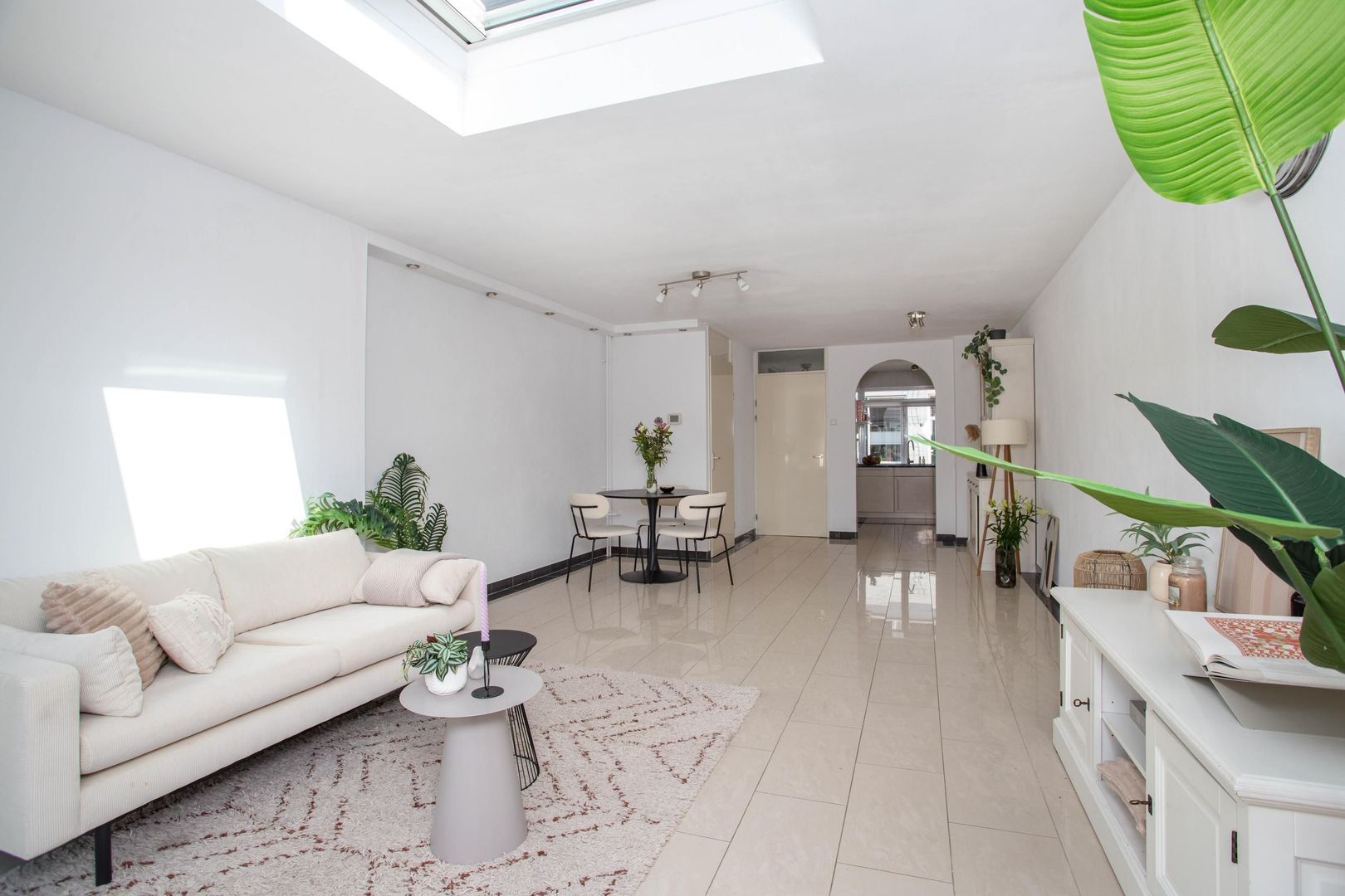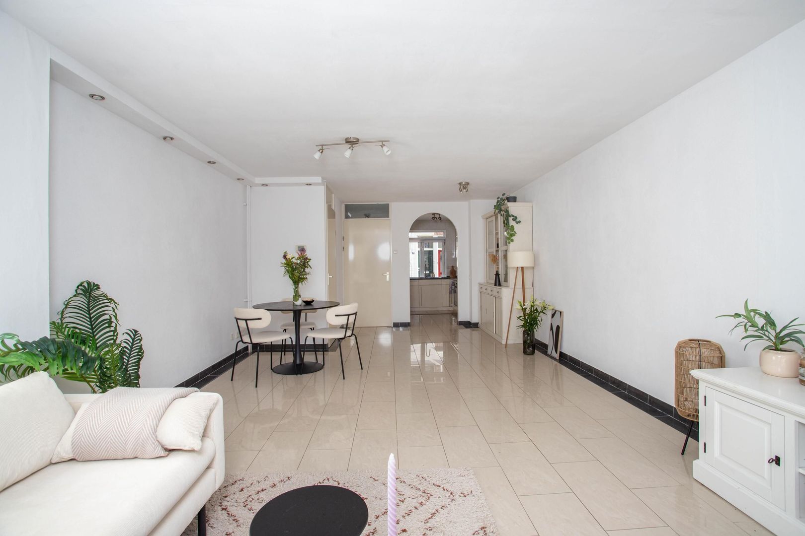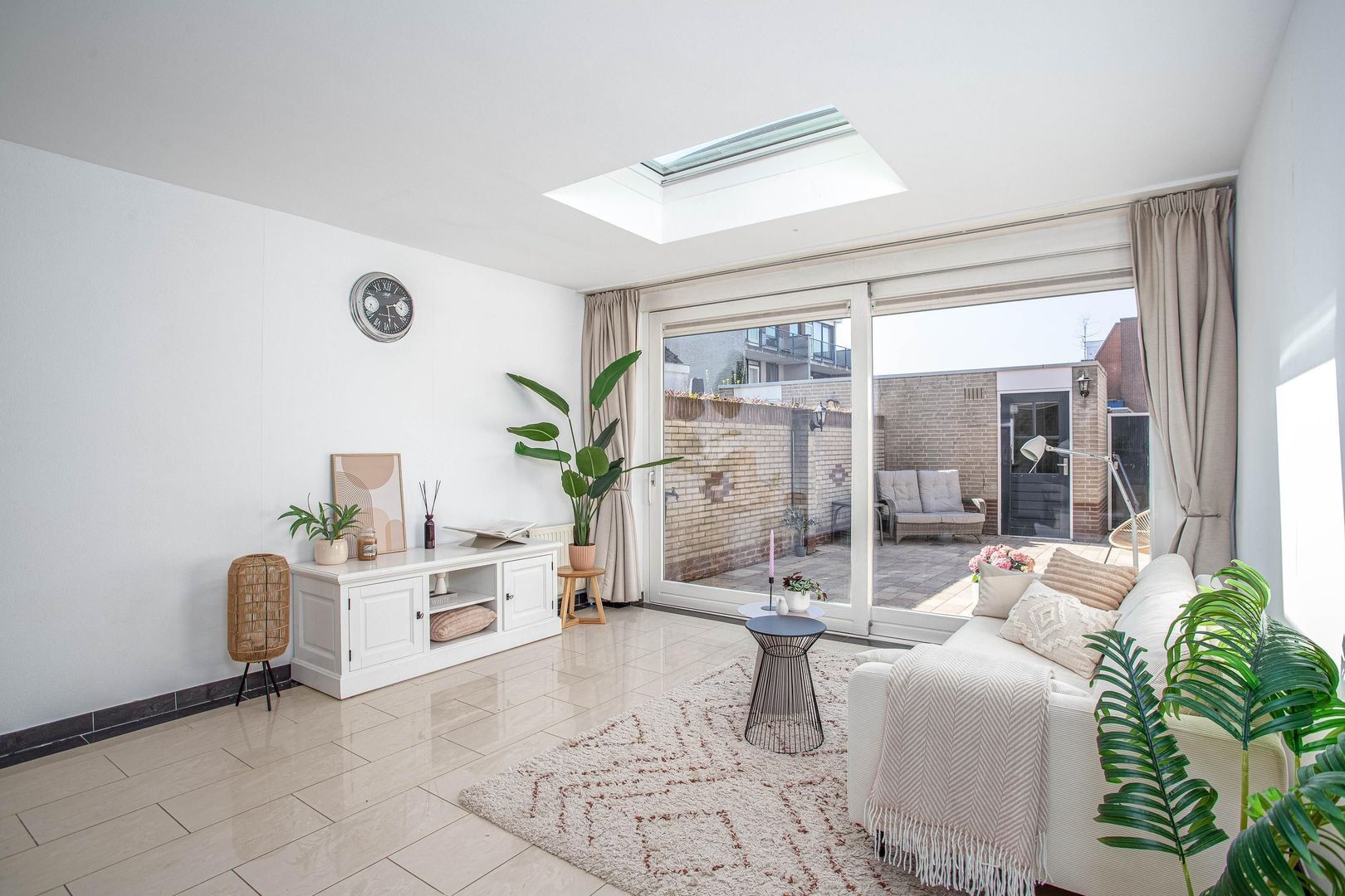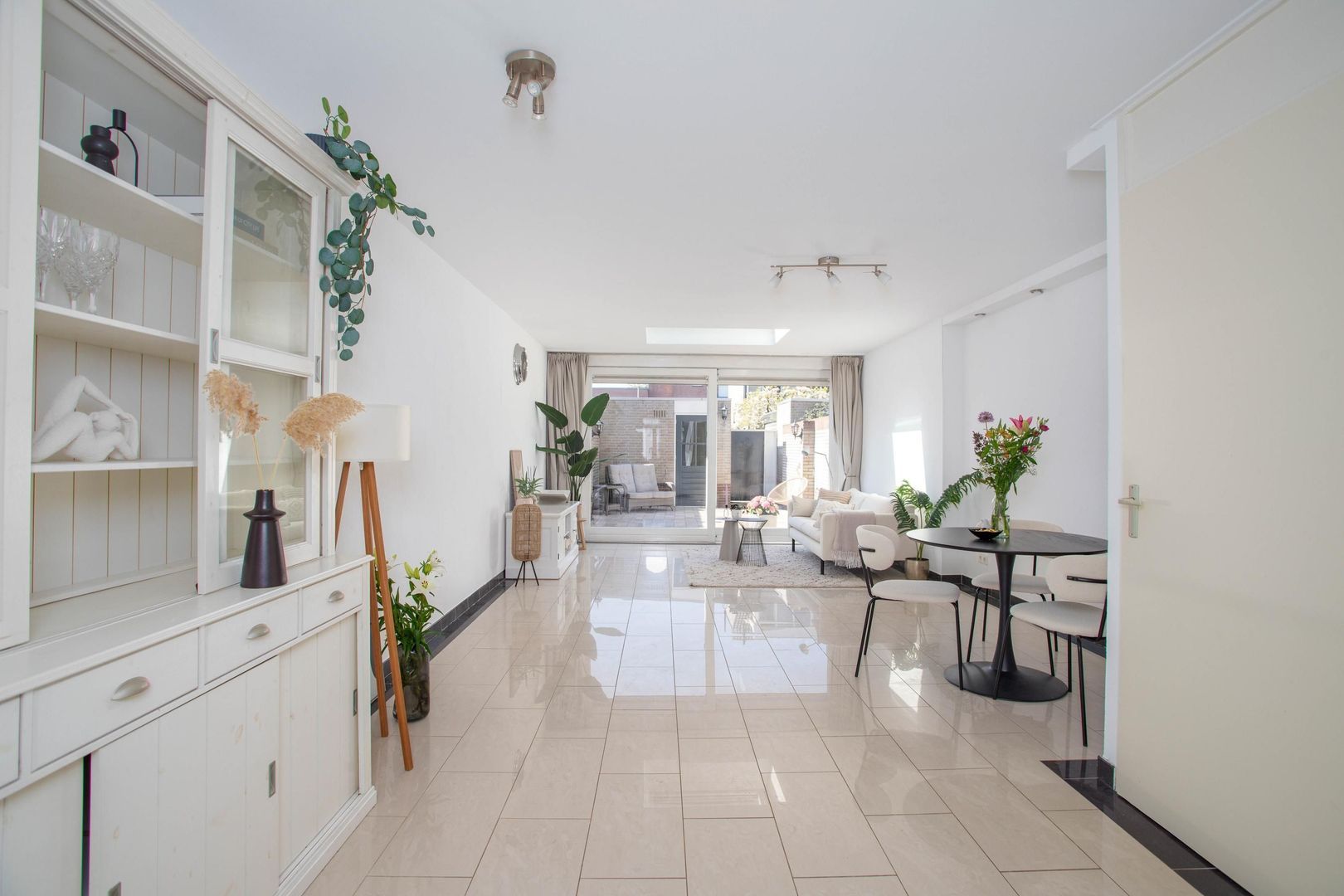 De uitgebouwde woonkamer biedt plaats aan een grote eettafel en tuingerichte zithoek. Er is veel daglicht door de schuifpui en lichtkoepel. Via de schuifpui bereik je de zonnige achtertuin van formaat die je zo dicht in de stad zelden ziet. Deze is uitgevoerd met een ruime berging. De poort aan de achterzijde geeft toegang tot een gemeenschappelijke binnenplaats en toegangshek vanaf de achterliggende Stroomstraat. Dankzij de diepte en de ligging op het westen is er vrijwel de gehele dag een plekje in de zon óf schaduw te vinden (al dan niet dankzij het elektrische zonnescherm).