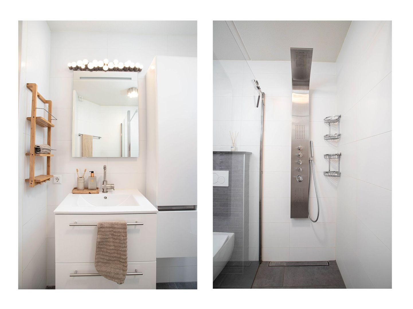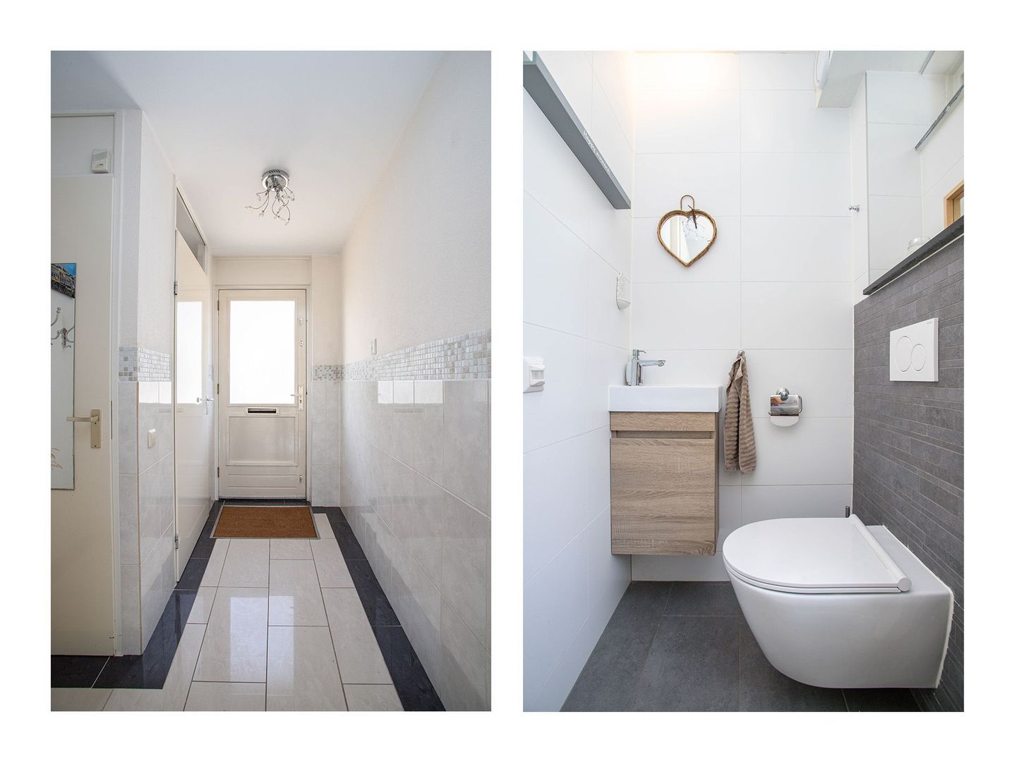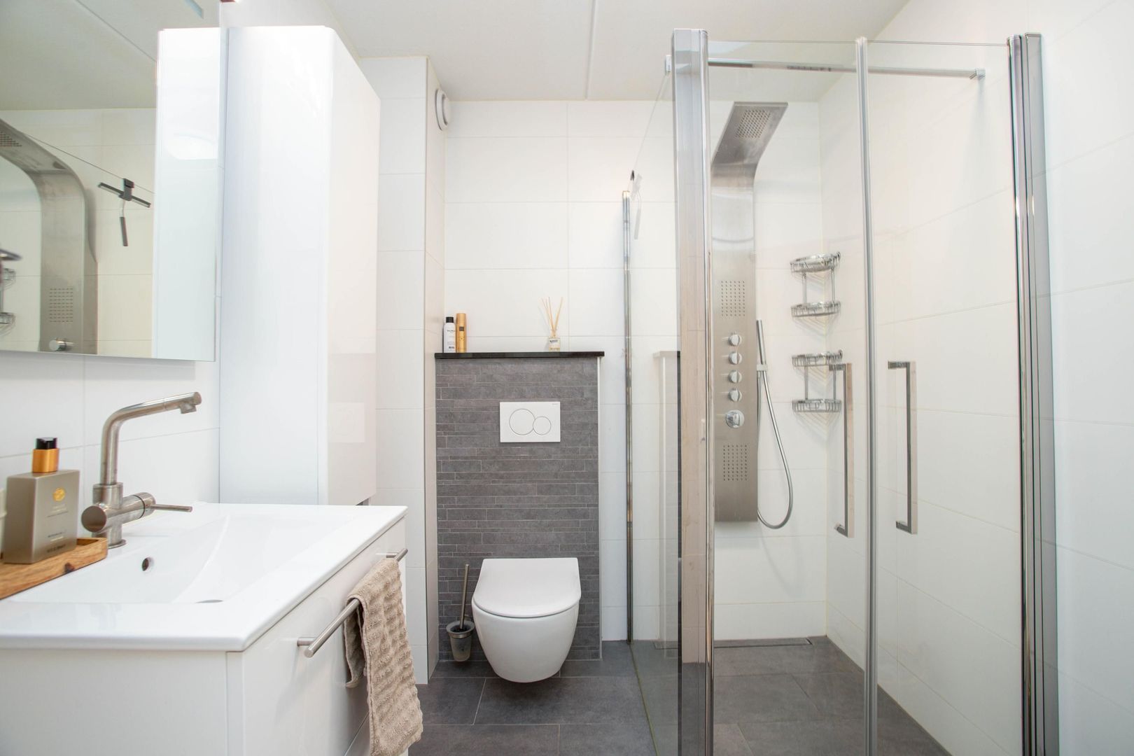 Eerste verdieping: overloop, 3 slaapkamers (allen voorzien van laminaatvloer) en moderne badkamer met douche, vaste wastafel en 2e toilet.