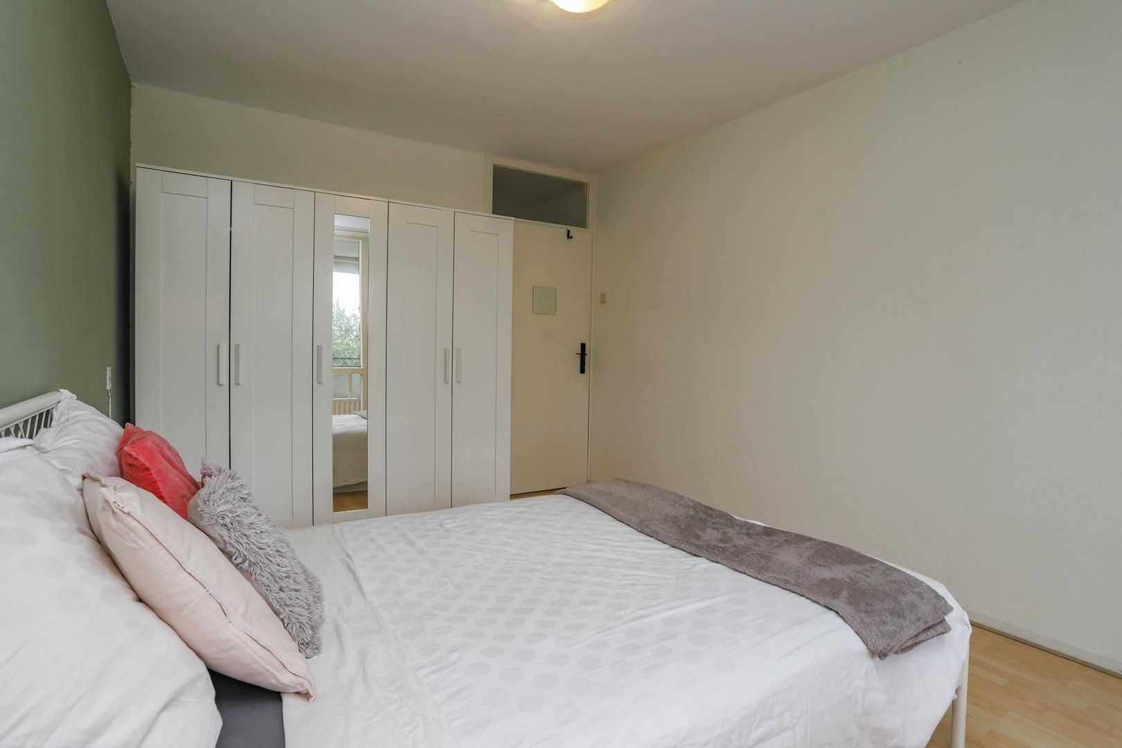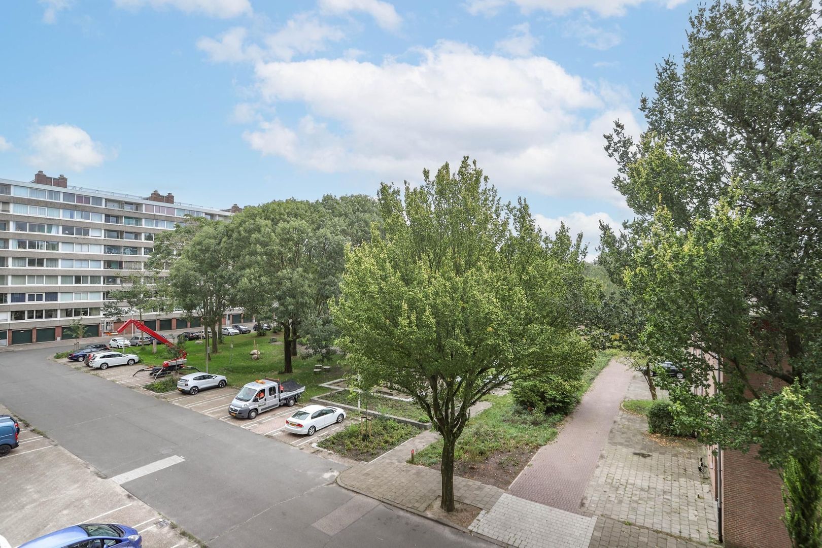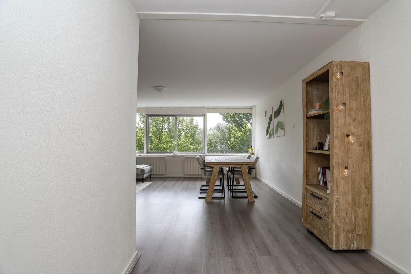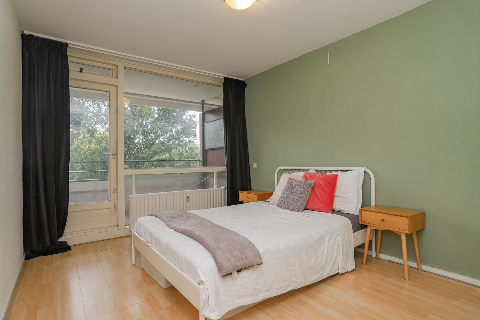 Ruime entree/hal met meterkast en inbouwkast met witgoedaansluiting. Vanuit de hal bereik je de woon- en eetkamer. De woon-/eetkamer is bijzonder ruim opgezet en is voorzien van een nette wand- en vloerafwerking. Kenmerkend aan deze ruimte zijn de grote raampartijen die bijdragen aan het fijne lichtinval. De kamer leent zich voor verschillende indelingsvarianten en er is voldoende ruimte om een gezellige zithoek en eethoek te creëren voor meerdere personen. De dichte keuken is aan de achterzijde van de woning gelegen en bereik je vanuit de hal. De keuken is verzorgd en voorzien van de volgende inbouwapparatuur: inductiekookplaat, afzuigkap en koelkast. Naast de entree/hal is er een tweede, centrale hal aanwezig die bereikbaar is vanuit de woonkamer. De hal geeft toegang tot maar liefst drie slaapkamers, het toilet en de badkamer. De badkamer heeft een moderne uitstraling en is voorzien van een inloopdouche, wastafel en wastafelmeubel. De drie slaapkamers kenmerken zich door de ruime opzet. In elke kamer is voldoende ruimte voor het creëren van een fijne slaapkamer, werkkamer of hobbyruimte. De slaapkamer aan de achterzijde van de woning geeft toegang tot het balkon. Het balkon is gelegen op het zuidoosten; op zonnige dagen kun je hier heerlijk genieten in de zon met vrij uitzicht over het groen.