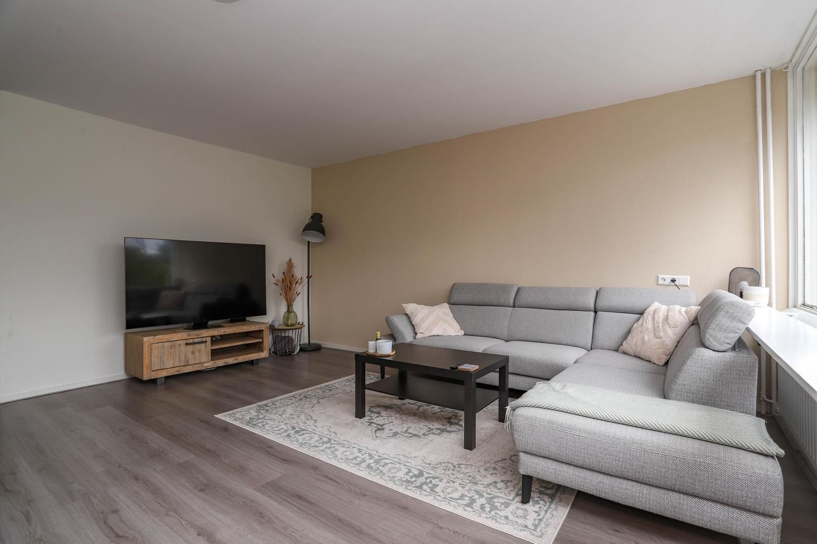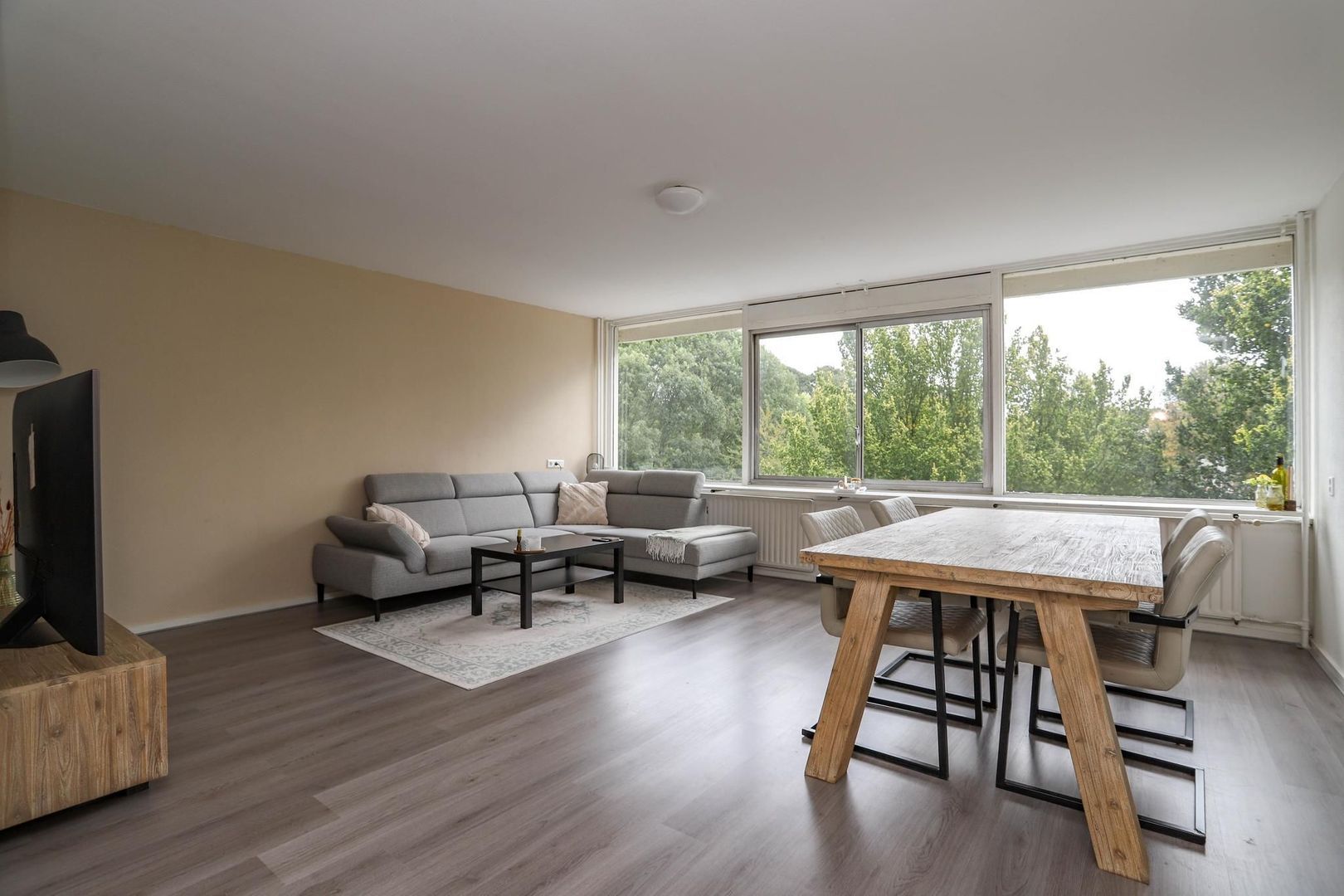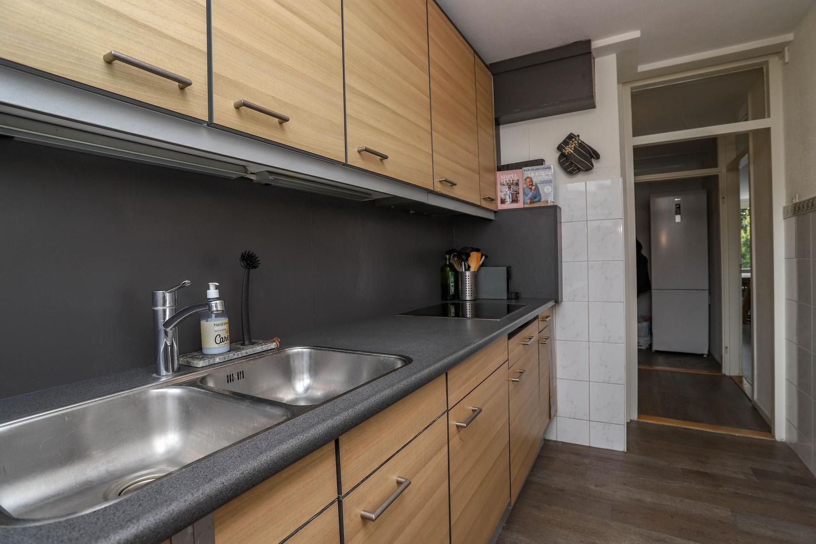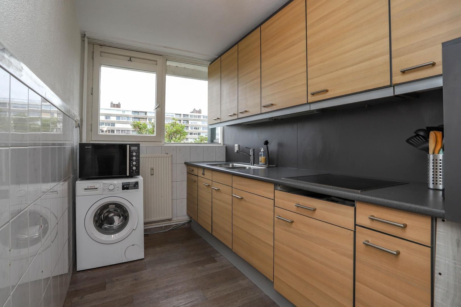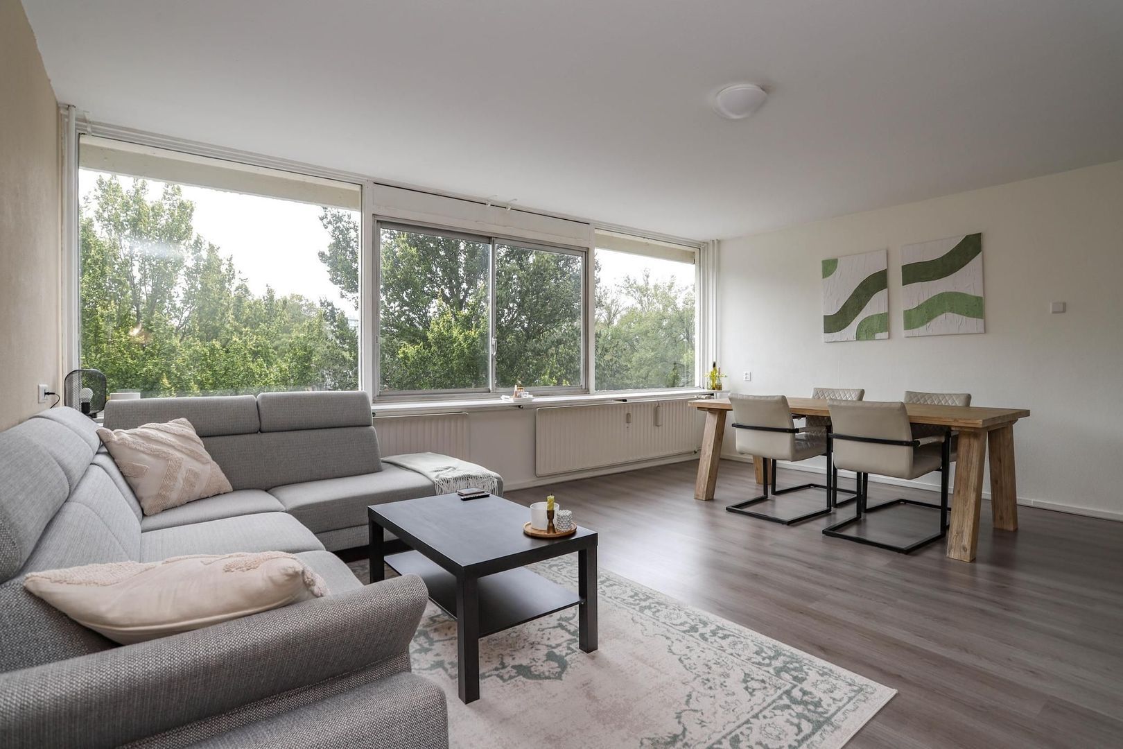 Ruime entree/hal met meterkast en inbouwkast met witgoedaansluiting. Vanuit de hal bereik je de woon- en eetkamer. De woon-/eetkamer is bijzonder ruim opgezet en is voorzien van een nette wand- en vloerafwerking. Kenmerkend aan deze ruimte zijn de grote raampartijen die bijdragen aan het fijne lichtinval. De kamer leent zich voor verschillende indelingsvarianten en er is voldoende ruimte om een gezellige zithoek en eethoek te creëren voor meerdere personen. De dichte keuken is aan de achterzijde van de woning gelegen en bereik je vanuit de hal. De keuken is verzorgd en voorzien van de volgende inbouwapparatuur: inductiekookplaat, afzuigkap en koelkast. Naast de entree/hal is er een tweede, centrale hal aanwezig die bereikbaar is vanuit de woonkamer. De hal geeft toegang tot maar liefst drie slaapkamers, het toilet en de badkamer. De badkamer heeft een moderne uitstraling en is voorzien van een inloopdouche, wastafel en wastafelmeubel. De drie slaapkamers kenmerken zich door de ruime opzet. In elke kamer is voldoende ruimte voor het creëren van een fijne slaapkamer, werkkamer of hobbyruimte. De slaapkamer aan de achterzijde van de woning geeft toegang tot het balkon. Het balkon is gelegen op het zuidoosten; op zonnige dagen kun je hier heerlijk genieten in de zon met vrij uitzicht over het groen.
