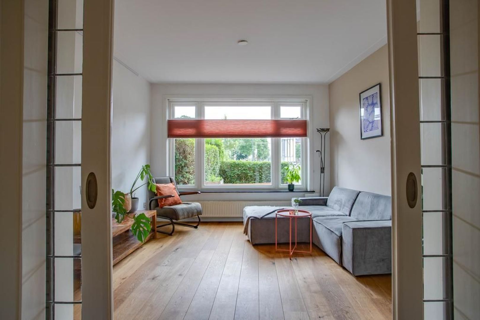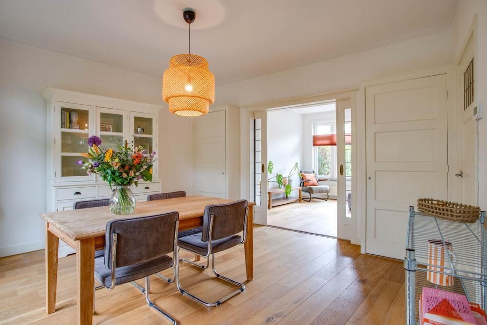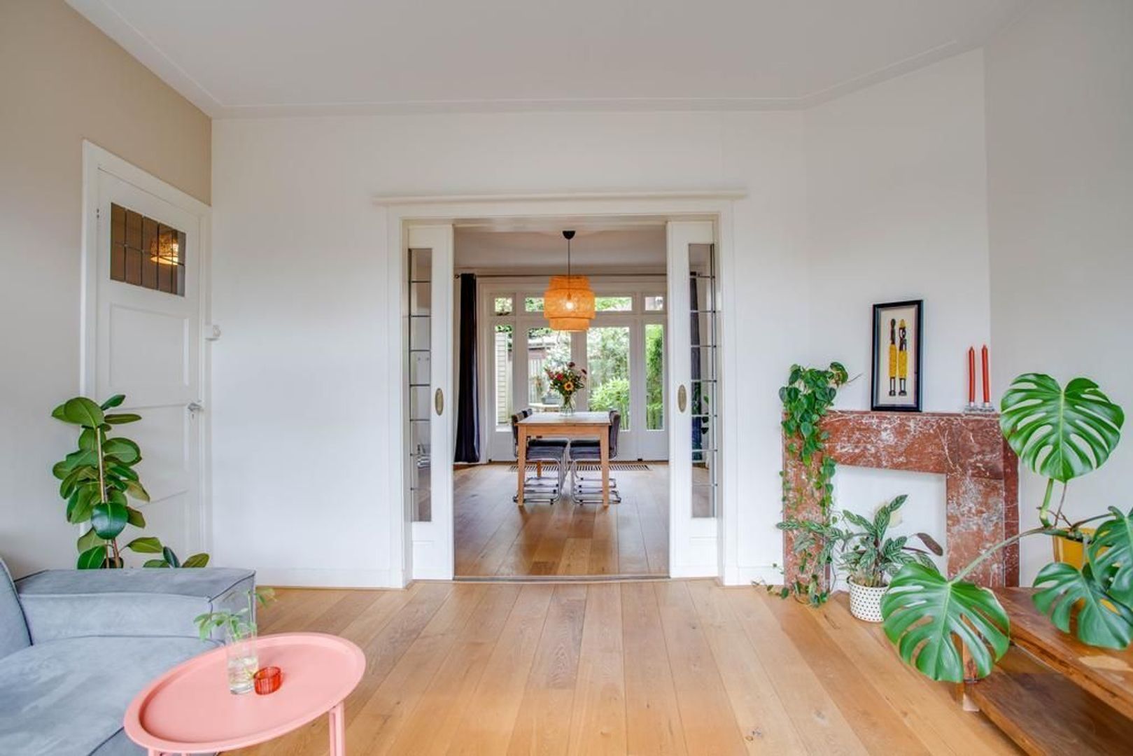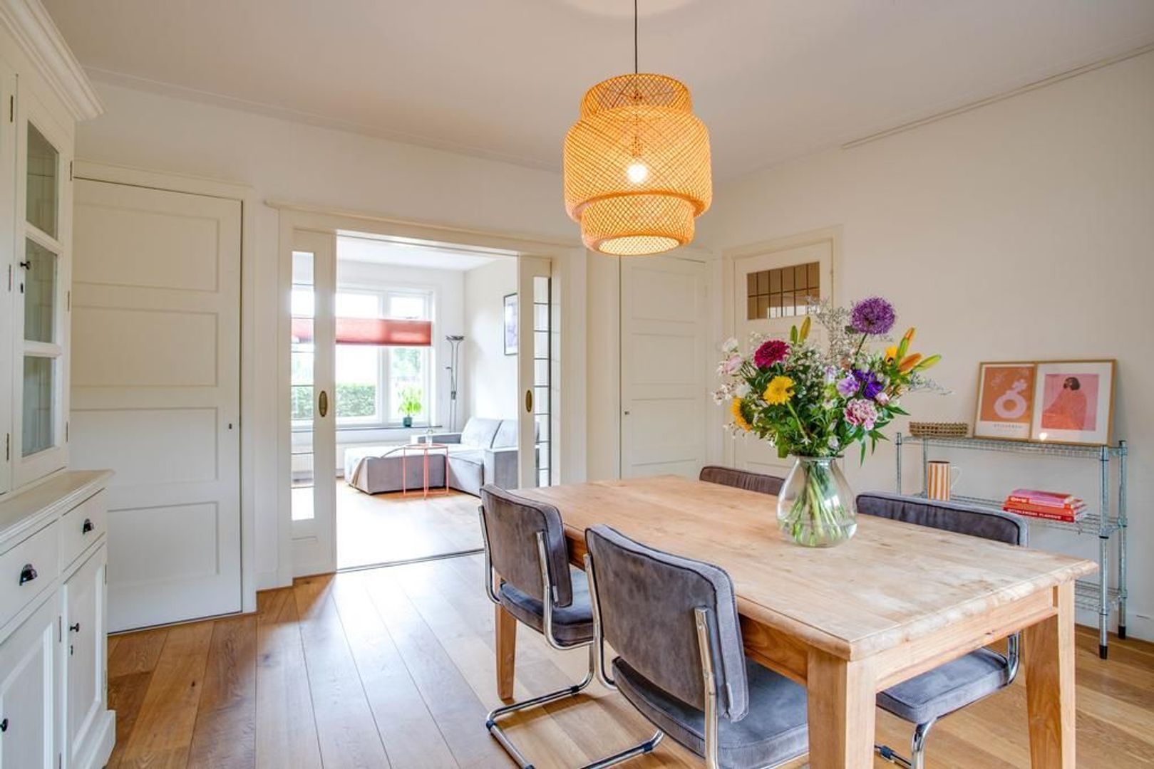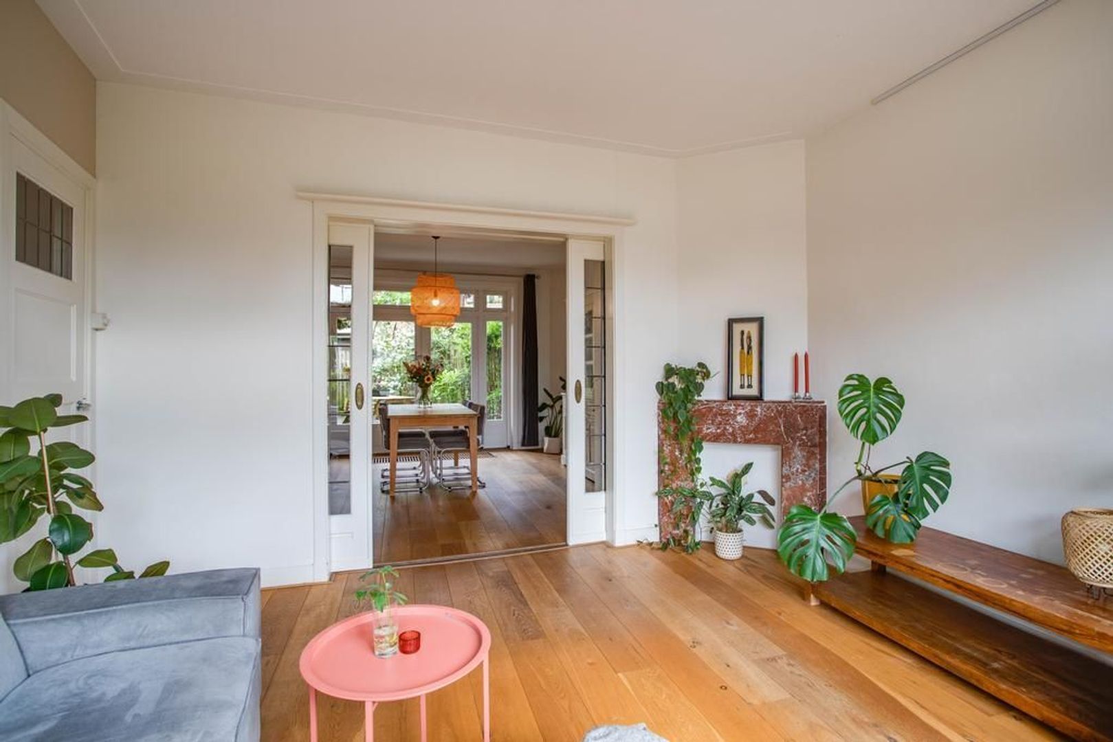 De woonkamer is aan de voorzijde van de woning gelegen en heeft dankzij het grote raam een fijne daglichtinval. Door de aanwezigheid van de originele schouw en de en-suite deuren met glas-in-lood, die toegang geven tot de eetkamer, heeft de woonkamer een sfeervolle uitstraling.