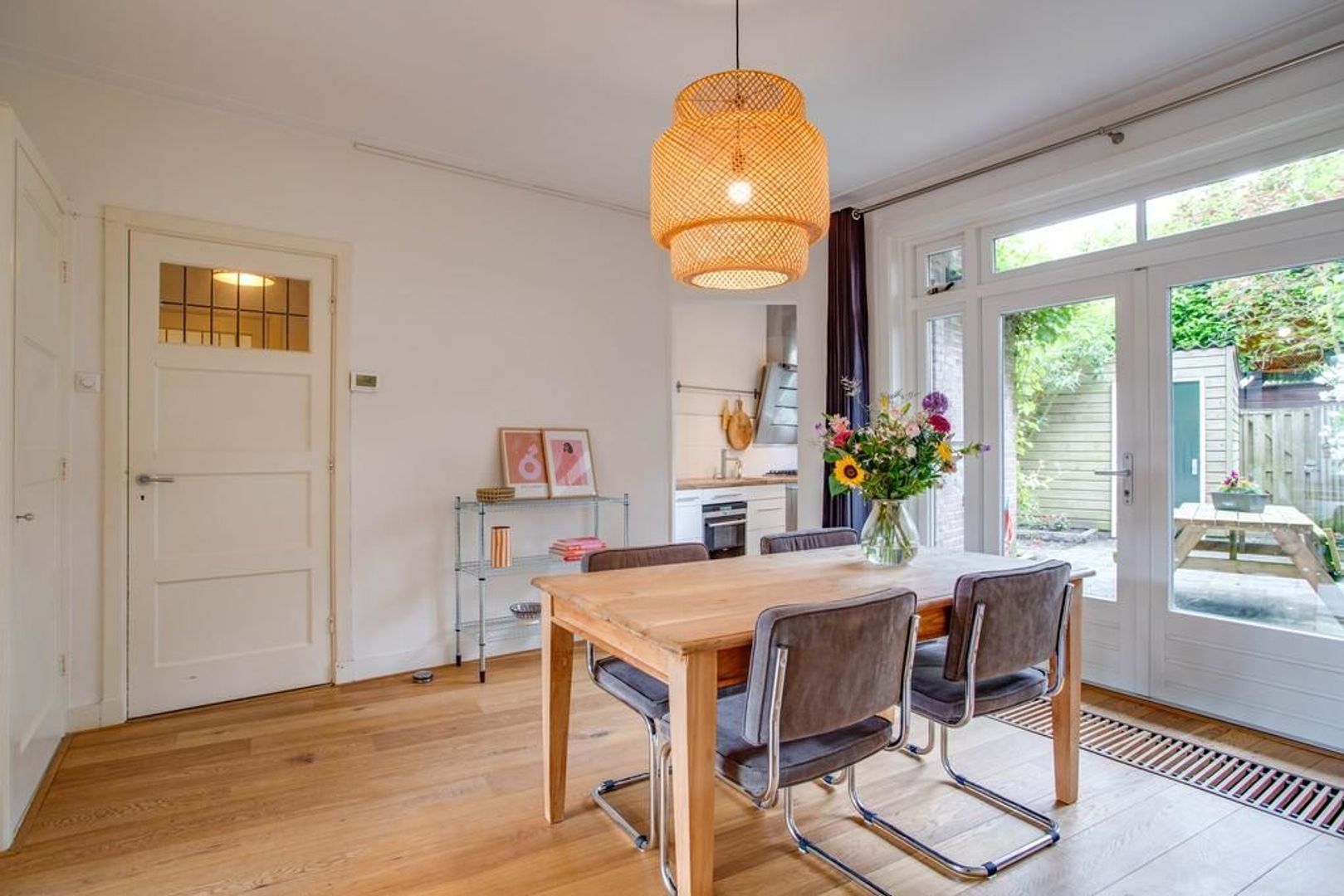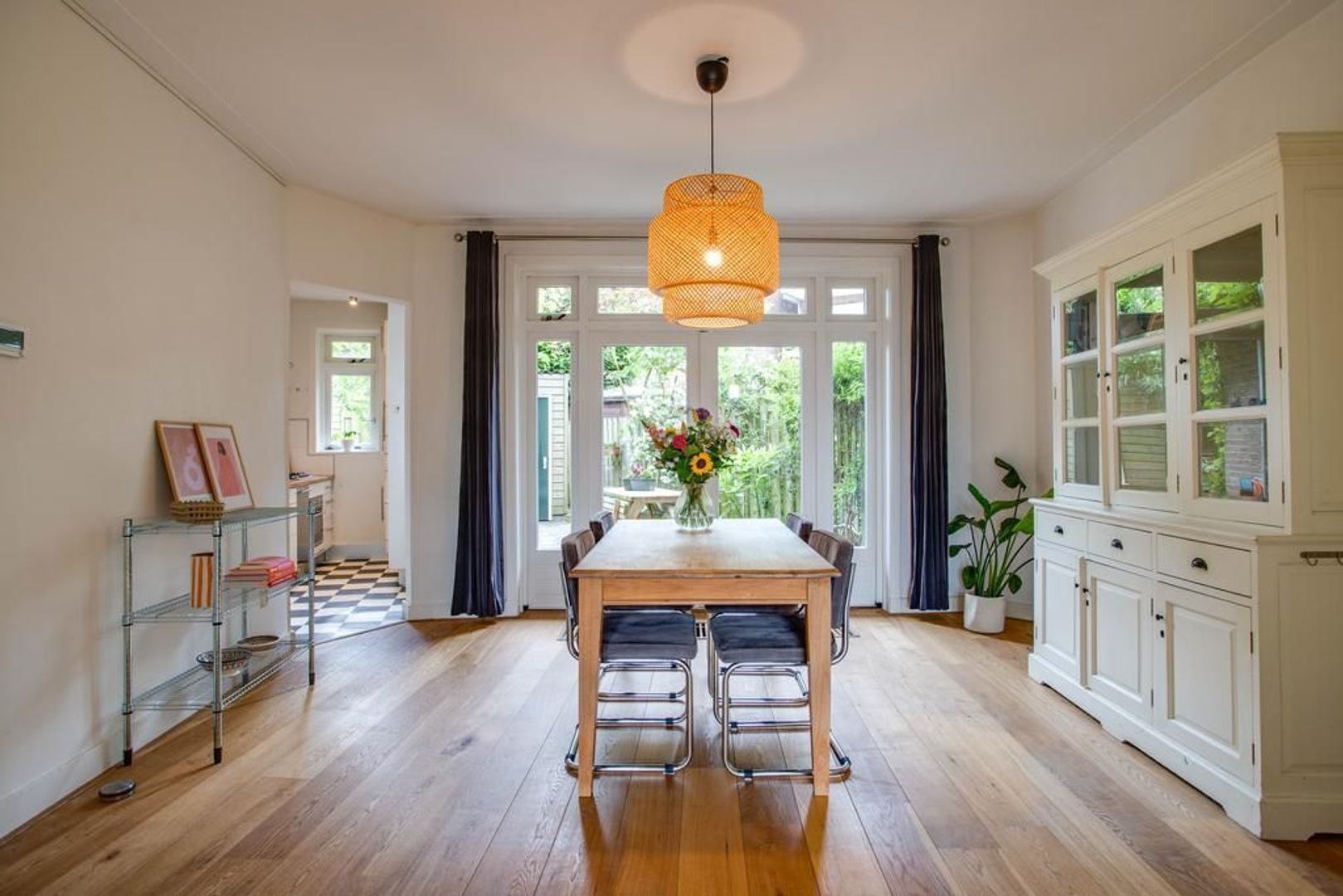 De eetkamer is aan de achterzijde van de woning gelegen. De woon- en eetkamer kenmerken zich door de verzorgde staat van afwerking, de ruimtes zijn voorzien van een nette wand- en vloerafwerking. De tuingerichte eetkamer is ruim opgezet en voorzien van twee praktische inbouwkasten. In de eetkamer is voldoende ruimte voor het creëren van een royale eethoek waar heerlijk aan gedineerd en geborreld kan worden.