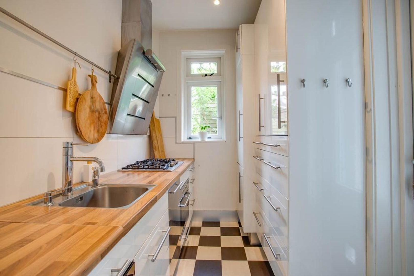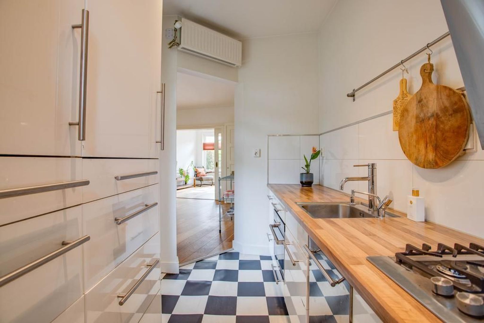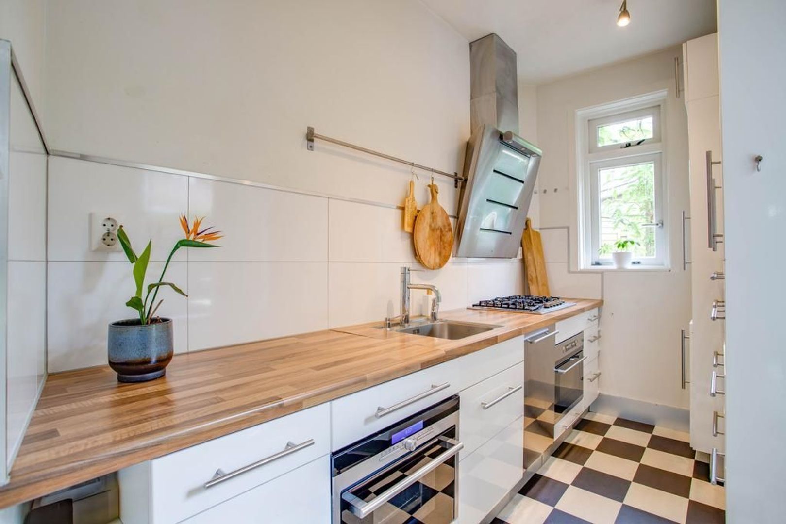De half open keuken is toegankelijk vanuit de eetkamer. De keuken heeft een verzorgde uitstraling en is voorzien van het volgende inbouwapparatuur: een 5-pitsgasfornuis, afzuigkap, combi-oven/ magnetron, stoomoven, koelkast, vriezer en Quooker kraan.